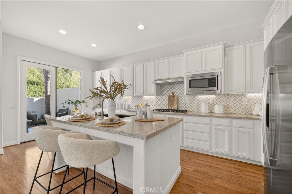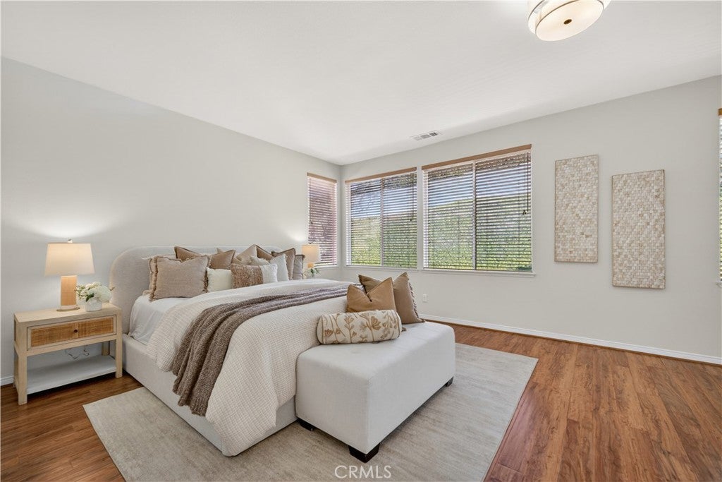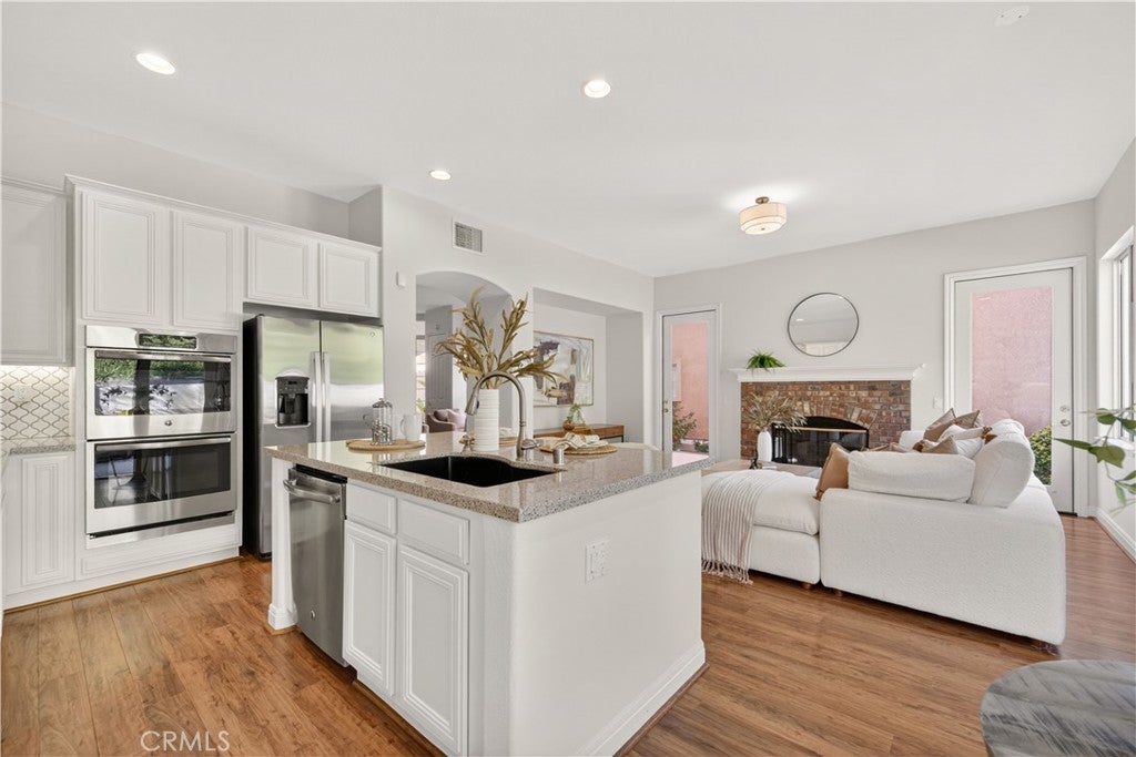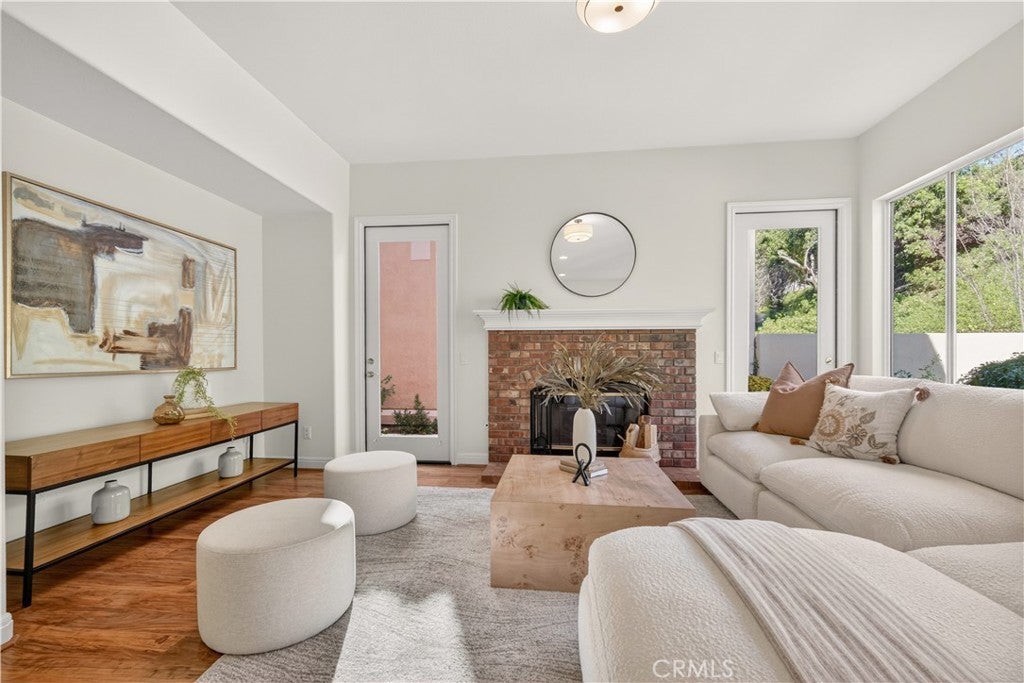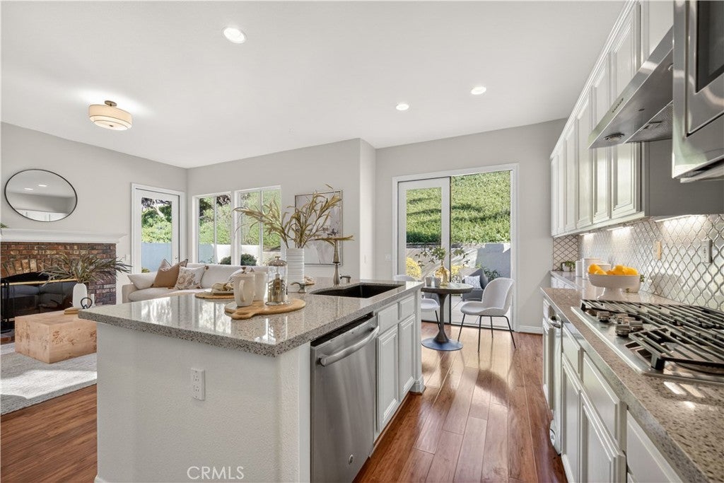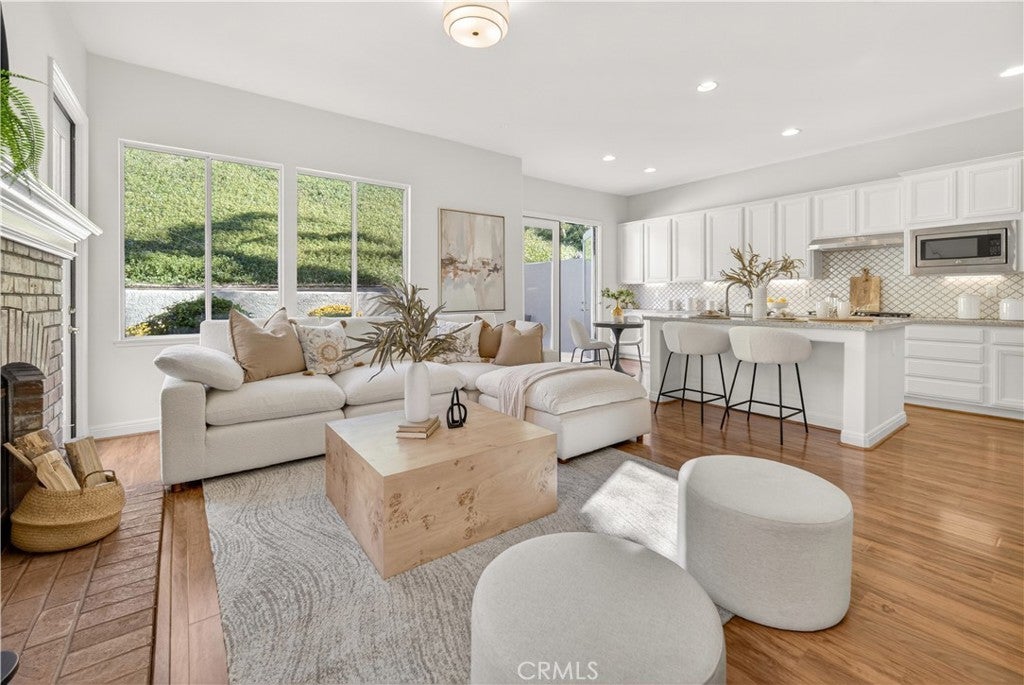 Set within prestigious Guard Gated Calabasas Park Estates, this rare Standard Pacific home blends modern upgrades with timeless design. Beyond two guard-gated entries and manicured grounds, the residence sits on a private hillside lot with fresh landscaping and convenient access to the community’s pool and spa. Inside, a soaring two-story foyer opens to a living room that flows into the dining room. Beyond this welcoming sequence, the family room and kitchen share an open-concept layout. A brick fireplace anchors the family room, while wide windows frame the hillside beyond. The updated kitchen features quartz countertops, an on-trend backsplash, GE stainless appliances, a black quartz sink and an island with extra seating. Pergo floors, new lighting fixtures and fresh paint throughout underscore the home’s move-in ready appeal, and the open sightlines between the family room and kitchen create a natural gathering space. Upstairs, the generous primary suite features a spa-like bath with a soaking tub, dual vanities and a walk-in closet. Three additional bedrooms and an upstairs laundry provide day-to-day convenience. Energy efficiency is enhanced by Tesla solar panels (leased), green certification and a high-efficiency 4-ton, 20-SEER AC unit. Fresh sod and landscaping complement the contemporary interior upgrades. Calabasas Park Estates offers guard-gated peace of mind, a community pool and spa, and beautifully maintained grounds. The property is served by the highly regarded Las Virgenes Unified School District. Close to shopping, dining, and the beaches of Malibu, this home reflects the best of the Southern California lifestyle.