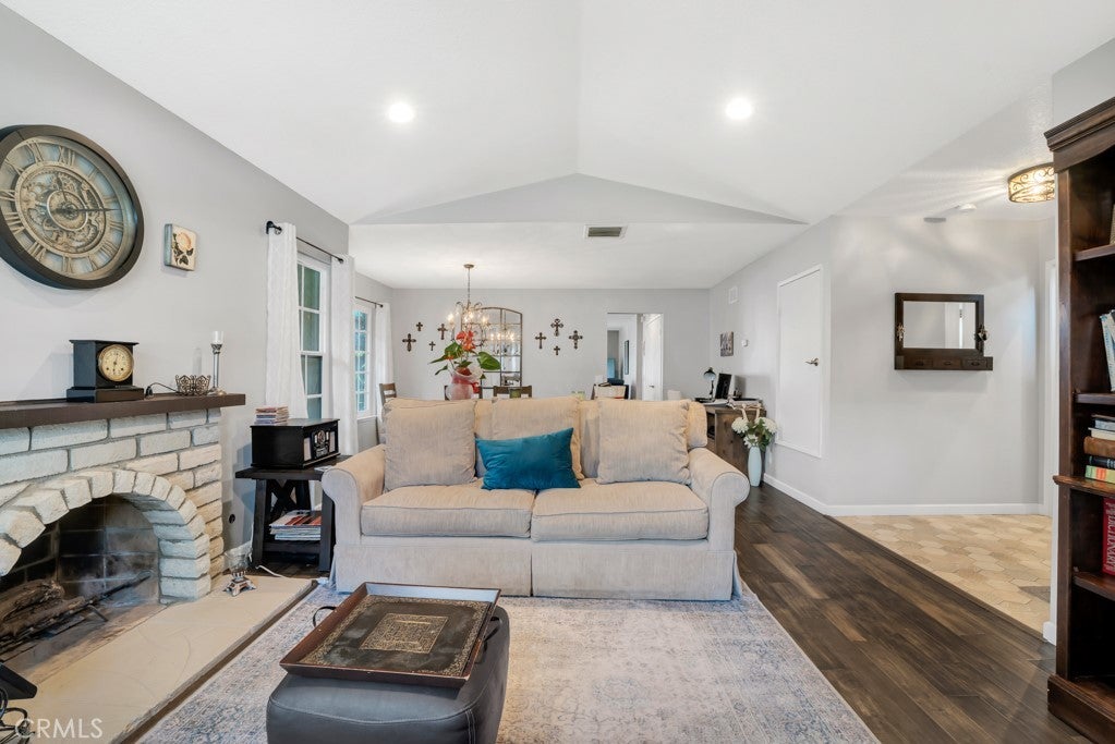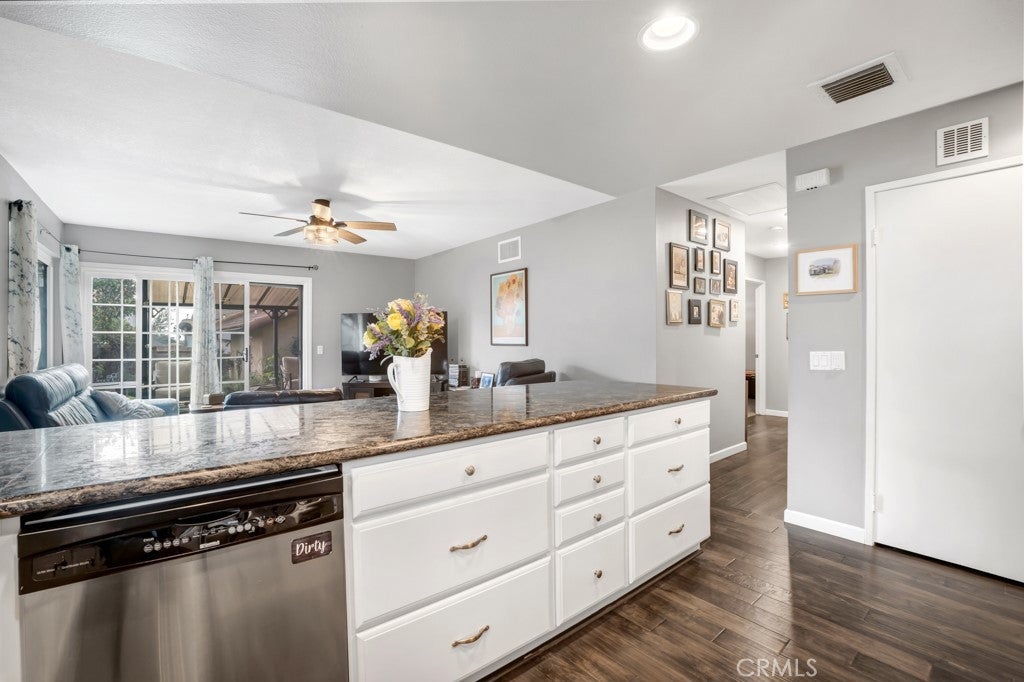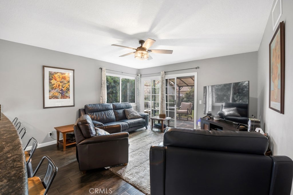 Welcome to a singles story Country View Villa home nestled in a double cul-de-sac in the beautiful Rancho Cascades community. The covered front porch leads to a formal entryway which opens to the living room and dining areas that feature engineered hardwood floors and a wood burning fireplace with gas starter for ease of use. Beyond the dining area is the updated kitchen with granite counters and a breakfast bar which opens to the family room. The family bedrooms are to the right and there is the convenience of a laundry closet in the hall with washer and dryer. The primary suite is at the front of the house with its own patio. It has a remodeled private bath with double sinks and a large walk in shower. Outside the family room, at the rear of the house is a wonderful patio with a new cover, that expands the living space and has lush landscaping to enjoy. The yard has a dog run and there is a detached 2 car garage with alley access. The zero lot line concept allows for maximum use of the property for building size and lot utility.
