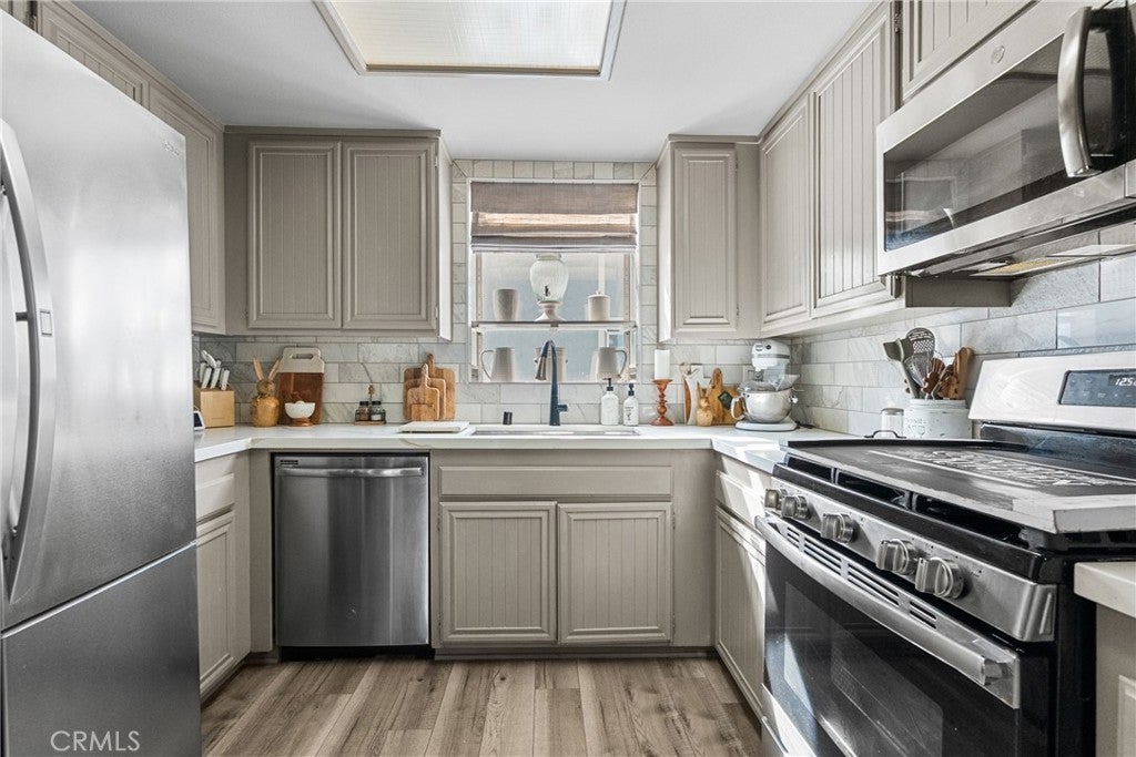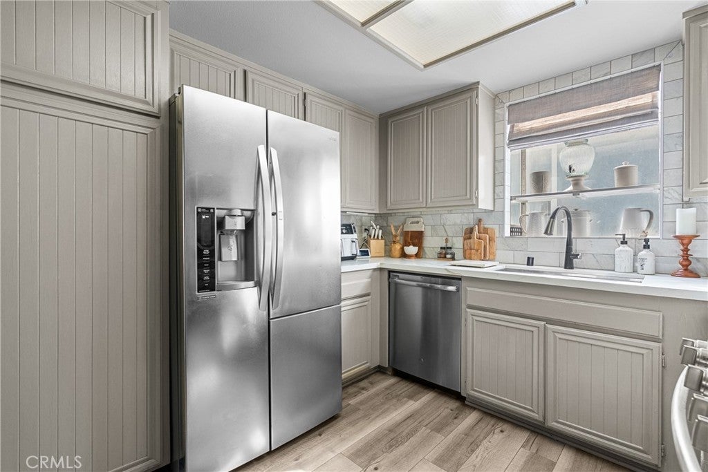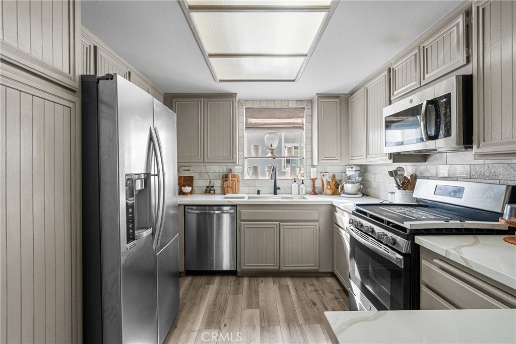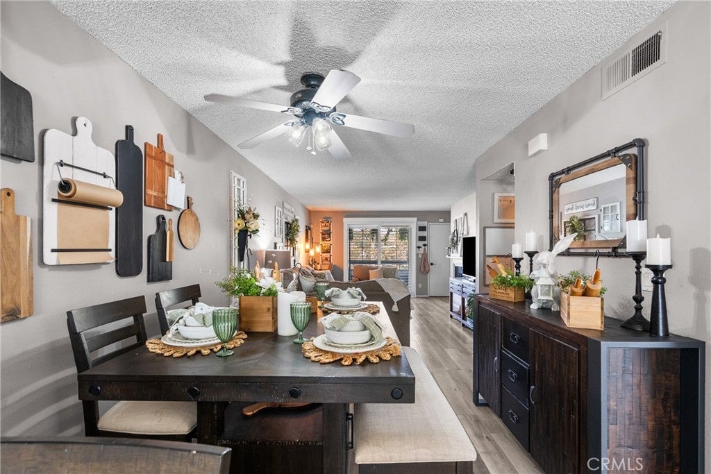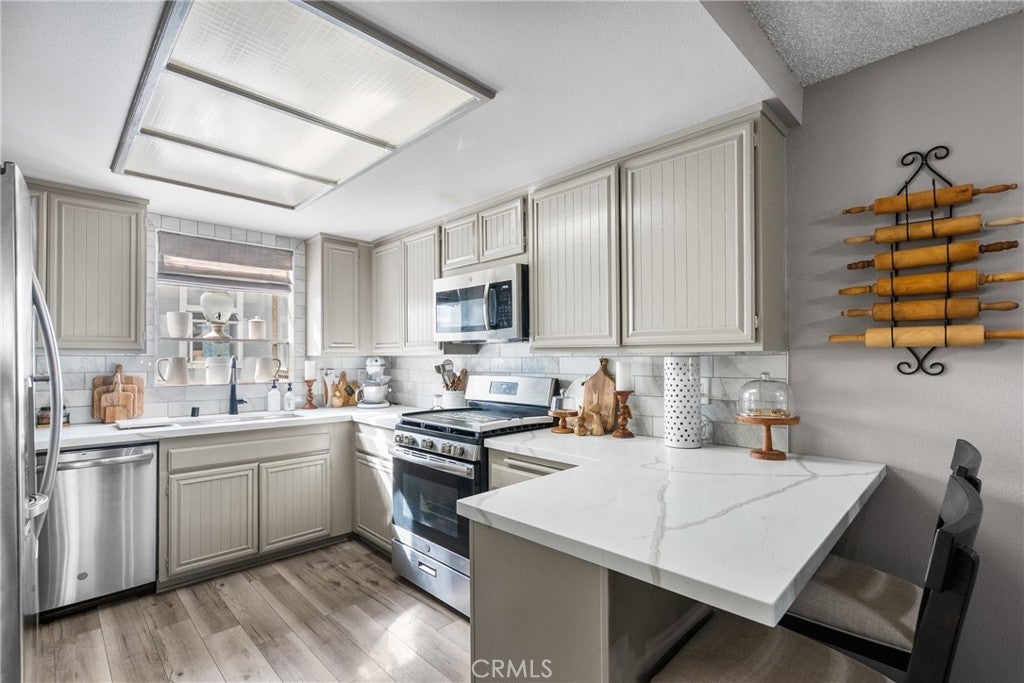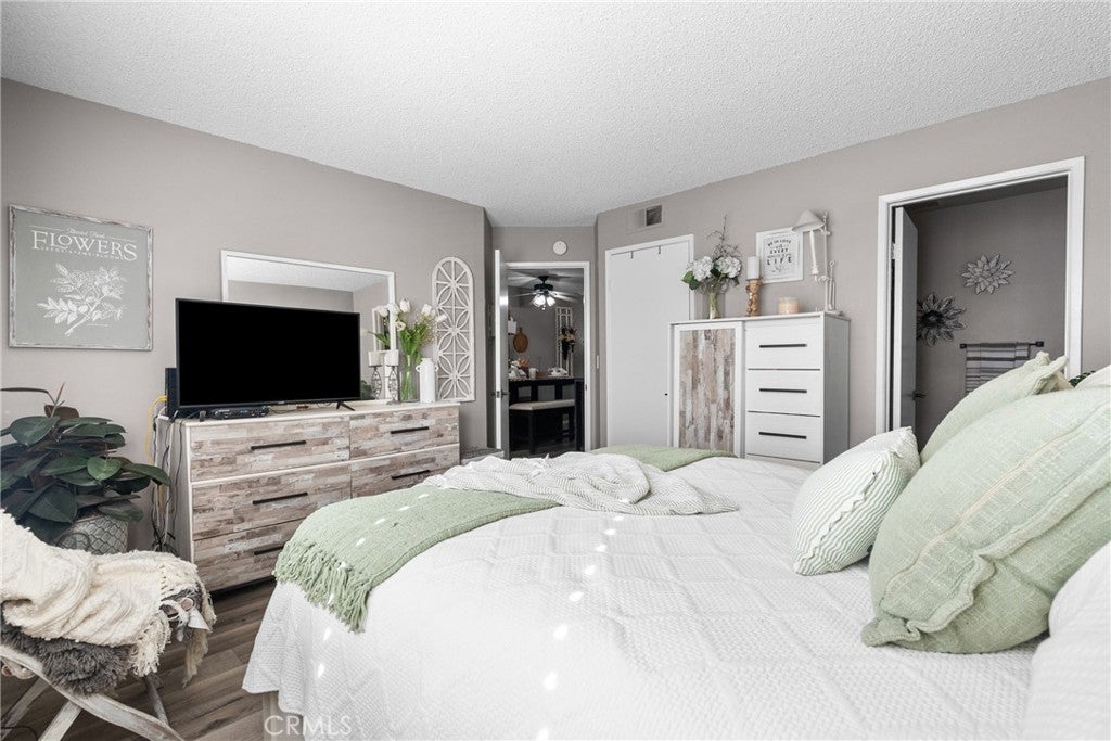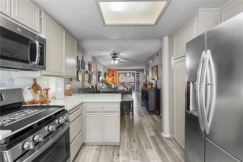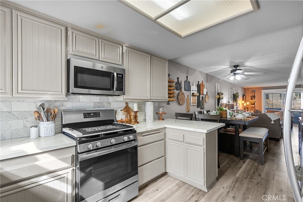 This inviting 2-bedroom, 2-bath condo offers comfort, style, and a wonderful community setting. Inside, you’ll find laminate wood flooring in the main living areas and tile flooring in the bathrooms, creating a warm and cohesive feel throughout. Plantation shutters add timeless charm and privacy, while upgraded lighting enhances the bright, airy spaces. The kitchen has been beautifully upgraded with quartz countertops, a porcelain tile backsplash, stainless steel appliances, and modern finishes, making it both functional and stylish. The washer, dryer, and refrigerator are included for added convenience. An indoor laundry area adds ease to everyday living. Both bathrooms have been upgraded with contemporary finishes, including a dual vanity in the primary bathroom that offers plenty of space and comfort. The well-designed layout provides a natural flow between the living, dining, and kitchen areas, ideal for relaxing or entertaining. Additional features include a 2-car garage and access to exceptional community amenities, including walking trails, three pools, tennis courts, gazebos, and a beautifully maintained greenbelt that creates a peaceful, park-like atmosphere. Conveniently located close to shopping, dining, and everyday essentials, with easy access to commuter freeways, this home offers the perfect blend of comfort, convenience, and lifestyle. A wonderful opportunity to enjoy low-maintenance living in a welcoming community—this is one you won’t want to miss.