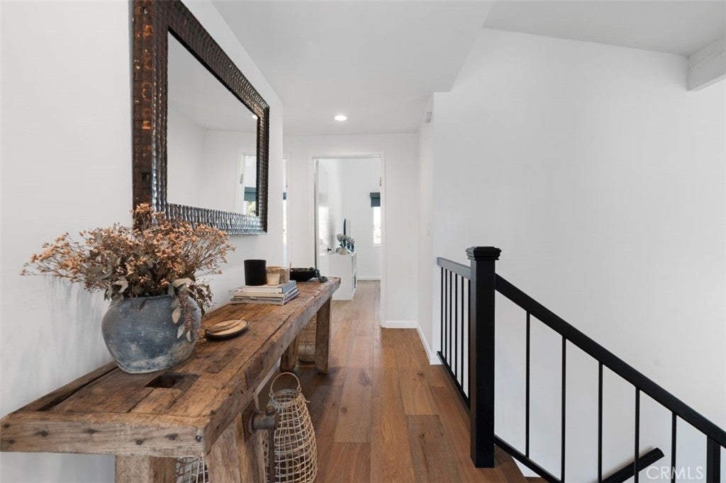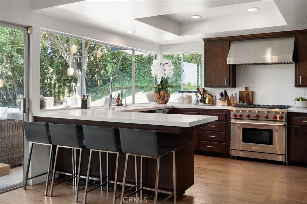 Nestled in the picturesque hills of Tarzana in the Santa Monica mountains, this stunning three bedroom, three bath home offers a perfect blend of elegance and comfort. As you step through the double doors, you’re greeted by a warm and inviting atmosphere that immediately feels like home. The expansive living room features a cozy fireplace and soaring vaulted ceilings, creating an open and airy space perfect for relaxation and entertaining. The heart of this home is the chef's gourmet kitchen, complete with brand-new quartz countertops, custom floating shelves, a breakfast bar, and top-of-the-line stainless steel appliances, including a Wolf oven and range. The kitchen's functionality is matched by its beauty, with three ovens providing ample cooking space for any culinary enthusiast. Throughout the home, gorgeous French oak wide plank floors add a touch of sophistication. Adjacent to the kitchen is a charming dining room, framed by picture windows that offer stunning views of the beautifully landscaped yard and beyond. Downstairs, an inviting family room with a bar creates a perfect spot for casual gatherings, while a recently remodeled bathroom adds convenience and style. Upstairs, the primary suite is a true retreat, featuring vaulted ceilings, a private balcony, and ample space to unwind. The secondary bedrooms are equally impressive, each offering incredible views that capture the beauty of the surrounding area and overlook the waterhole on the newly renovated Braemar Golf Course. The outdoor space is nothing short of spectacular, with a park-like yard that includes a lush grassy area, a sparkling pool, a relaxing Jacuzzi, breathtaking views, and the twinkling lights of the valley below. This home is a sanctuary of comfort and luxury, offering an unparalleled living experience in one of Tarzana’s most sought-after locations.