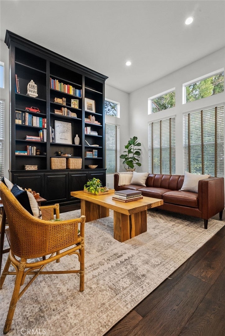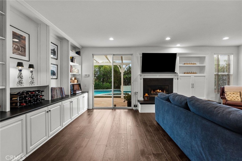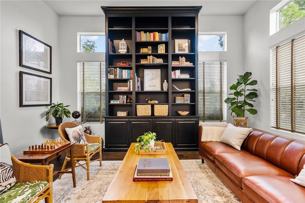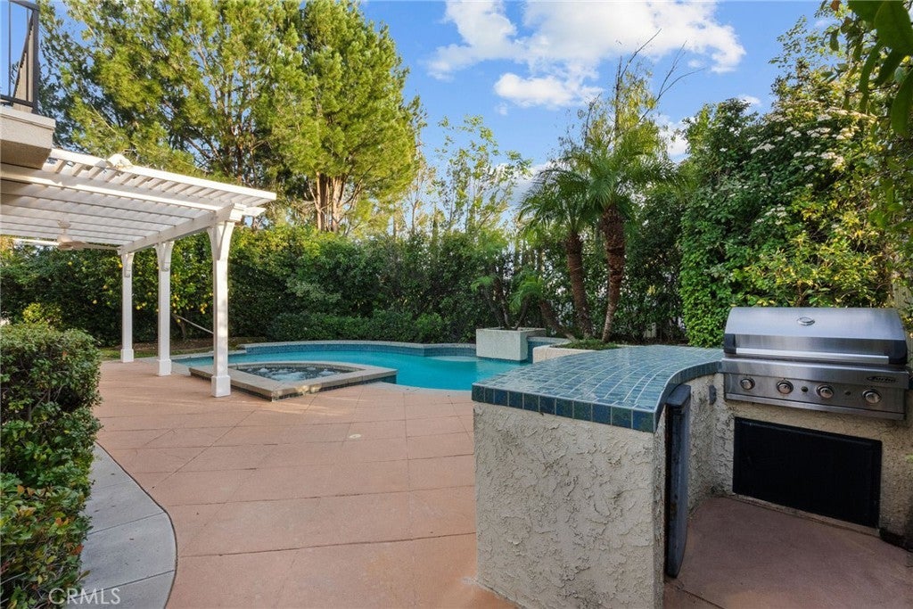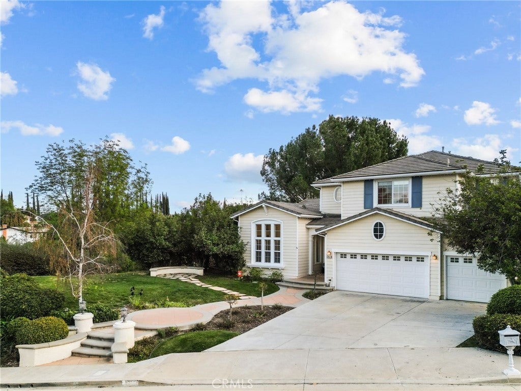 Best-priced home per square foot in Monte Vista, offering exceptional value. Nothing has been overlooked in this Cape Cod inspired residence located within the prestigious Monte Vista community. Offering 3,391 square feet, 5 bedrooms, and 5 total bathrooms, the home reflects disciplined upgrades and a layout designed for long-term living. The property features exceptional privacy with only 1 direct neighboring home, open space along one side, and unobstructed privacy across. A grand entry opens to a formal living room with floor-to-ceiling built-in shelving and a separate formal dining room. The kitchen is thoughtfully designed with stainless steel appliances, a walk-in pantry, expansive center island, and a dedicated dining area that functions as a true gathering space, opening directly to the family room with a wood-burning fireplace and gas hookup option. Two bedrooms are positioned on the main level and share a Jack-and-Jill bathroom, along with a separate powder room. Upstairs, three bedrooms are en suite, along with a spacious laundry room featuring ample organizational storage. The primary suite features a sitting area, private balcony, walk-in closet with built-ins, and a bathroom with dual sinks, shower, and sunken tub. A spacious secondary en suite and a functional, spacious third en suite bedroom with defined areas suitable for additional recreational use complete the upper level. The backyard is private and spacious, featuring a pool and spa with new saltwater equipment and smart LED lighting, built-in barbecue, covered pergola, and mature landscaping with fruit trees surrounding the property. Recent improvements include solid hardwood flooring, updated lighting throughout, dual HVAC systems with new compressors and smart home features, built-in organizers in every closet, and a three-car garage with extensive storage cabinetry. Located in a 24/7 patrolled community within a top-rated school district and convenient to world-class dining and shopping, including the LA Rams practice facility, The Commons, Westfield Topanga, and Topanga Social. Monte Vista is distinguished by low turnover, long-term ownership, and a close-knit community defined by long-term ownership and neighborhood standards.