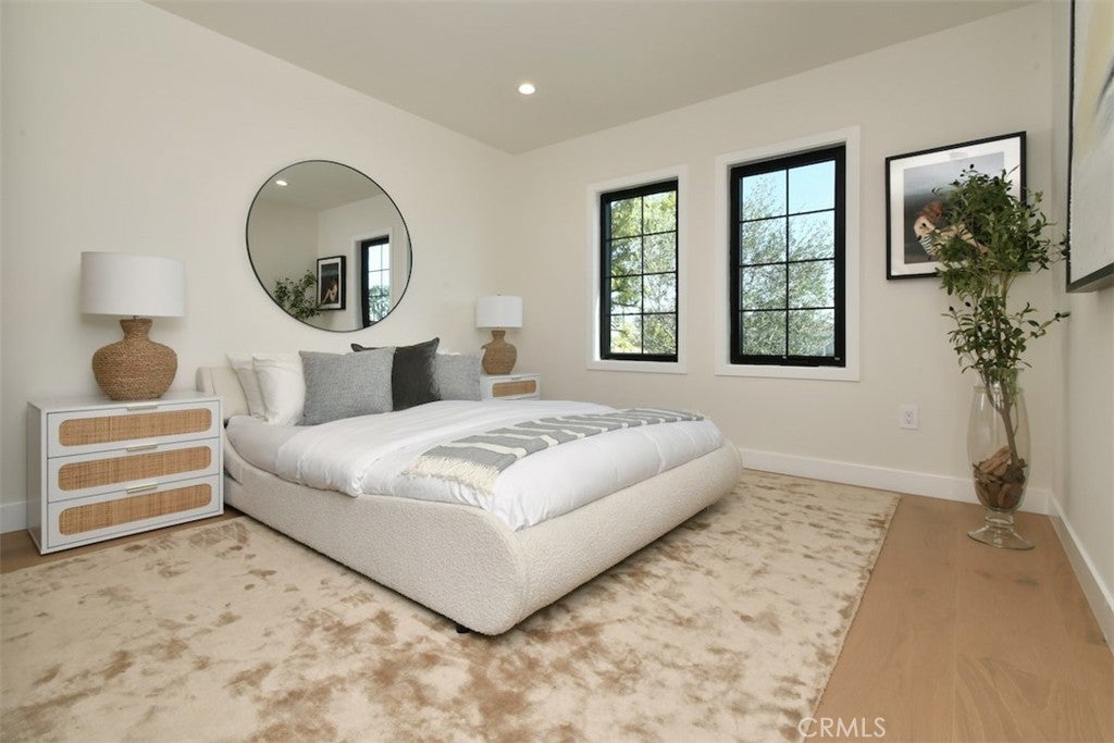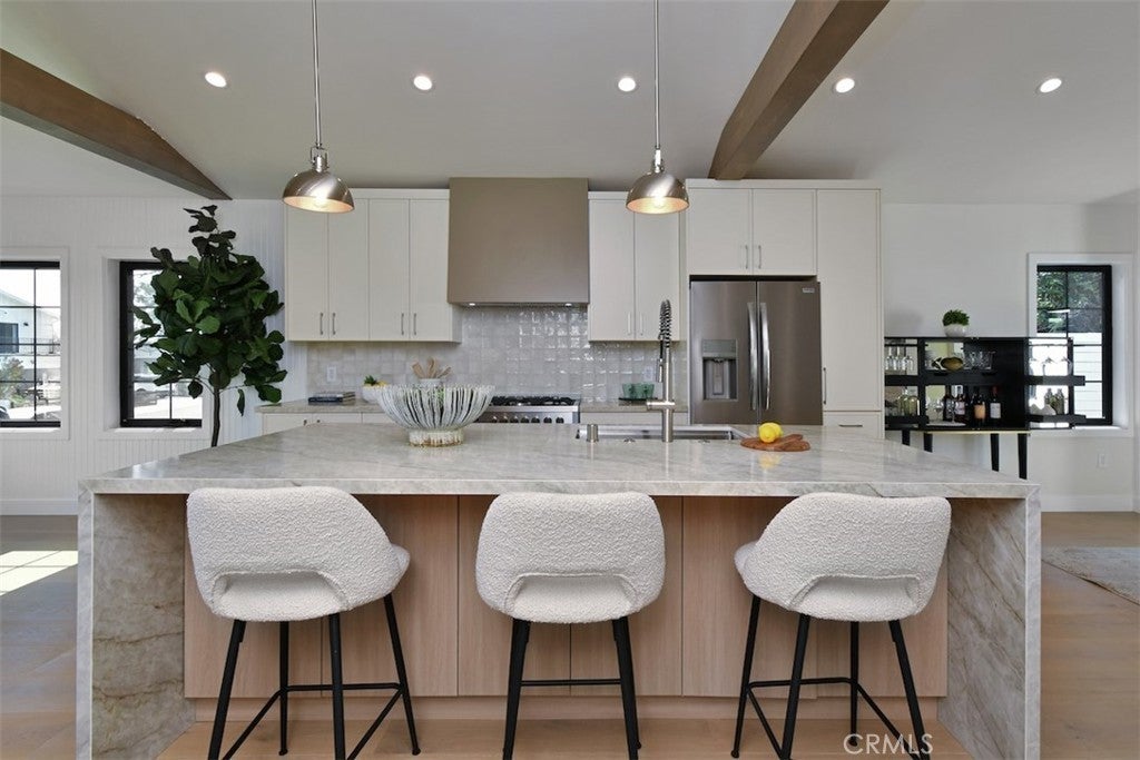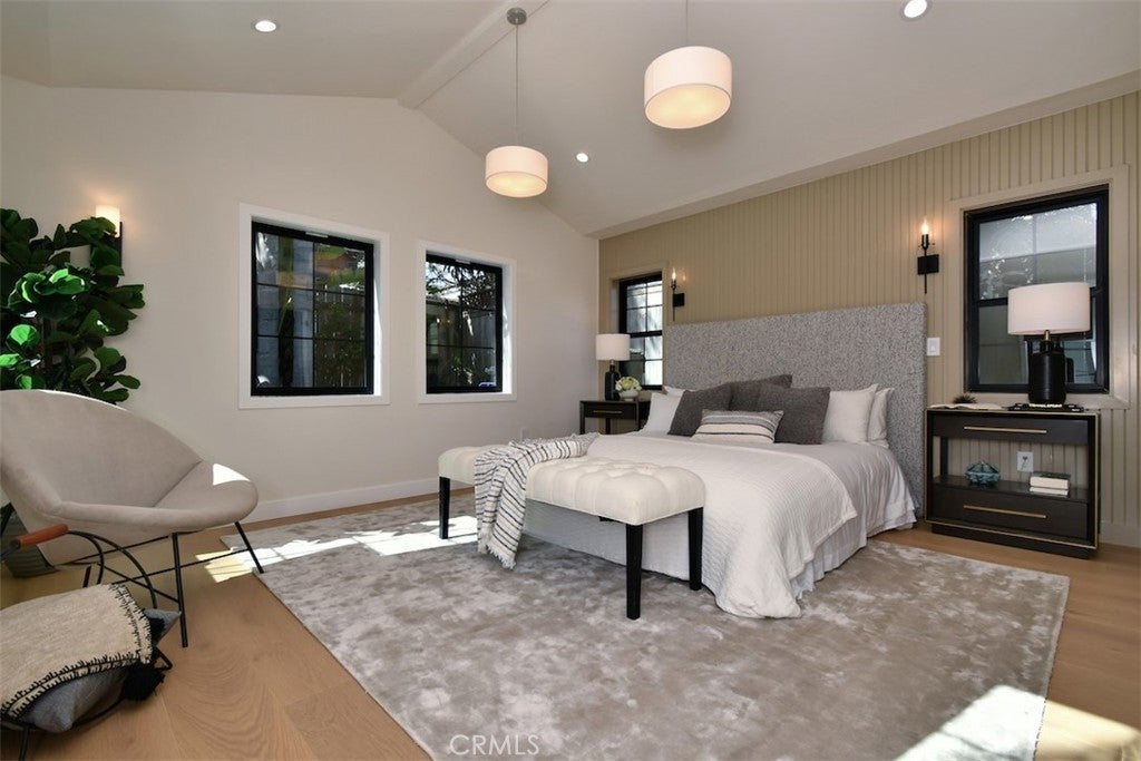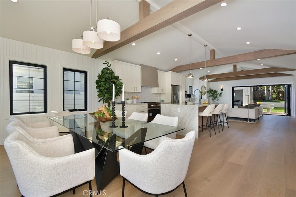 Perched above the street, from the moment you approach, the home commands attention, located in the desirable neighborhood of WESTPORT HEIGHTS in Westchester. Masterfully expanded and reimagined with warm contemporary design and modern amenities that offers a luxurious yet relaxed lifestyle. The interior showcases a foyer, an elegant powder room adding to the home's sophisticated appeal, an open layout of expansive living and dining with beamed vaulted ceilings that elevate the public entertaining spaces, recessed lights, several windows that bring in abundance of natural light. The formal dining room, positioned off of the entry, is a welcoming place for hosting. The chef's kitchen, a true centerpiece, is equipped with sleek cabinetry and anchored by an island with seating, quartz countertops, and a large pantry. Underfoot the space features wide plank wood flooring throughout. This newly rebuilt home features 4 bedrooms, 3.5 bathrooms, approximately 2227 sq ft of thoughtfully designed living space. Primary suite is a serene retreat, situated at the back, has vaulted ceilings, many windows for natural light, includes a walk-in closet, a luxurious spa inspired bathroom with dual vanities, soaking tub and walk in shower. A Jr ensuite, at the front, is spacious and bright with its own beautiful bathroom with shower. Two generously sized secondary bedrooms share a beautiful, light & bright, full bathroom with tub. The inviting family room with beautiful fireplace is spacious, with folding glass doors that open to the back yard to maximize the desirable SoCal indoor-outdoor lifestyle ideal for both entertaining and everyday living. Laundry room with cabinetry and stackable W&D is tucked in the hallway. The two car garage of 360 sq ft ( not part of total sq ft) has been remodeled and dry walled, new roll up door, recessed lights, new window, can be comfortably be used  as an office, media room or studio. The wide, long & gated driveway can easily park 2 or more cars. This immaculate home is designed for modern living, accentuated by soothing colors and clean lines, a perfect place to retreat every day from the chaos of busy routines, and call home for many years to come. Not to be missed!