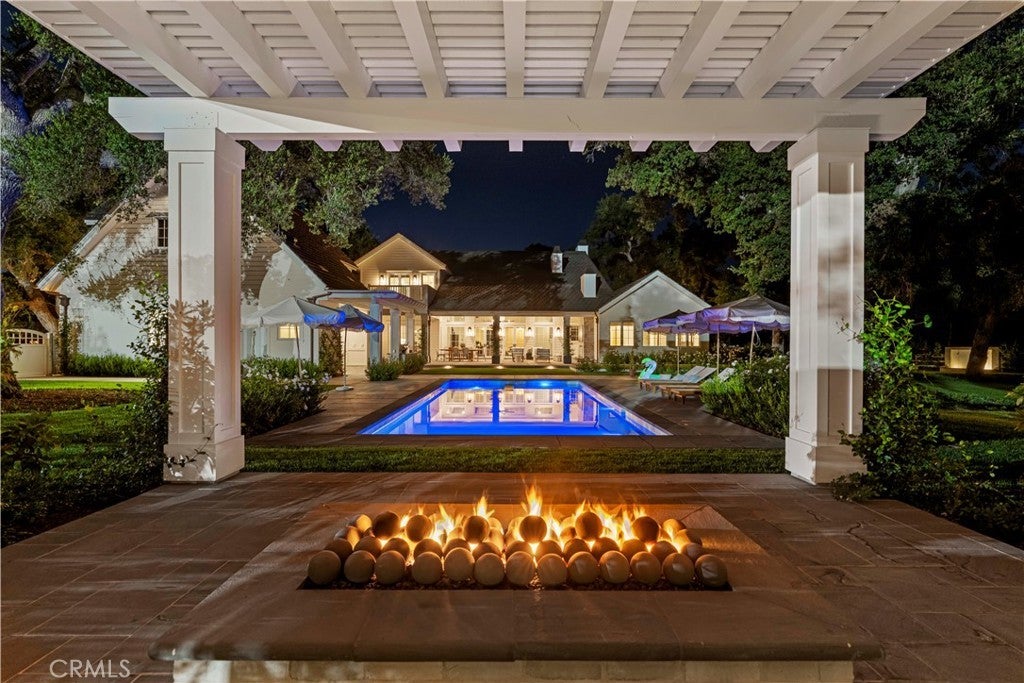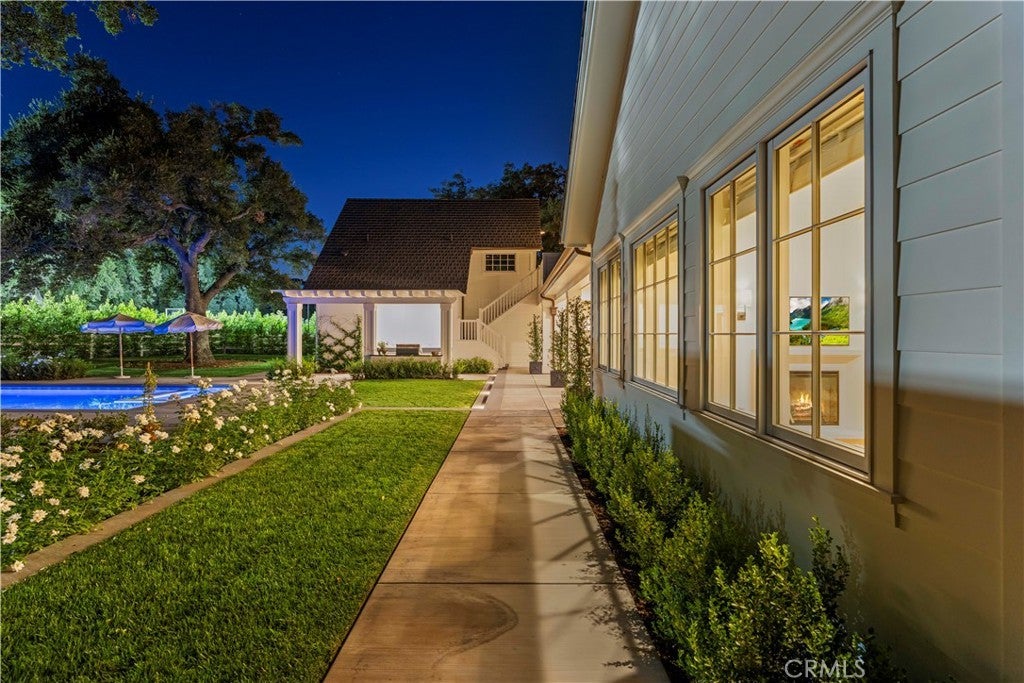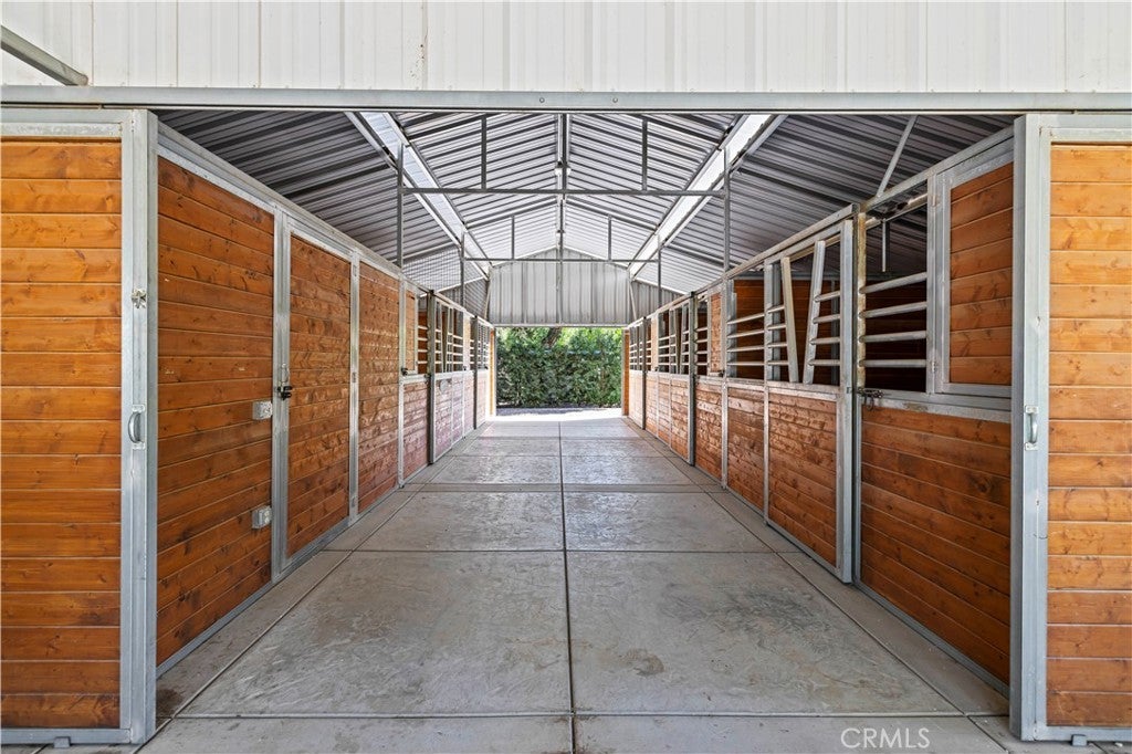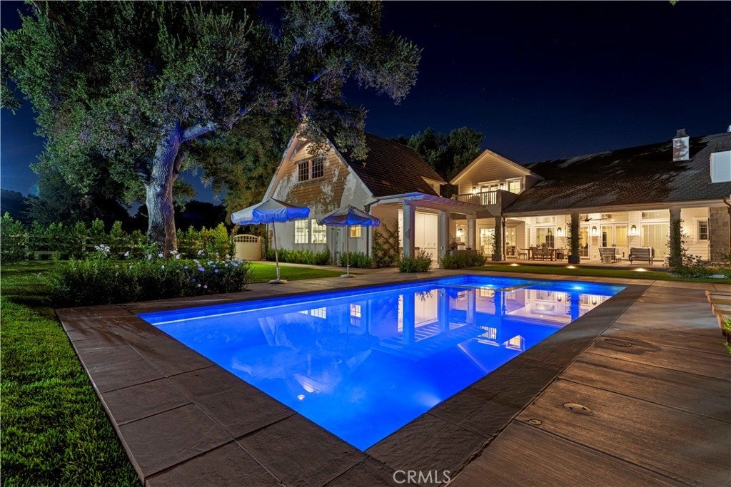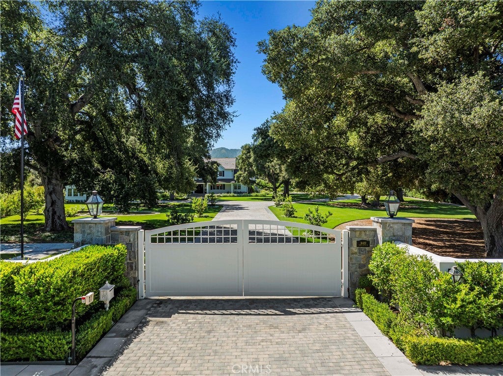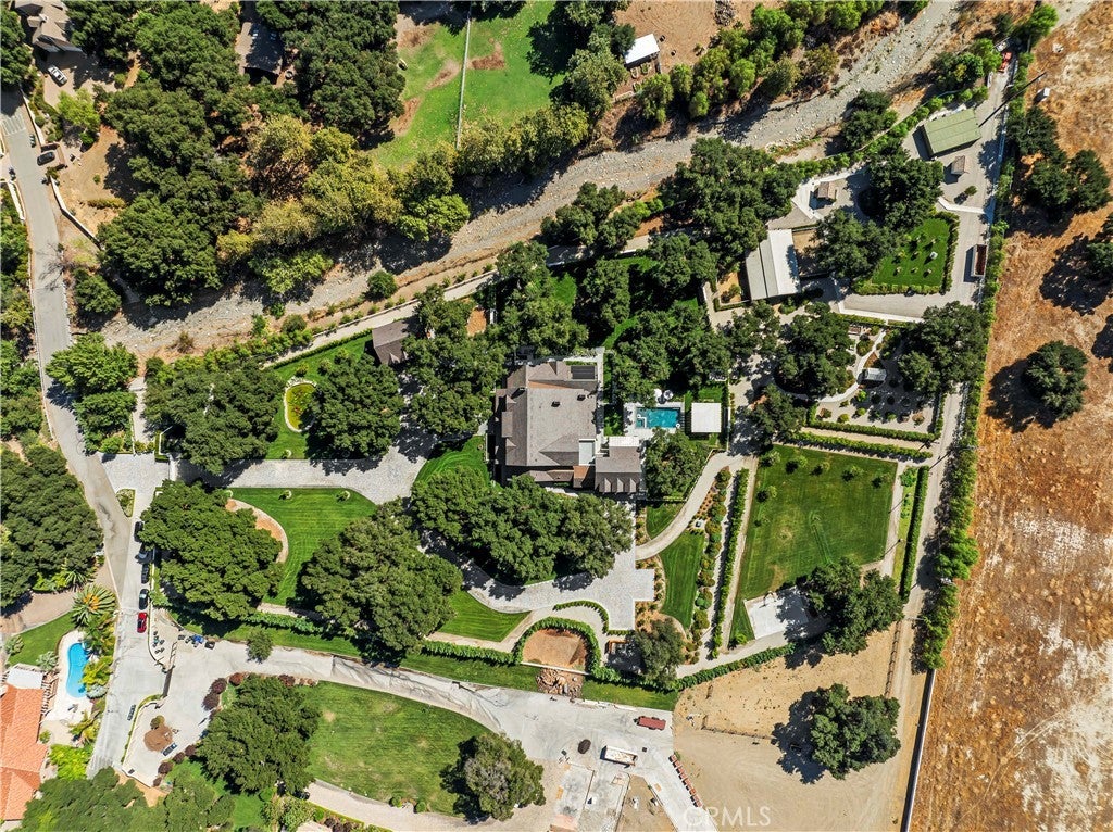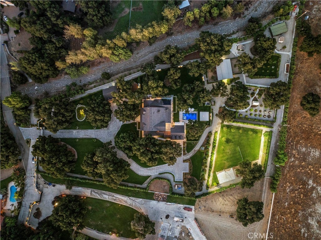 Tucked behind private gates and approached by a long paver stone driveway, this truly magnificent Sand Canyon estate spans approximately 7,815 sqft across five exquisitely manicured acres. The 6,800 sqft main residence is complemented by a spacious 653 sqft ADU above the attached three car garage, along with a separate two car carriage garage connected to a 362 square foot gym or office. Inside, soaring ceilings, coffered detailing, custom wall paneling, rich wood accents, and wide plank oak floors set a warm yet grand tone, anchored by striking stone fireplaces and reclaimed beams showcased in the family room. The home flows effortlessly into a showpiece kitchen finished in Calacatta marble with a statement Lacanche range, Thermador appliances, handmade tile, a butler’s pantry, wine refrigeration, seamless custom cabinetry, and a large walk-in pantry with two additional refrigerators. The main level features both the expansive primary bedroom suite and an additional downstairs bedroom with a full bath, while upstairs offers three guest bedrooms each with their own ensuite baths, a spacious loft, and beautifully appointed bathrooms finished in Carrera marble. The primary suite is a true retreat with its own fireplace, breathtaking estate views, and a spa inspired bath featuring herringbone marble floors, a luxurious shower, and a stunning standalone soaking tub. Entertaining continues with a refined dining room with classic wainscoting, a dedicated movie theater with insulated soundproofed walls, and space beneath the stairs that could offer a potential wine cellar. The ADU provides private guest accommodations with tall ceilings, kitchenette, separate HVAC, studio style living, and marble shower. Outdoors, the estate unfolds with stone patios and walkways, copper lanterns and gutters, a stunning resort style pool with deck jets and spa, a tranquil pond with multiple water features for added ambiance, an outdoor shower, a fully equipped outdoor kitchen, covered entertaining areas with heaters and oversized fan, 48 heritage oak trees, a stone encased raised bed garden with greenhouse, full perimeter snake fencing, manicured lawns, professional lighting, a five stall barn with turnouts, sport courts, sauna, and generous storage, all powered by a 600 amp electrical panel, paid off solar, public water for the home, and a private irrigation well, firmly positioning this exceptional property among the most premier estates Santa Clarita has to offer.