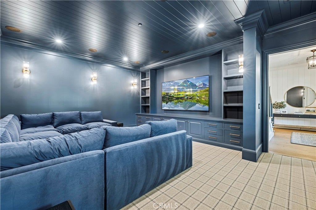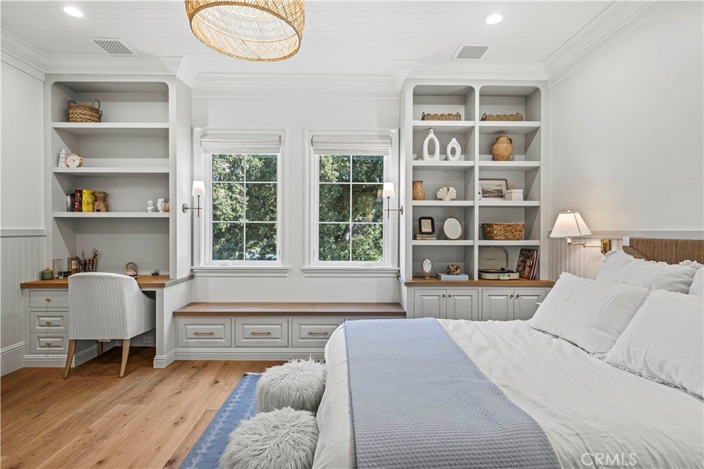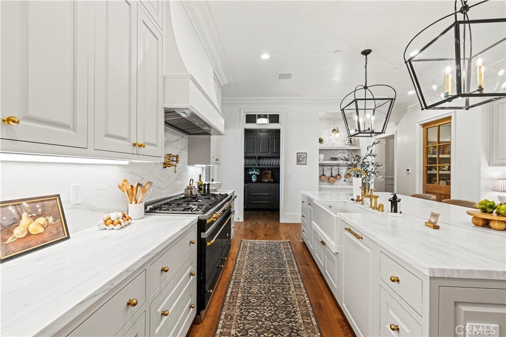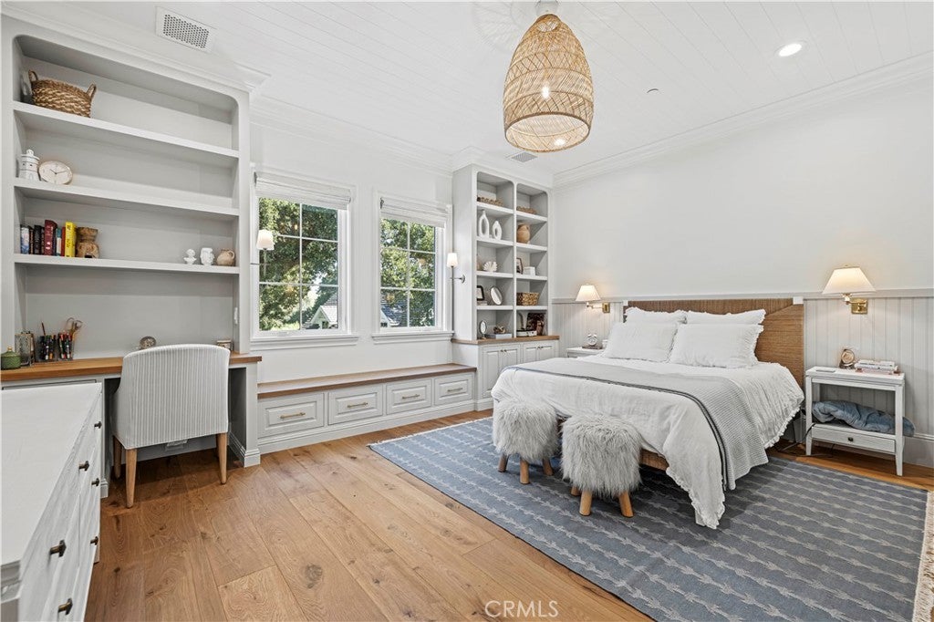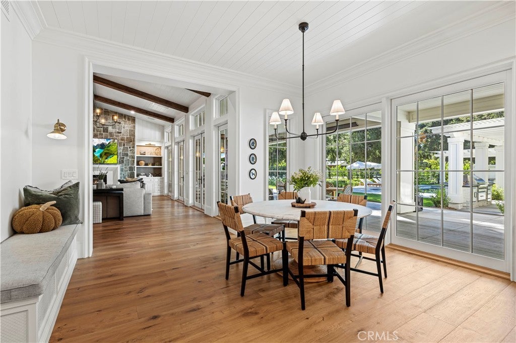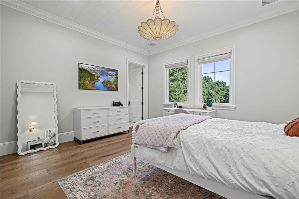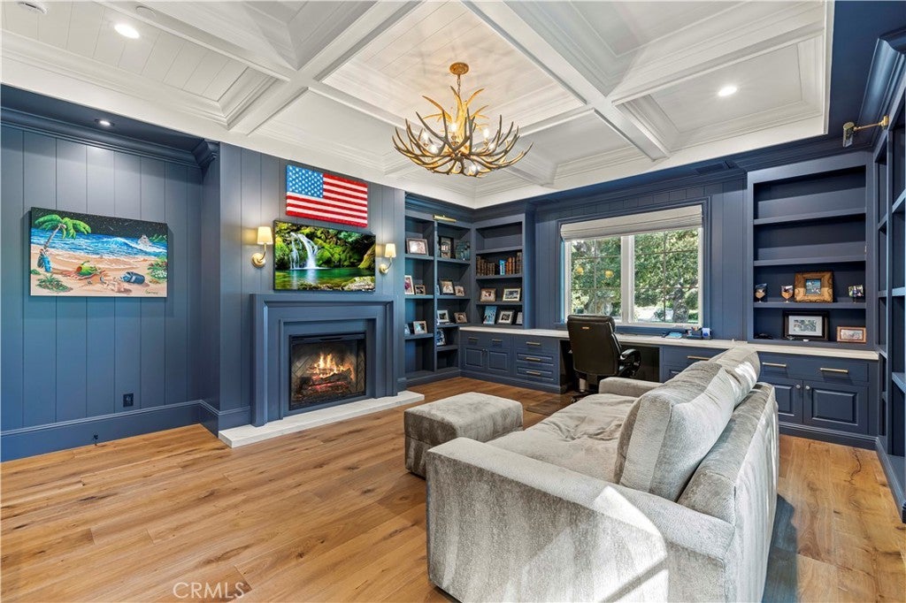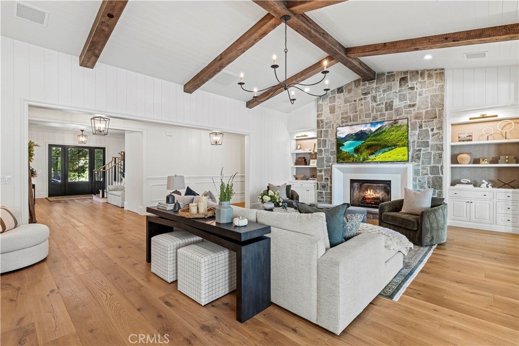 Tucked behind private gates and approached by a long paver stone driveway, this truly magnificent Sand Canyon estate spans approximately 7,815 sqft across five exquisitely manicured acres. The 6,800 sqft main residence is complemented by a spacious 653 sqft ADU above the attached three car garage, along with a separate two car carriage garage connected to a 362 square foot gym or office. Inside, soaring ceilings, coffered detailing, custom wall paneling, rich wood accents, and wide plank oak floors set a warm yet grand tone, anchored by striking stone fireplaces and reclaimed beams showcased in the family room. The home flows effortlessly into a showpiece kitchen finished in Calacatta marble with a statement Lacanche range, Thermador appliances, handmade tile, a butler’s pantry, wine refrigeration, seamless custom cabinetry, and a large walk-in pantry with two additional refrigerators. The main level features both the expansive primary bedroom suite and an additional downstairs bedroom with a full bath, while upstairs offers three guest bedrooms each with their own ensuite baths, a spacious loft, and beautifully appointed bathrooms finished in Carrera marble. The primary suite is a true retreat with its own fireplace, breathtaking estate views, and a spa inspired bath featuring herringbone marble floors, a luxurious shower, and a stunning standalone soaking tub. Entertaining continues with a refined dining room with classic wainscoting, a dedicated movie theater with insulated soundproofed walls, and space beneath the stairs that could offer a potential wine cellar. The ADU provides private guest accommodations with tall ceilings, kitchenette, separate HVAC, studio style living, and marble shower. Outdoors, the estate unfolds with stone patios and walkways, copper lanterns and gutters, a stunning resort style pool with deck jets and spa, a tranquil pond with multiple water features for added ambiance, an outdoor shower, a fully equipped outdoor kitchen, covered entertaining areas with heaters and oversized fan, 48 heritage oak trees, a stone encased raised bed garden with greenhouse, full perimeter snake fencing, manicured lawns, professional lighting, a five stall barn with turnouts, sport courts, sauna, and generous storage, all powered by a 600 amp electrical panel, paid off solar, public water for the home, and a private irrigation well, firmly positioning this exceptional property among the most premier estates Santa Clarita has to offer.