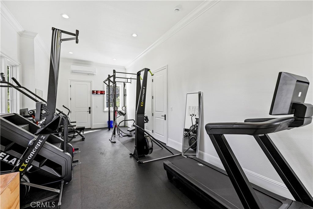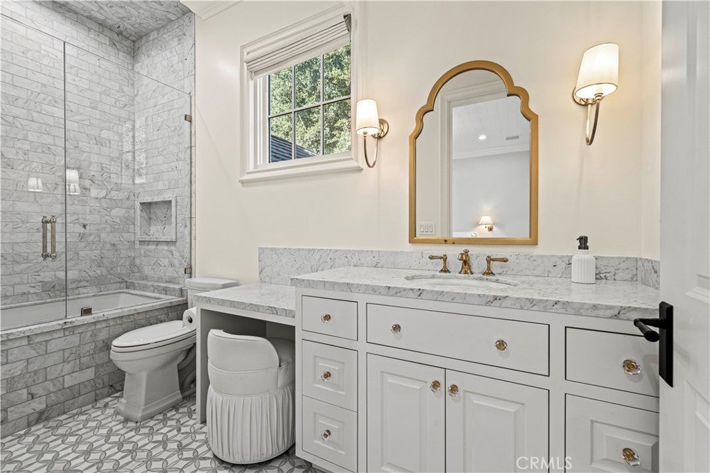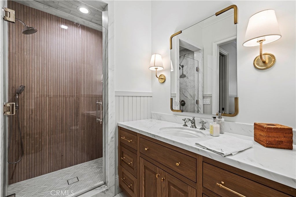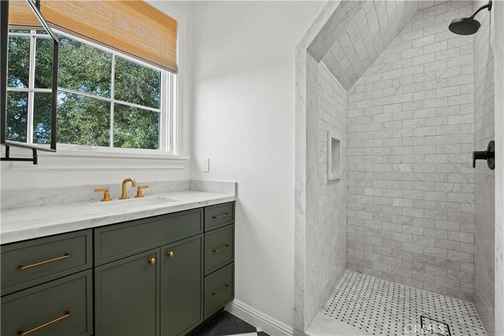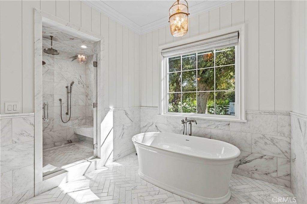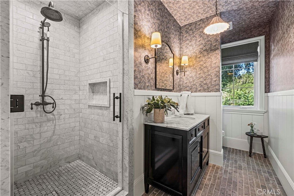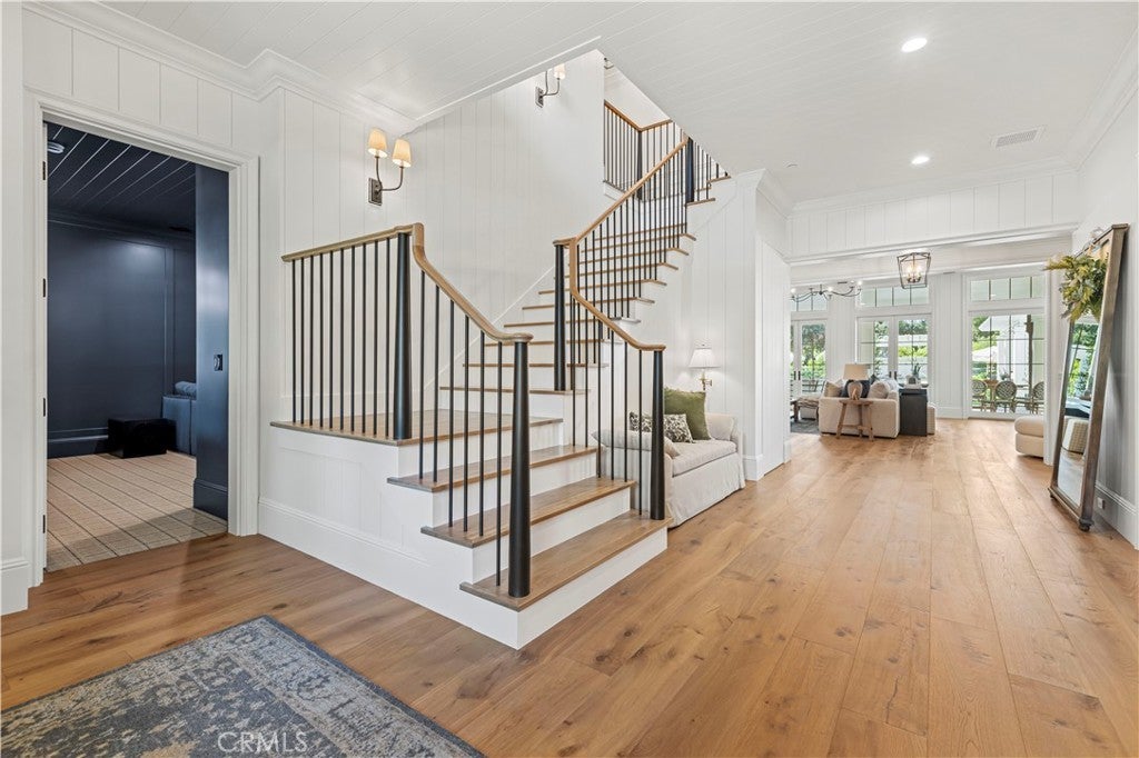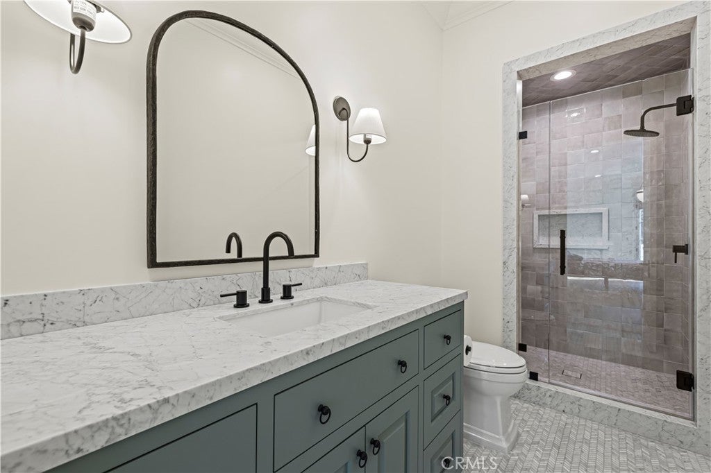 Tucked behind private gates and approached by a long paver stone driveway, this truly magnificent Sand Canyon estate spans approximately 7,815 sqft across five exquisitely manicured acres. The 6,800 sqft main residence is complemented by a spacious 653 sqft ADU above the attached three car garage, along with a separate two car carriage garage connected to a 362 square foot gym or office. Inside, soaring ceilings, coffered detailing, custom wall paneling, rich wood accents, and wide plank oak floors set a warm yet grand tone, anchored by striking stone fireplaces and reclaimed beams showcased in the family room. The home flows effortlessly into a showpiece kitchen finished in Calacatta marble with a statement Lacanche range, Thermador appliances, handmade tile, a butler’s pantry, wine refrigeration, seamless custom cabinetry, and a large walk-in pantry with two additional refrigerators. The main level features both the expansive primary bedroom suite and an additional downstairs bedroom with a full bath, while upstairs offers three guest bedrooms each with their own ensuite baths, a spacious loft, and beautifully appointed bathrooms finished in Carrera marble. The primary suite is a true retreat with its own fireplace, breathtaking estate views, and a spa inspired bath featuring herringbone marble floors, a luxurious shower, and a stunning standalone soaking tub. Entertaining continues with a refined dining room with classic wainscoting, a dedicated movie theater with insulated soundproofed walls, and space beneath the stairs that could offer a potential wine cellar. The ADU provides private guest accommodations with tall ceilings, kitchenette, separate HVAC, studio style living, and marble shower. Outdoors, the estate unfolds with stone patios and walkways, copper lanterns and gutters, a stunning resort style pool with deck jets and spa, a tranquil pond with multiple water features for added ambiance, an outdoor shower, a fully equipped outdoor kitchen, covered entertaining areas with heaters and oversized fan, 48 heritage oak trees, a stone encased raised bed garden with greenhouse, full perimeter snake fencing, manicured lawns, professional lighting, a five stall barn with turnouts, sport courts, sauna, and generous storage, all powered by a 600 amp electrical panel, paid off solar, public water for the home, and a private irrigation well, firmly positioning this exceptional property among the most premier estates Santa Clarita has to offer.