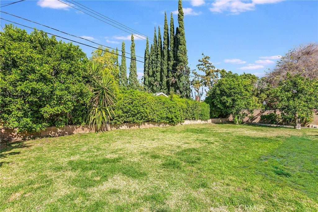 Located on a quiet street in Canoga Park, this inviting 3-bedroom, 2-bathroom home offers 1,316 square feet of comfortable living space on an expansive 7,445 square foot lot. The home greets you with attractive curb appeal featuring a manicured front lawn, colorful raised brick planters, trimmed hedges, and a covered entry. Updated mullioned windows enhance the exterior character while bringing in beautiful natural light. Inside, the family room is warm and welcoming with a dramatic floor to ceiling brick fireplace, built in bookshelves, carpeting, and a sliding glass door that opens to the backyard, creating a seamless connection to outdoor living. The kitchen is bright and well organized with white tile countertops, a full tile backsplash, and wood cabinetry that extends to the ceiling for abundant storage. A built-in oven, microwave, gas cooktop, and dishwasher provide everyday convenience. The dual basin sink sits beneath a window overlooking the yard. The adjoining dining room features two large windows, recessed lighting, and vinyl flooring, offering a comfortable space for both casual meals and gatherings. The primary bedroom includes plantation shutters, multiple windows, carpeting, and a lighted ceiling fan. The en suite bathroom is thoughtfully designed with a single basin vanity, medicine cabinet, privacy window, Hollywood style lighting, and a glass enclosed tiled step in shower. Two additional bedrooms are bright and airy with generous closet space. The guest bathroom features a single vanity, framed dressing mirror, separate medicine cabinet, wainscoting detail, and a tiled tub and shower combination. The backyard is a standout feature, offering a spacious and private setting with a lush green lawn, mature trees including citrus, abundant shrubbery, and colorful raised flowerbeds. A covered patio with a lighted ceiling fan creates an ideal space for relaxing or entertaining. Additional highlights include central air and heat, copper plumbing, and a two-car direct access garage complete with a workbench. Moments away from restaurants, shopping and parks.