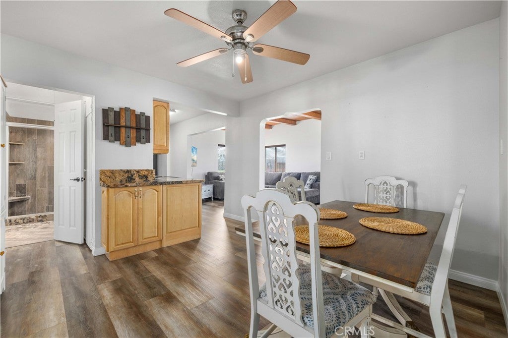 Country living at its Best on 1.24 Acres! Could easily be 3 Bedrooms. This charming and inviting home offers warmth, character, and a long list of valuable upgrades. Step into a spacious living room with beautiful wood beam ceilings and abundant windows that fill the home with natural light. A Blaze King wood-burning stove adds cozy ambiance and efficient heat for those cooler evenings. The updated kitchen features upgraded stainless steel appliances and flows easily into the heart of the home. You'll also love the huge combination laundry room and walk-in pantry, offering exceptional storage and functionality. Need extra space? The 13' x 20' enclosed patio includes its own mini-split system, making it perfect as a family room, guest space, office, or potential third bedroom. The home also features evaporative cooling to help keep energy costs down. Outside, the property truly shines with a rare oversized 800 Square Foot 4+ car garage/workshop — ideal for hobbyists, mechanics, storage, or small business needs. A large concrete slab in front of the garage provides additional parking or workspace, and a concrete walkway connects the garage to the home for convenience. Recent improvements include: Brand new flooring throughout most of the home + new bedroom carpet + Fresh interior paint + New baseboards throughout + All new plumbing and water lines + Fully landscaped front yard with sprinkler/irrigation system + Newer front fence and sliding entry gate This adorable property offers space, comfort, and versatility — all while qualifying for USDA 100% financing. A rare opportunity to enjoy peaceful country living with modern updates already done for you!