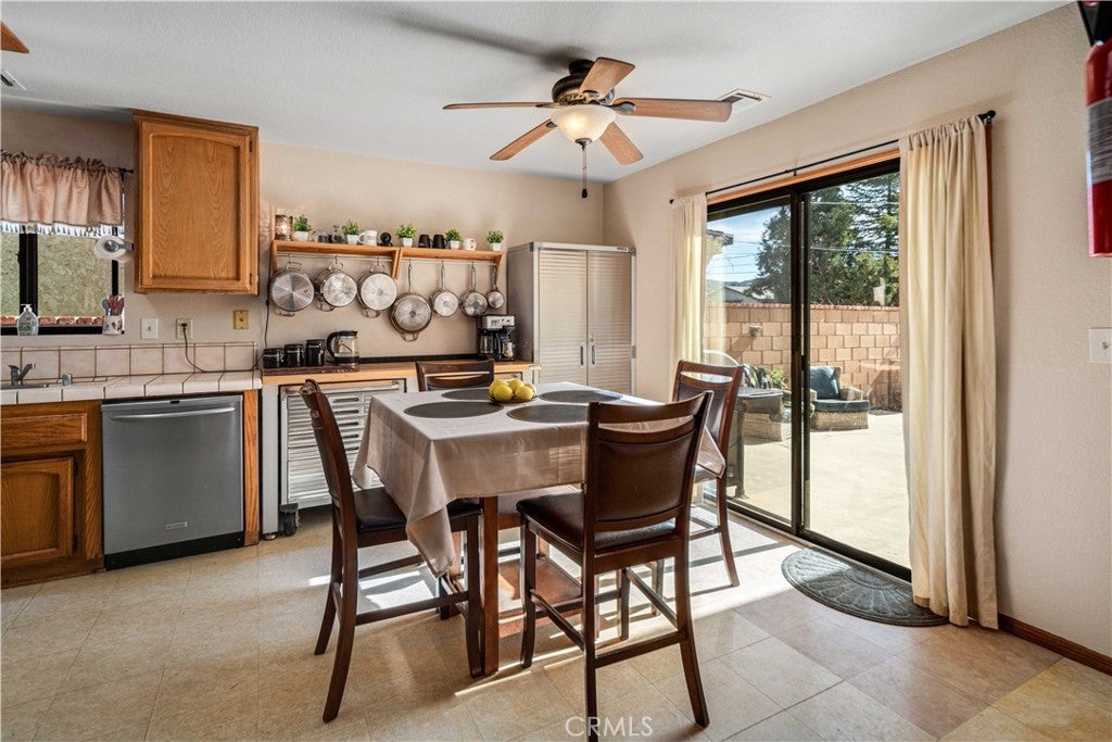 • Interior FeaturesBlock Walls, Ceiling Fan(s), Eat-in Kitchen, Tile Counters, All Bedrooms Down, Main Level Primary
