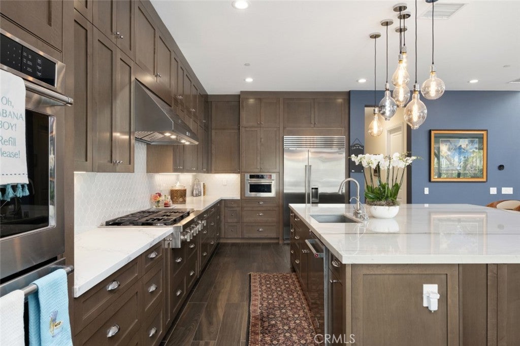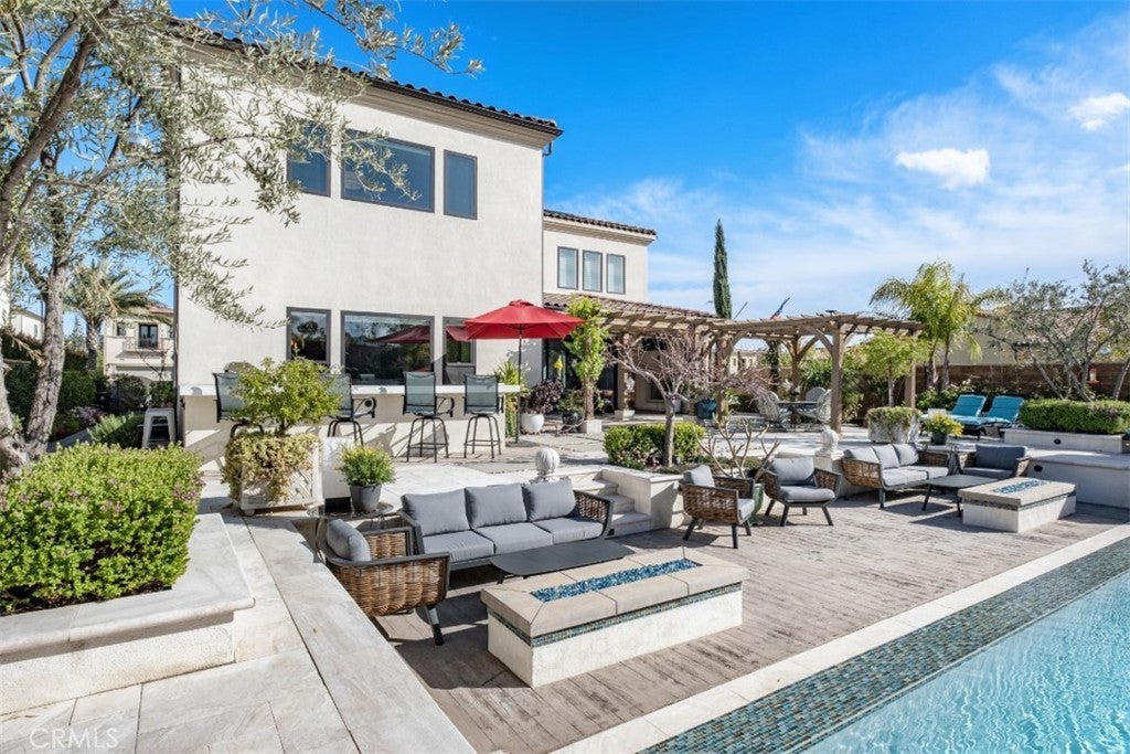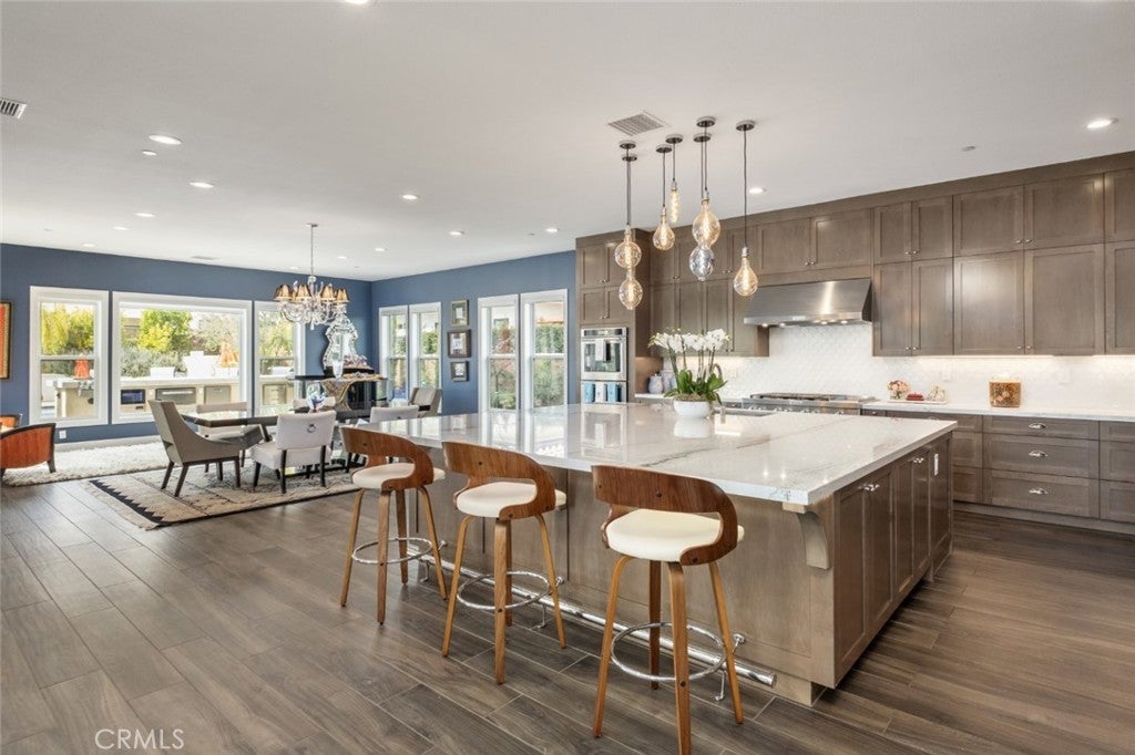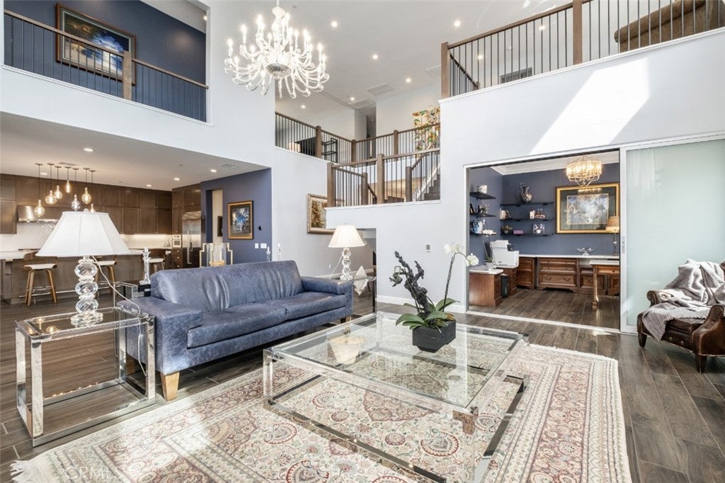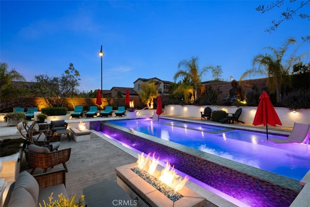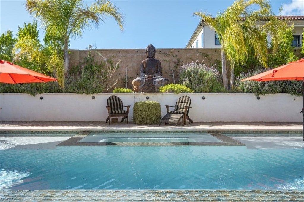 Situated on a prime lot in the prestigious Canyon Oaks community in Chatsworth, this extraordinary estate blends cutting edge design, craftsmanship, and luxury living. Amazing curb appeal with conscientious drought tolerant landscaping, graceful fountain, and aesthetic touches like shutters and Juliet balconies, creating a lovely, Mediterranean feel. Designed to impress, the home offers an open, flowing, floor plan and a contemporary aesthetic complimented by rich, sumptuous touches and modern convenience, enhanced by soaring ceilings, abundant natural light, radiant-heated porcelain floors, automated blinds, and motion-sensor lighting throughout. Move seamlessly between living and entertaining spaces with dramatic two-story living room with clerestory windows and floor-to-ceiling sheers, convenient office space with custom built-ins, formal dining space open to views of the yard, and a spectacular showpiece of a kitchen with enormous central island with breakfast bar seating, dedicated pantry, Sub-Zero and KitchenAid appliances, ceiling-height cabinetry with custom glass tops. A private suite downstairs offers a large walk-in closet and en-suite ¾ bath is perfect for guests or creating a home office space. Upstairs is a large secondary living space that makes a perfect lounge or playroom, a convenient laundry room, three good-sized bedrooms with abundant natural light and a truly luxurious primary suite with full ensuite bath boasting separate shower and soaking tub. Outside, embrace the best of resort style living with a truly spectacular yard, starting with the indoor/outdoor appeal of a California room and including a 7-ft, 800-lb Buddha feature. The backyard sanctuary is an entertainer’s dream, with a fully equipped outdoor kitchen, professional misting system, engineered perimeter drainage, a sunken social pit with dual 5-ft fire features, and a fully electric pool with light and electronic sterilization and dramatic raised fire/water bowls, as well as mature Meyer lemon, tangerine, and lime trees. Additional features include a Lorex security system with one month of recordings, whole-home water filtration, 3-car garage with overhead storage and a premium insulated, wind-rated garage door. The home is well situated near shopping, dining, entertainment, including the Vinyard, and major transportation thoroughfares. Don’t let this opportunity to own an exceptionally appointed luxury estate in one of Chatsworth’s most exclusive enclaves.