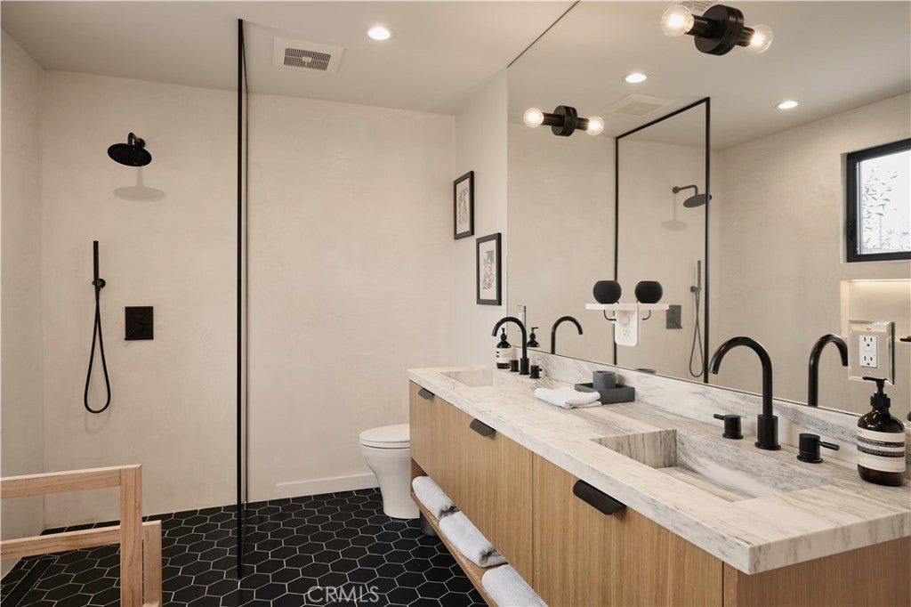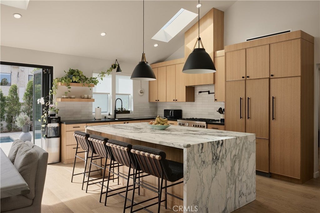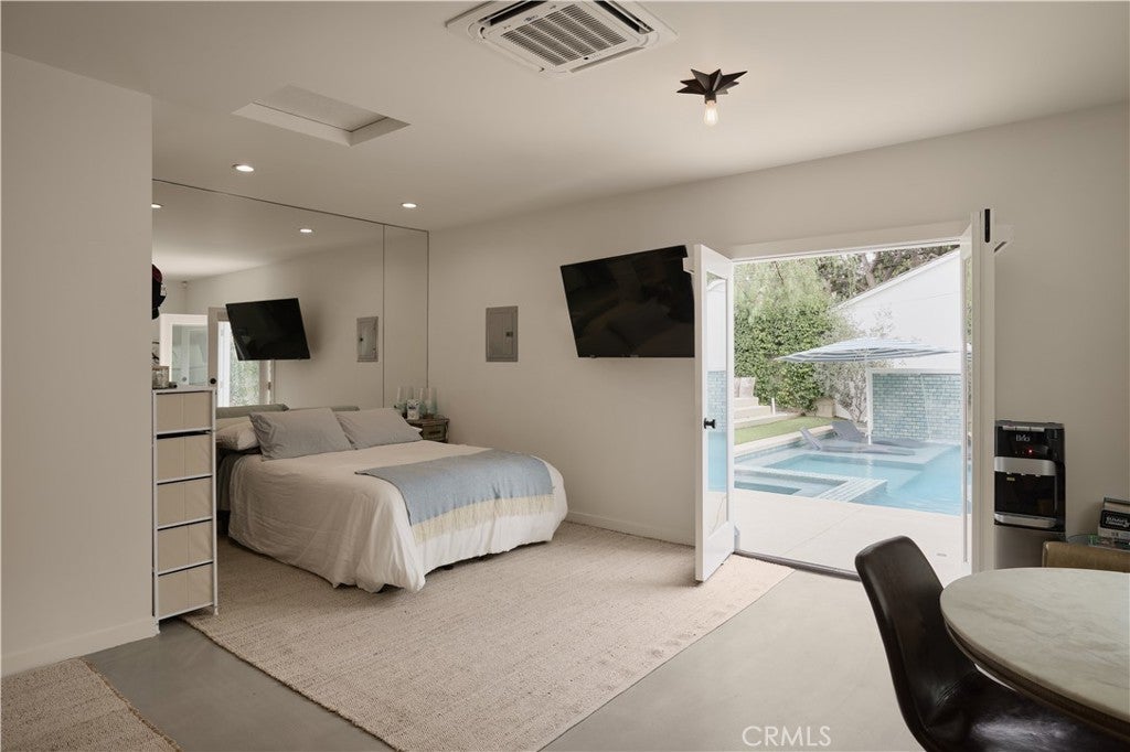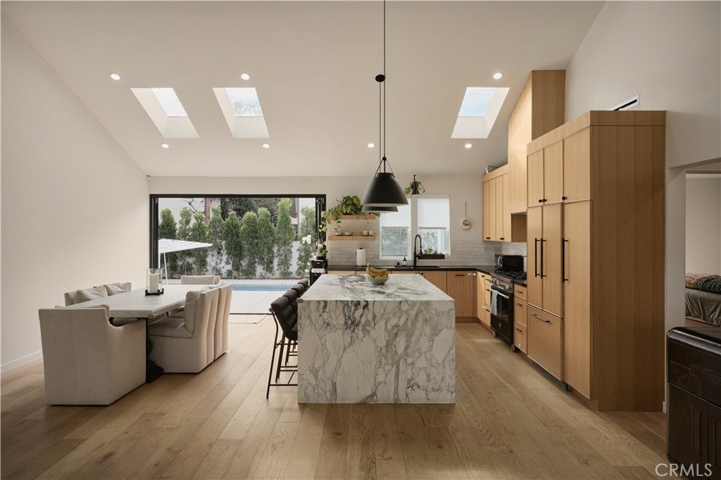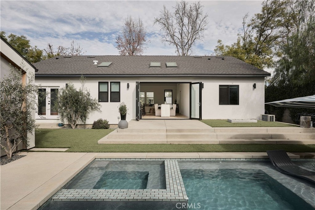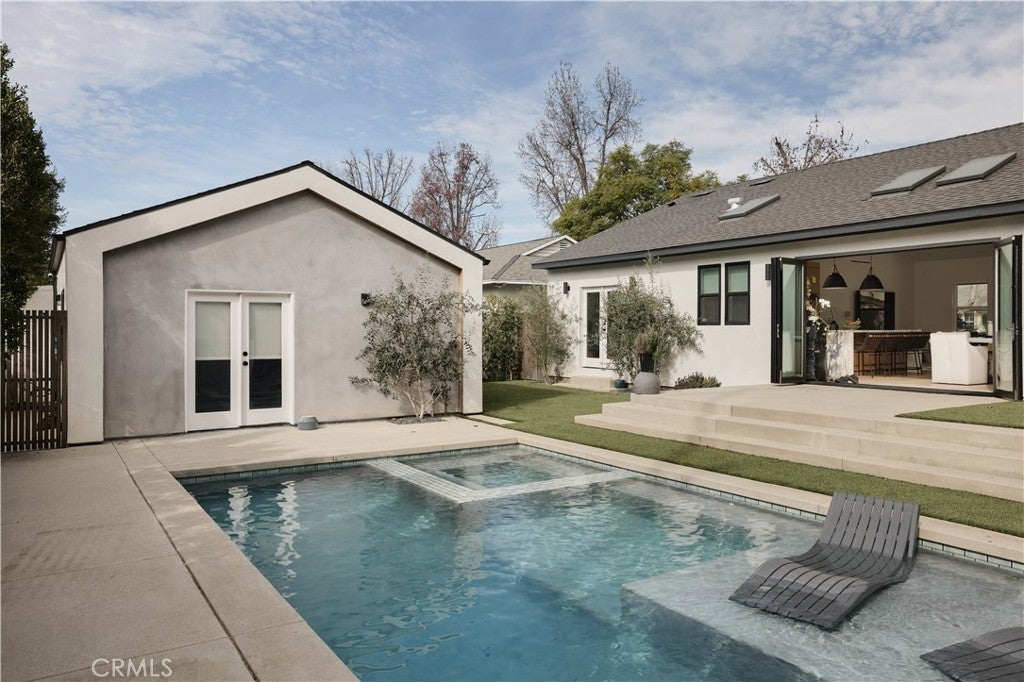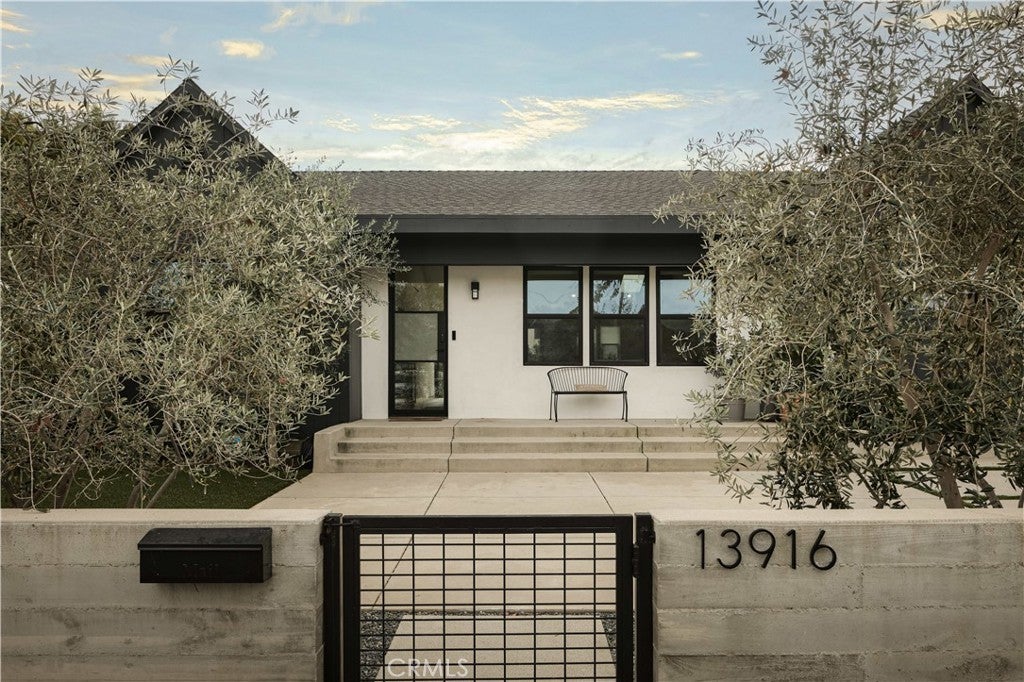 Single-story modern masterpiece situated on a picturesque tree-lined street in the highly sought-after Fashion Square neighborhood of Sherman Oaks. From the moment you arrive, the home’s sleek architectural lines and striking design make a lasting impression. Completely rebuilt and thoughtfully expanded, this residence showcases exceptional craftsmanship and meticulous attention to detail that will satisfy even the most discerning buyer. Step inside to soaring ceilings, an expansive open-concept layout, and sun-filled interiors that create an immediate “wow” factor. The main residence offers 3 bedrooms and 2.5 bathrooms, plus a detached ADU with its own private entrance and address, totaling approximately 2,100 square feet of living space. The chef’s kitchen is a true showpiece, featuring custom rift white oak cabinetry, natural stone countertops, high-end Bertazzoni range, Fisher & Paykel refrigerator, and an oversized center island that seamlessly connects to the dining and family rooms — ideal for both everyday living and entertaining. Embrace California indoor-outdoor living as French doors open to an entertainer’s backyard paradise. Enjoy a spacious patio with fire pit, a stunning pool with waterfall feature, Baja shelf, and spa — the perfect setting for gatherings or quiet evenings at home. The luxurious primary suite opens directly to the resort-style backyard and includes a generous custom-built walk-in closet. The spa-inspired primary bath exudes elegance with a custom dual-sink vanity, freestanding soaking tub, and glass-enclosed shower. No detail has been overlooked. Premium finishes and carefully curated materials — including designer tile and top-tier fixtures — elevate the entire home. The ADU, overlooking the pool, offers a warm organic aesthetic with concrete counters and floors, oak cabinetry, open wood shelving, and a beautifully appointed bathroom. The grounds are thoughtfully landscaped with mature olive and ficus trees, new turf, and lush plantings, creating a serene and private environment. Additional features include a board-form concrete front wall with gated entry, electric driveway gate, electric car charger, alarm system - and a spacious front play area. Ideally located near the freeway, Westfield Fashion Square Mall, and Ventura Boulevard’s shops and dining. This is a rare opportunity to own a truly special home.