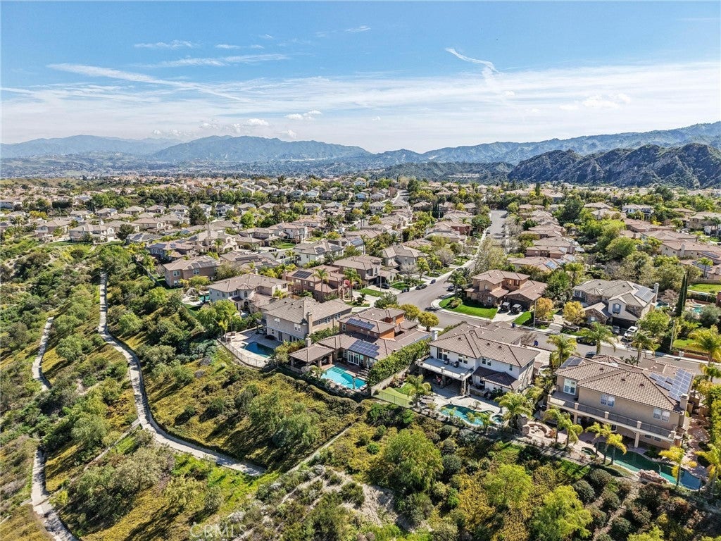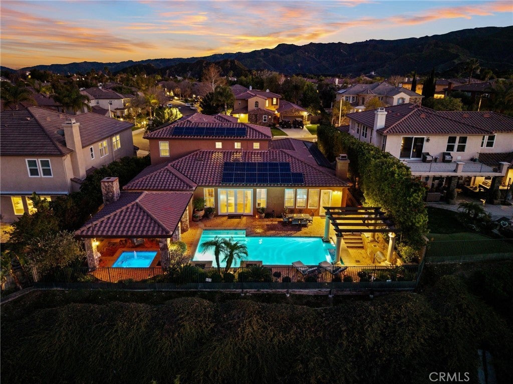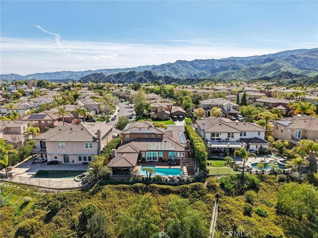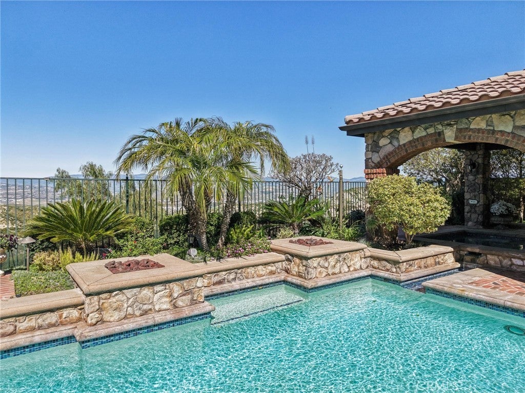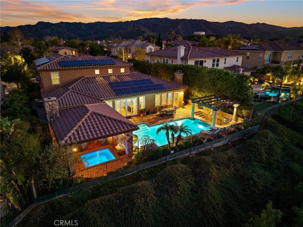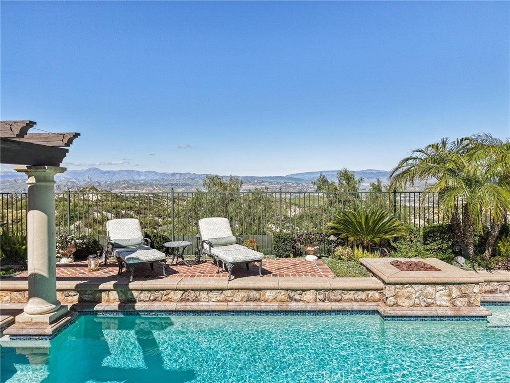 Get ready for a customized pool and view home at the top of Stevenson Ranch with a location like no other! Truly a one-of-a-kind property with upgrades and features both functional and jaw-droppingly gorgeous! It's one thing to enjoy the privacy and sunsets of a 180-degree panoramic view of Santa Clarita, it’s even better when it comes with a floorplan and custom improvements you rarely see. Even in neighborhoods as popular as "Torcello". As you approach the gated courtyard with fountain, you can sense you are in for something special...and you are! From the custom front door your eyes are drawn out the sliders to the pool and beyond. A striking first impression! To the right are 3 downstairs bedrooms, including the primary with its own views of the yard. For those desiring single story living (and rarely finding it) you never have to go up the stairs to the 2 additional bedrooms and huge loft. To the left is a spacious family room and kitchen which has been recently remodeled with quartz counters, beautiful island with a cascading waterfall edge, awesome backsplash, built-in appliances and a custom glass walled wine cellar. Another hint of all that has been put into this amazing property. Wood and tile floors throughout and the stone hardscape - front and back - is both practical and impressive. Outside is what you came for - pebble tech pool, separate covered spa, amazing stone gazebo with TV, heaters and fireplace. As the owner said, "I’ll never see something like this again." Sunken BBQ cook station too, all with complete privacy. The 3-car split garage is fully finished with epoxy and cabinets and the single car garage (WITH AC!) can be a gym or office as it has been both. All 5 bedrooms are good-sized with large closets, all with organizers and the loft is huge including a closet for storage. There are no Mello Roos taxes, you are close to Richard Rioux Park and amazing schools, but you will truly feel like you are in your own world in this incredible home. WOW!