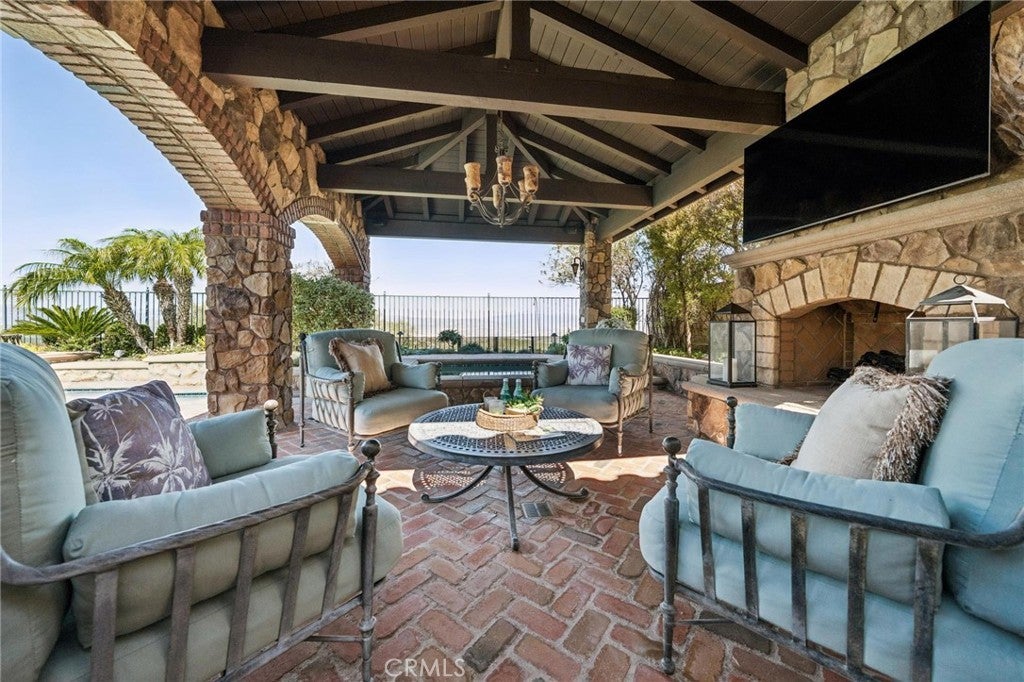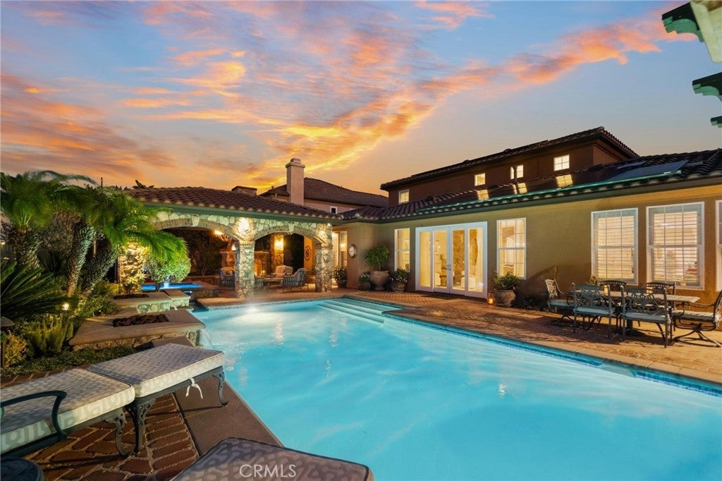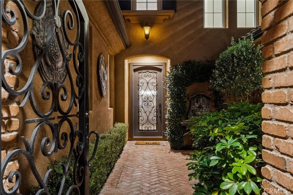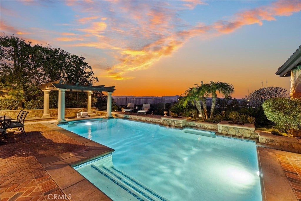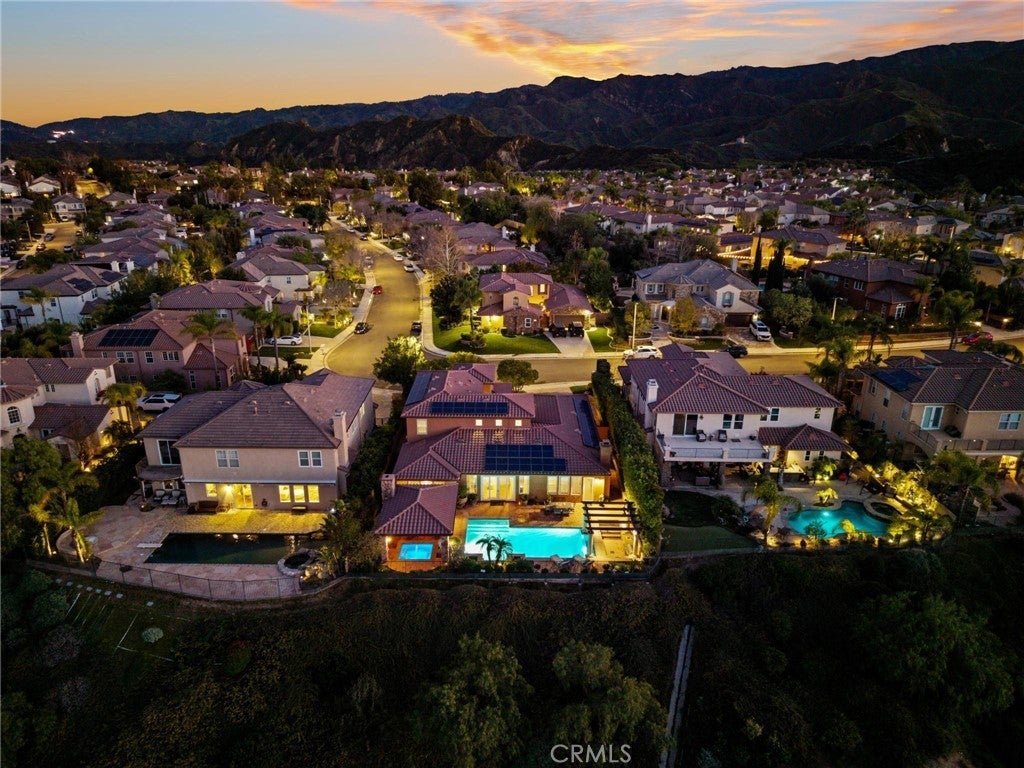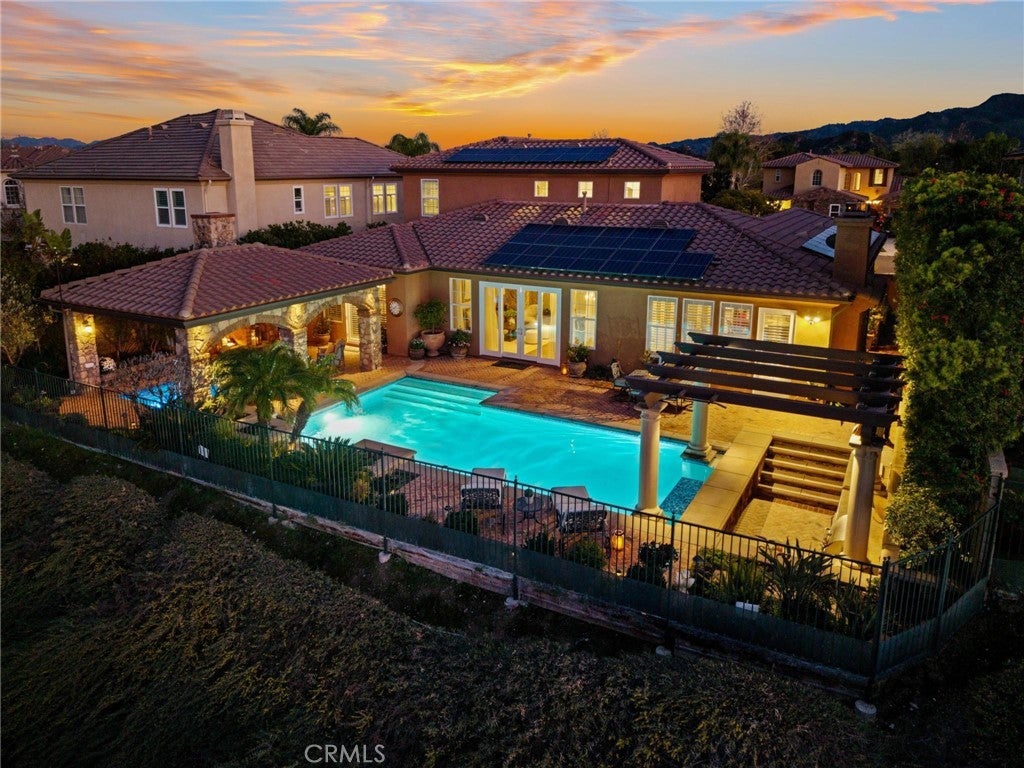 Get ready for a customized pool and view home at the top of Stevenson Ranch with a location like no other! Truly a one-of-a-kind property with upgrades and features both functional and jaw-droppingly gorgeous! It's one thing to enjoy the privacy and sunsets of a 180-degree panoramic view of Santa Clarita, it’s even better when it comes with a floorplan and custom improvements you rarely see. Even in neighborhoods as popular as "Torcello". As you approach the gated courtyard with fountain, you can sense you are in for something special...and you are! From the custom front door your eyes are drawn out the sliders to the pool and beyond. A striking first impression! To the right are 3 downstairs bedrooms, including the primary with its own views of the yard. For those desiring single story living (and rarely finding it) you never have to go up the stairs to the 2 additional bedrooms and huge loft. To the left is a spacious family room and kitchen which has been recently remodeled with quartz counters, beautiful island with a cascading waterfall edge, awesome backsplash, built-in appliances and a custom glass walled wine cellar. Another hint of all that has been put into this amazing property. Wood and tile floors throughout and the stone hardscape - front and back - is both practical and impressive. Outside is what you came for - pebble tech pool, separate covered spa, amazing stone gazebo with TV, heaters and fireplace. As the owner said, "I’ll never see something like this again." Sunken BBQ cook station too, all with complete privacy. The 3-car split garage is fully finished with epoxy and cabinets and the single car garage (WITH AC!) can be a gym or office as it has been both. All 5 bedrooms are good-sized with large closets, all with organizers and the loft is huge including a closet for storage. There are no Mello Roos taxes, you are close to Richard Rioux Park and amazing schools, but you will truly feel like you are in your own world in this incredible home. WOW!