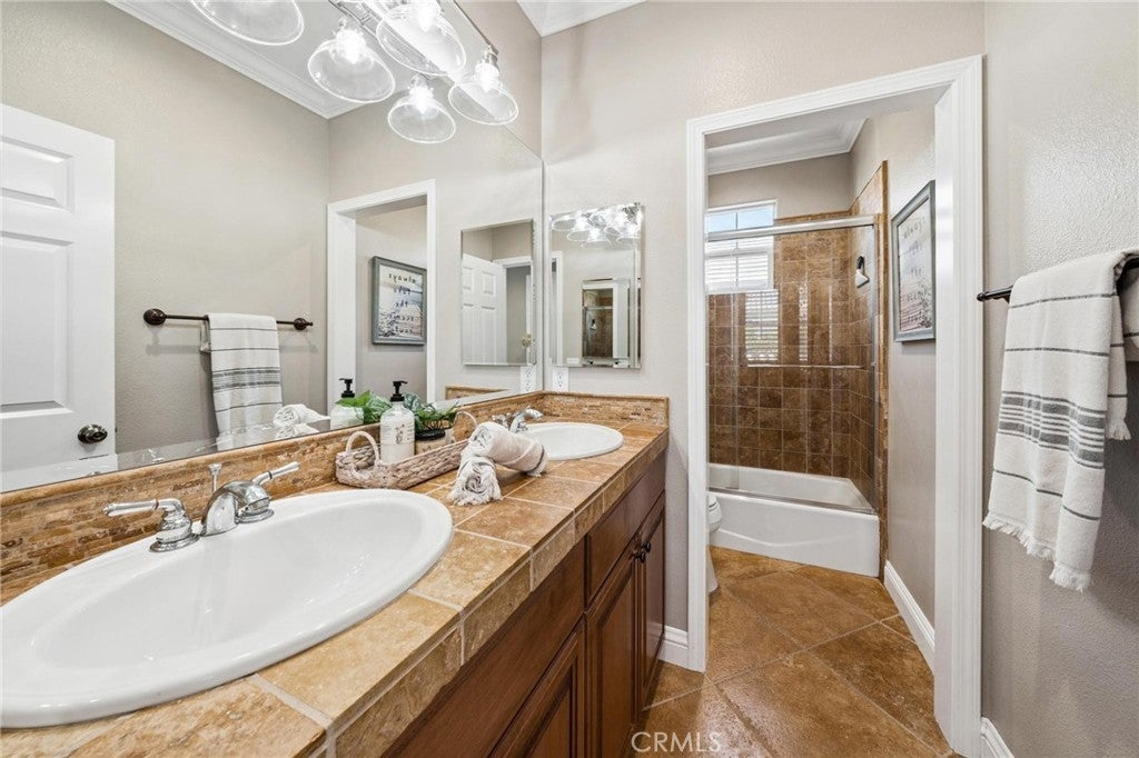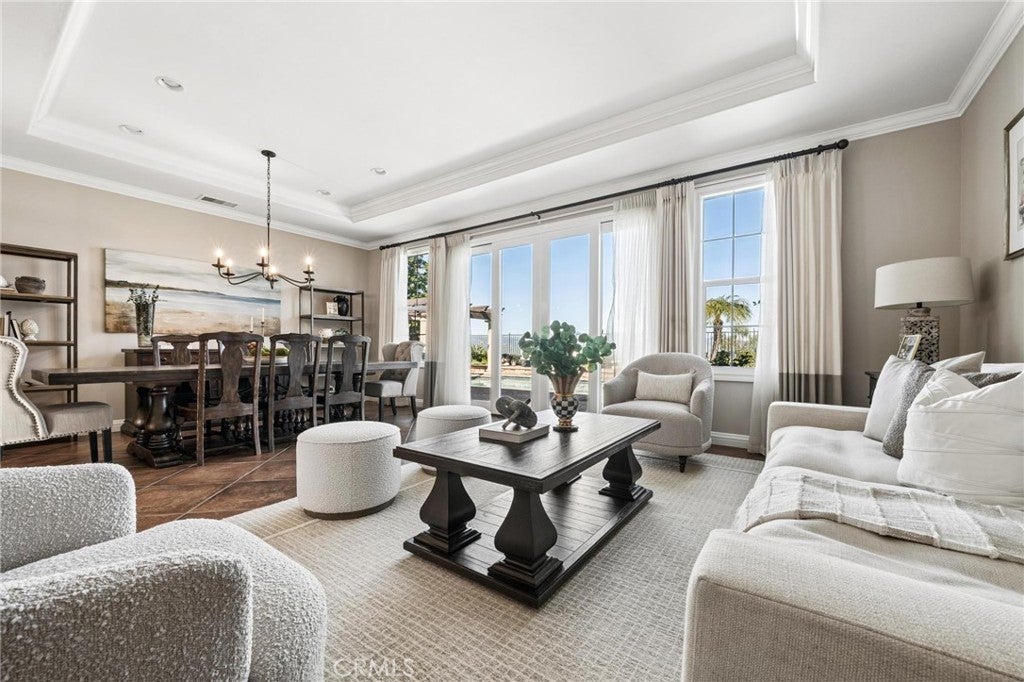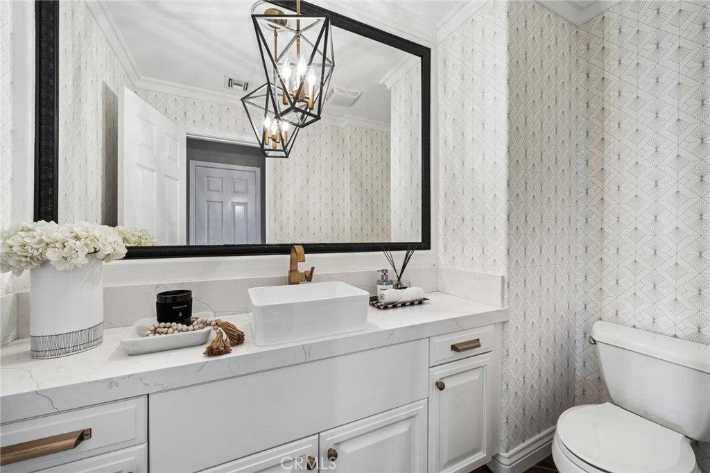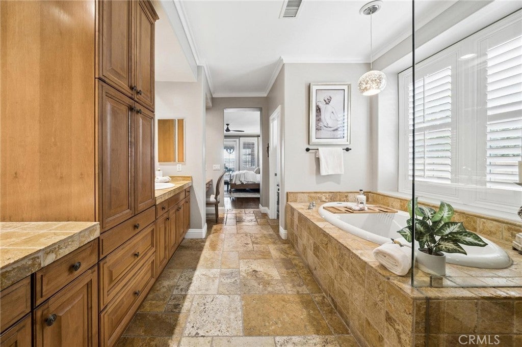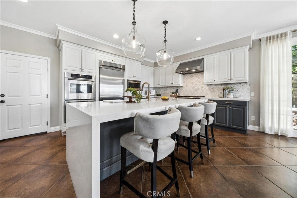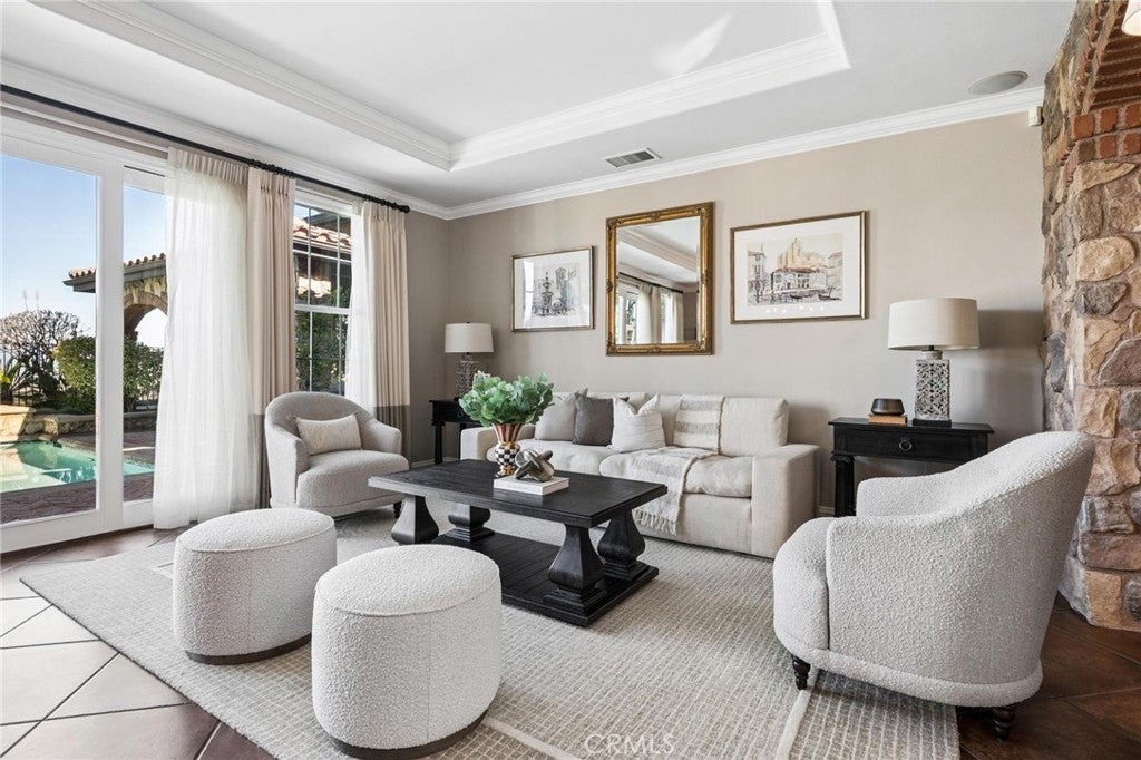 Get ready for a customized pool and view home at the top of Stevenson Ranch with a location like no other! Truly a one-of-a-kind property with upgrades and features both functional and jaw-droppingly gorgeous! It's one thing to enjoy the privacy and sunsets of a 180-degree panoramic view of Santa Clarita, it’s even better when it comes with a floorplan and custom improvements you rarely see. Even in neighborhoods as popular as "Torcello". As you approach the gated courtyard with fountain, you can sense you are in for something special...and you are! From the custom front door your eyes are drawn out the sliders to the pool and beyond. A striking first impression! To the right are 3 downstairs bedrooms, including the primary with its own views of the yard. For those desiring single story living (and rarely finding it) you never have to go up the stairs to the 2 additional bedrooms and huge loft. To the left is a spacious family room and kitchen which has been recently remodeled with quartz counters, beautiful island with a cascading waterfall edge, awesome backsplash, built-in appliances and a custom glass walled wine cellar. Another hint of all that has been put into this amazing property. Wood and tile floors throughout and the stone hardscape - front and back - is both practical and impressive. Outside is what you came for - pebble tech pool, separate covered spa, amazing stone gazebo with TV, heaters and fireplace. As the owner said, "I’ll never see something like this again." Sunken BBQ cook station too, all with complete privacy. The 3-car split garage is fully finished with epoxy and cabinets and the single car garage (WITH AC!) can be a gym or office as it has been both. All 5 bedrooms are good-sized with large closets, all with organizers and the loft is huge including a closet for storage. There are no Mello Roos taxes, you are close to Richard Rioux Park and amazing schools, but you will truly feel like you are in your own world in this incredible home. WOW!