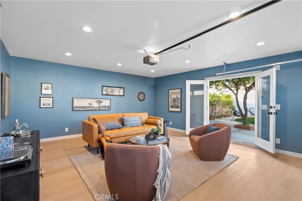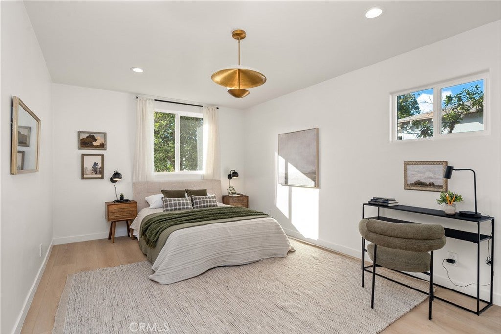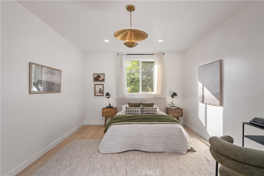 Fully reimagined with intention and care, this beautifully redesigned Valley Village home blends classic Mid-Century inspiration with modern finishes to create a space that feels warm, welcoming, and truly special. Rich walnut cabinetry, handmade statement lighting, and refined brass accents add depth and character throughout, while clean lines and an open layout give the home an effortless flow. Skylights fill the interiors with natural light, highlighting the thoughtful materials and creating a bright, inviting atmosphere. At the heart of the home, the kitchen pairs a sleek slab island, vertical green tile backsplash, and sculptural integrated range hood to form a space that is both functional and expressive. Expansive bifold doors open to the backyard, extending the living space outdoors and making it easy to gather, relax, and entertain. The insulated garage has been thoughtfully converted into a finished flex space, offering approximately 350 square feet of additional usable space ideal for a home office, creative studio, gym, or quiet retreat. Thoughtfully designed and ready for you to make memories