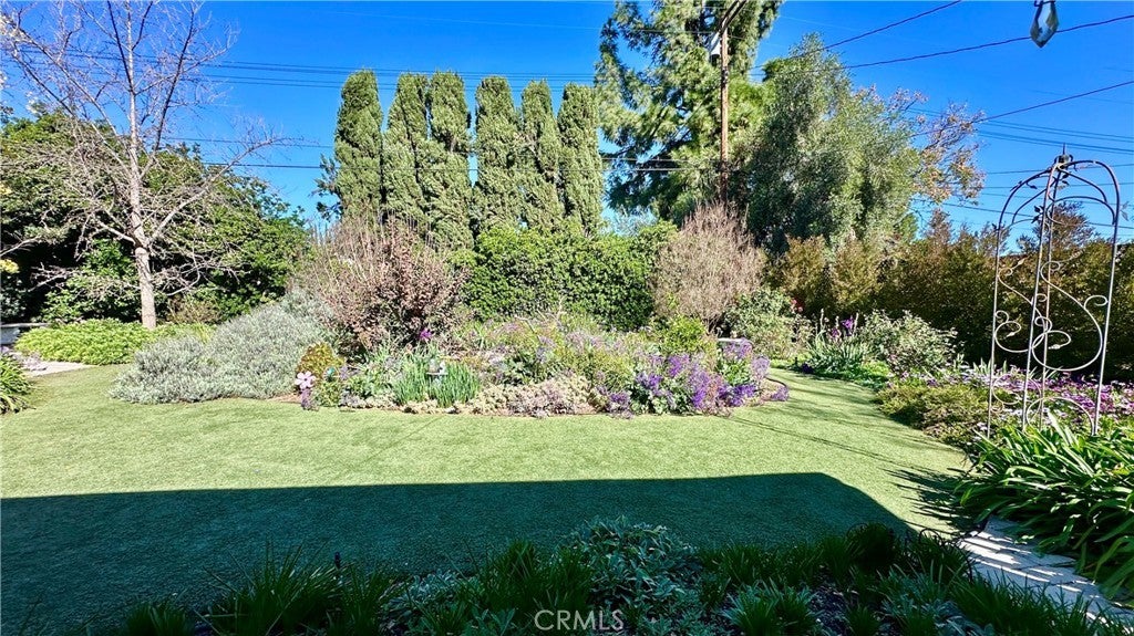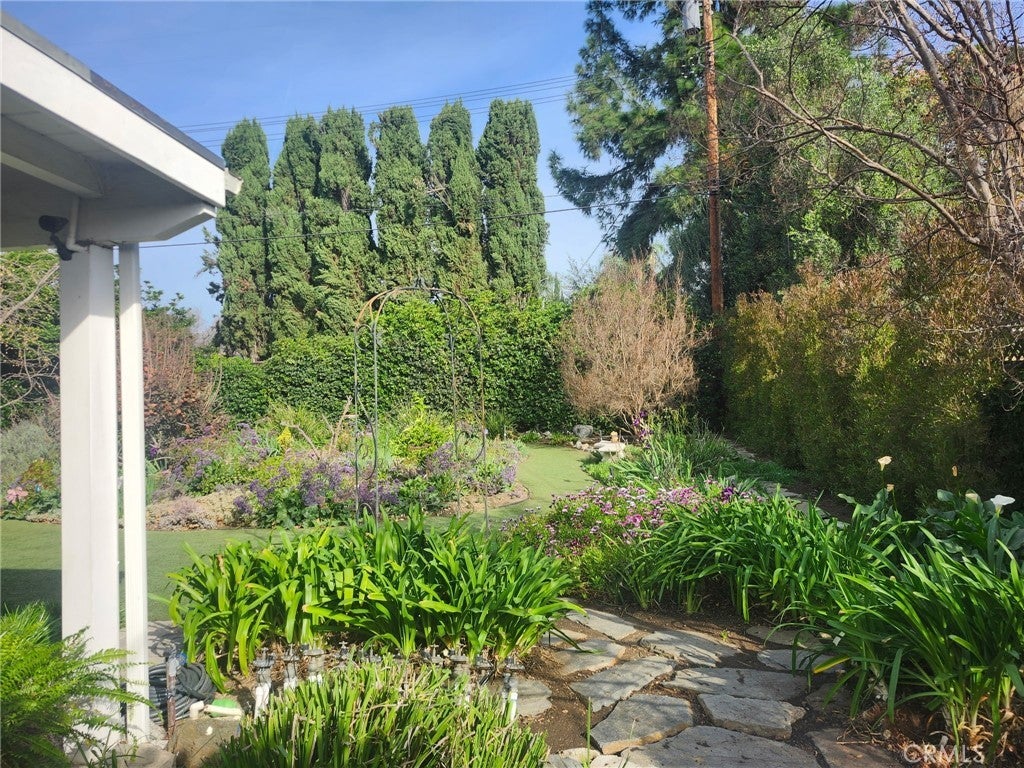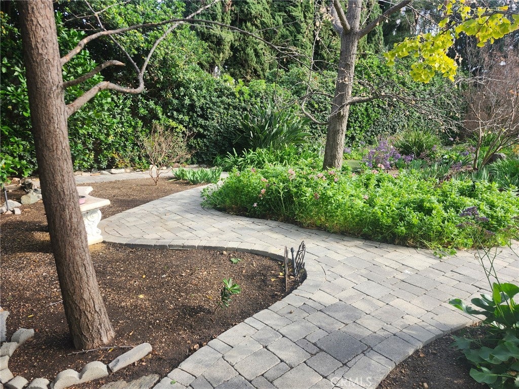 Welcome to 17745 Romar Street, nestled on an expansive 12,000+ sq. ft. lot with breathtaking park-like grounds, ideally located on a quiet cul-de-sac in the heart of Northridge. Situated within the highly sought-after Granada Hills Charter High School district, this single-story home offers the perfect blend of comfort, charm, and convenience. A stunning circular paver driveway creates impressive curb appeal and sets the tone for what awaits inside. This 4 bedroom, 2 bath residence features warm wood laminate flooring, a cozy fireplace in the living room, elegant French doors, and an expansive formal dining room/family room ideal for both everyday living and entertaining. The updated kitchen is thoughtfully designed with quartz countertops, abundant cabinetry, stainless steel appliances, a charming breakfast nook, and an oversized walk-in pantry - a dream for any home chef. The spacious primary suite offers a peaceful retreat, complete with a walk-in closet and a tastefully remodeled en-suite bath. Step outside to the true showpiece of this property - a spectacular backyard oasis that feels like your own private botanical garden. Lovingly curated and meticulously maintained, the grounds are bursting with vibrant flowering plants, mature greenery, and winding paver pathways that invite you to explore and unwind. The lush landscaping creates layers of texture and color, offering beauty in every direction and a sense of complete serenity. A large covered patio provides the perfect setting for outdoor dining, entertaining, or simply relaxing while enjoying the tranquil surroundings. Whether hosting gatherings or savoring a quiet morning coffee, this backyard is truly paradise in the Valley. Additional highlights include central air and heat, copper plumbing, dual-pane windows, a direct-access two-car garage with pull-down attic storage, AC, and a driveway with potential RV parking. Ideally located just minutes from CSUN, parks, shopping, dining, and more.