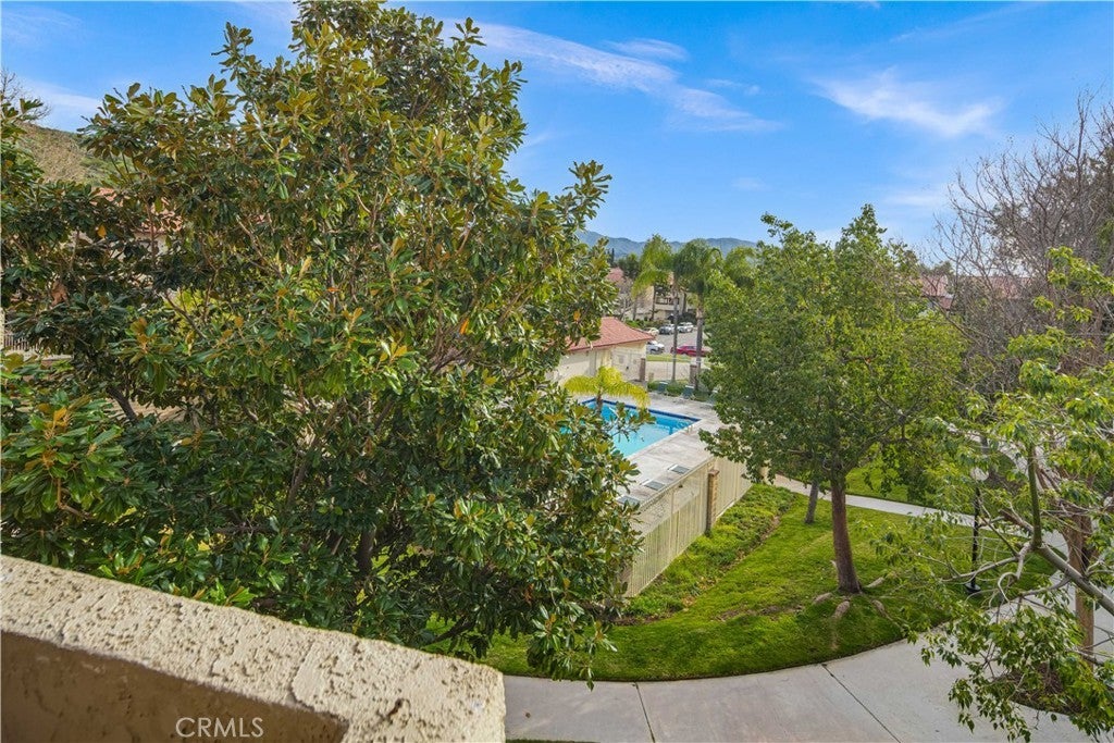 Welcome to this move-in ready top level condo, beautifully remodeled and ideally located overlooking the community pool and greenbelt. A mature magnolia tree adds privacy from the balcony while still allowing open views. The living room features high ceilings and a full custom built-in with open display shelving above and enclosed cabinet storage below, creating a true focal point. The dining area is finished with custom wall trim and flows into the updated kitchen with stainless steel appliances, freshly painted cabinetry, and porcelain countertops. The remodeled guest bath includes in-unit laundry for added convenience. The primary bedroom offers a walk-in closet and an updated en-suite bathroom. A 2 car tandem garage is attached to the building for easy access. The community includes 5 pools, multiple playgrounds, and HOA dues cover water and trash.