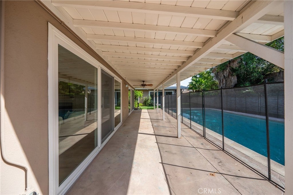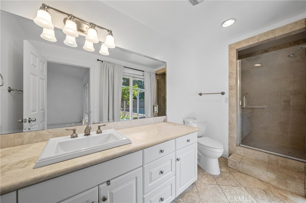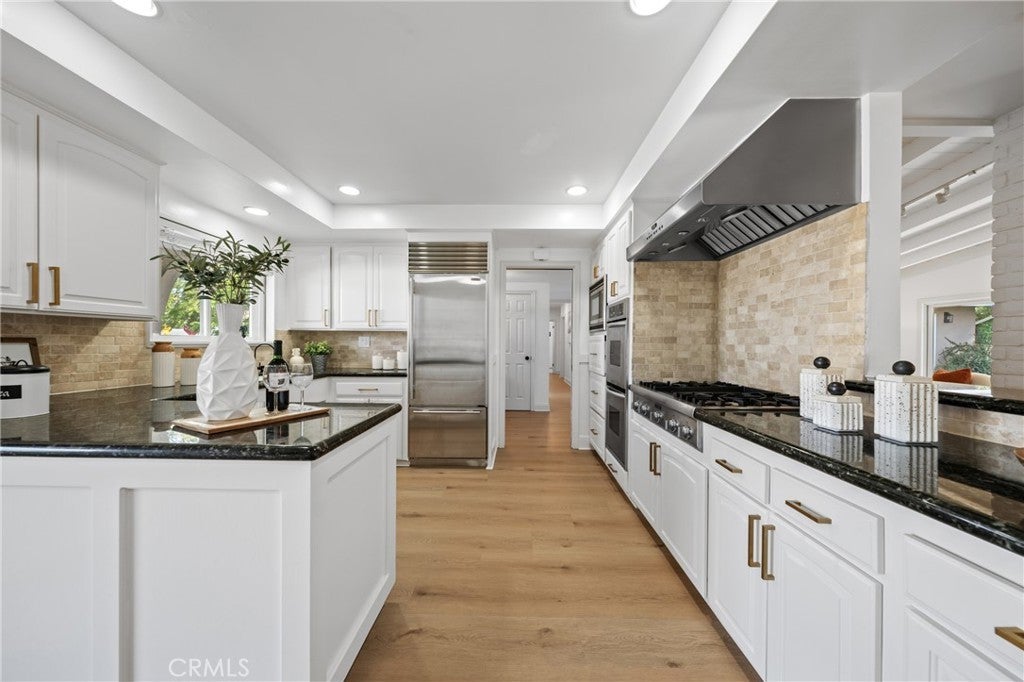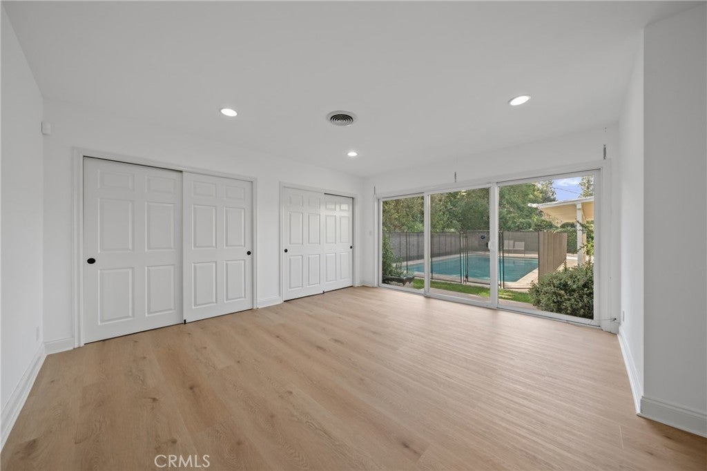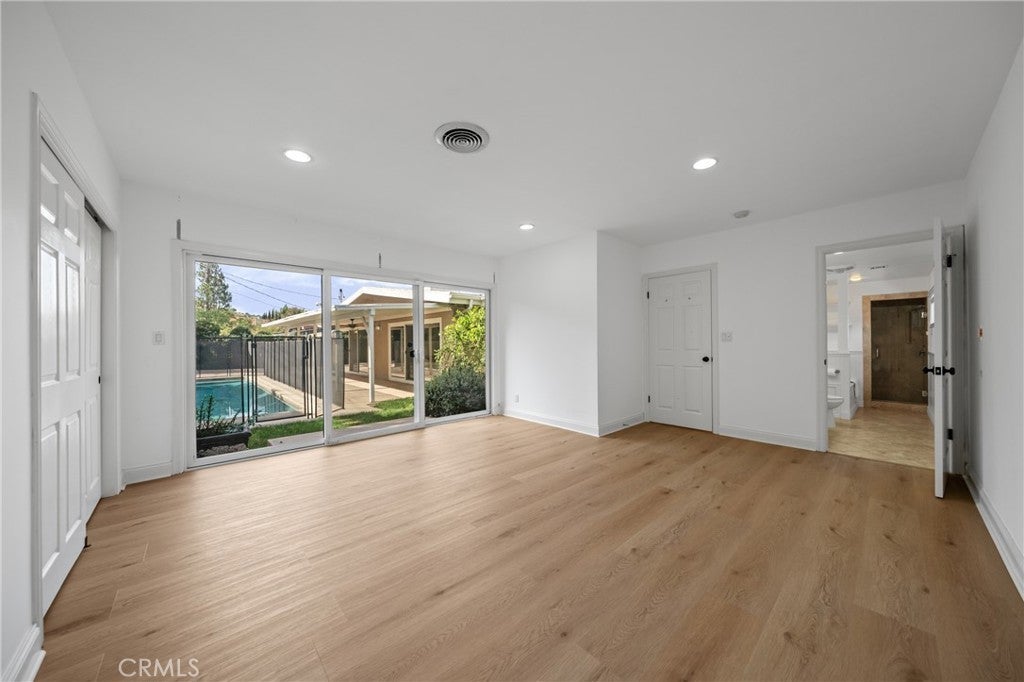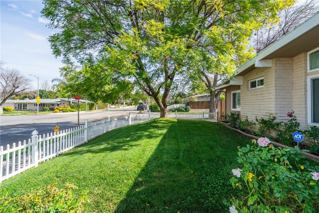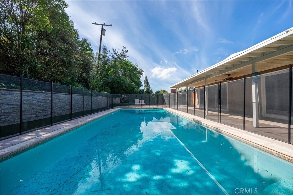 This beautiful single-story 4-bedroom, 3.5-bath home is ideally situated on the border of Woodland Hills and Calabasas, within walking distance to Calabasas Lake and The Commons. The house featuring high ceilings and a well-designed floor plan, it offers brand-new flooring throughout. The spacious living and family rooms flow seamlessly into a stunning backyard—perfect for entertaining. Enjoy a large pool, lush grassy area, covered patio, and ample space for outdoor BBQs and gatherings. The kitchen showcases vintage designer cabinetry, granite countertops, stainless steel appliances, a built-in refrigerator, and a Thermador 4-burner stove with electric griddle. A cozy breakfast area completes the space. This home includes two private primary suites, each with sliding glass doors opening to the serene backyard and pool. The additional two bedrooms share a Jack-and-Jill bathroom, plus there is a convenient hallway bath—ideal for families or guests. Located within the highly sought-after Calabash Elementary and El Camino Charter school districts. Don’t miss this exceptional opportunity to call this home your own!