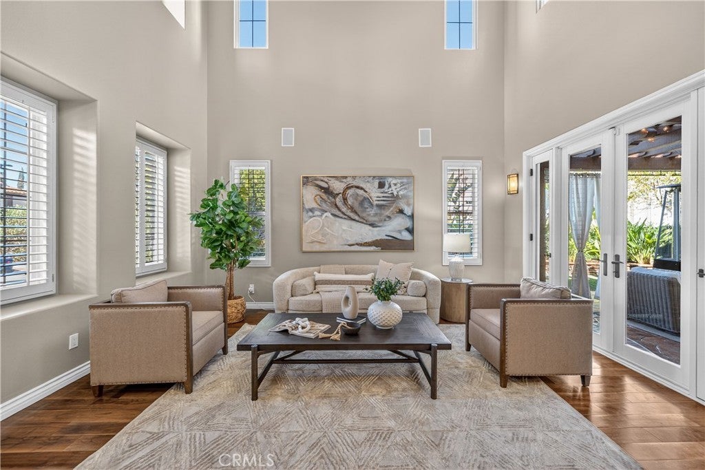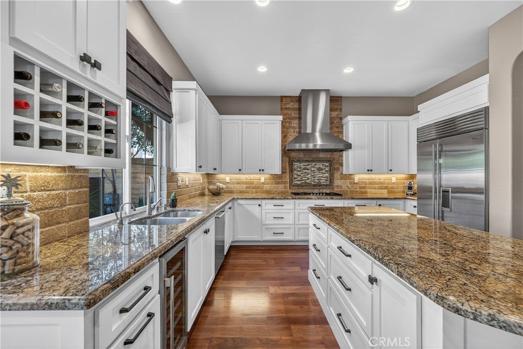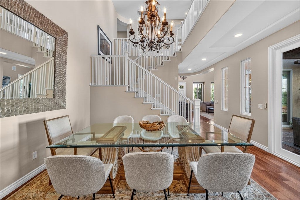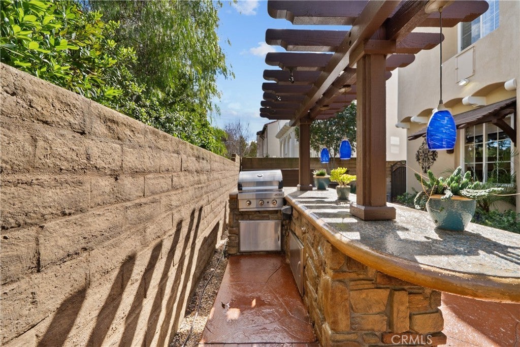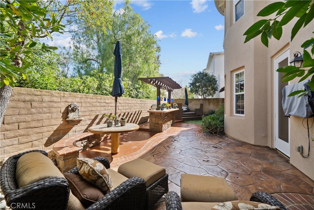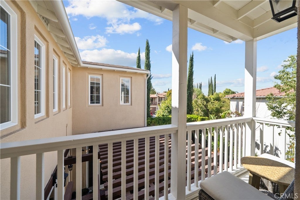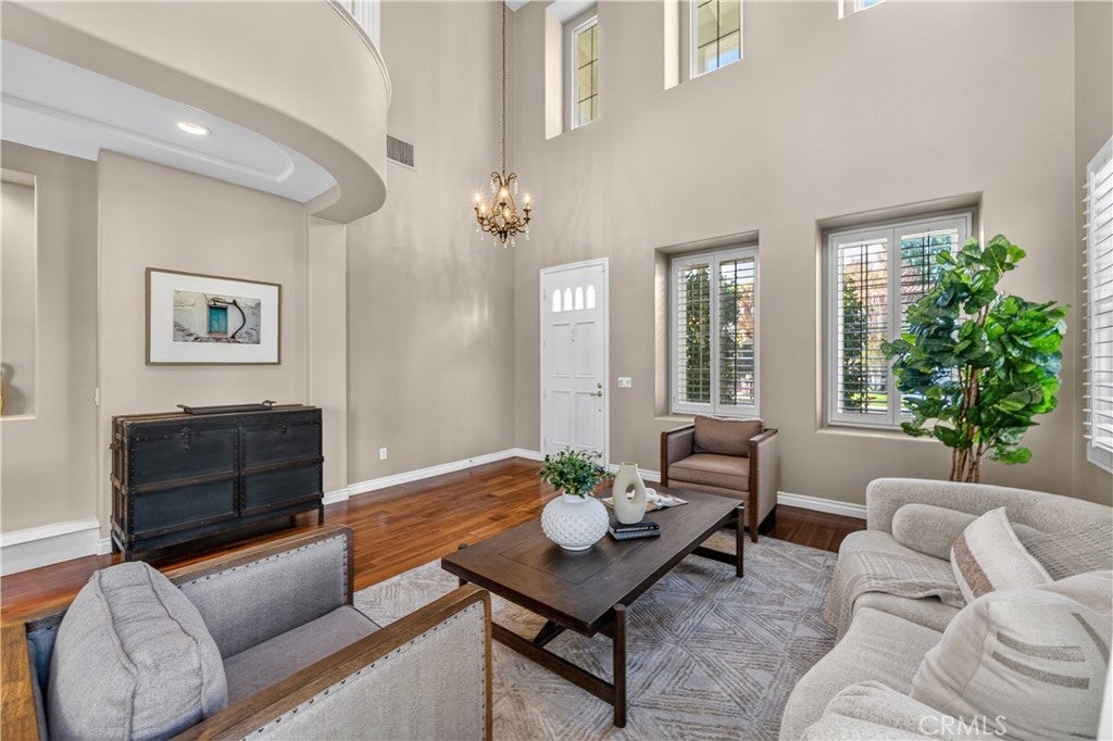 Located in the highly sought-after 24-hour guard-gated Valencia Woodlands community, this move-in ready, beautifully upgraded Garland home offers 4 bedrooms, 3 bathrooms, and 3,367 sq. ft. of light-filled living space. Striking curb appeal and lush landscaping set the tone as you step inside to wood floors, soaring ceilings, brand-new carpet upstairs, and an ideal layout. The updated kitchen features a built-in Sub-Zero refrigerator, Thermador appliances, granite countertops, custom white cabinetry, and a wine refrigerator, opening seamlessly to the family room with a cozy fireplace. Formal living and dining rooms provide elegant spaces for entertaining. Upstairs, all four bedrooms include a spacious primary suite with a large bedroom, expansive bath, and two walk-in closets, along with a generous laundry room and charming balconies. Outdoor living shines with a private courtyard side patio with multiple French door entries—perfect for entertaining—and a backyard complete with low-maintenance turf, an above-ground spa, and a built-in BBQ with seating. Additional highlights include owned solar, a 3-car garage with epoxy floors, an EV charging plug, abundant storage, newer AC units, exterior paint, and a tankless water heater. Enjoy easy freeway access, award-winning schools, nearby dining and shopping, and resort-style community amenities including a pool, spa, tennis, and pickleball courts. Low HOA. No Mello-Roos. This one checks every box—don’t miss it!