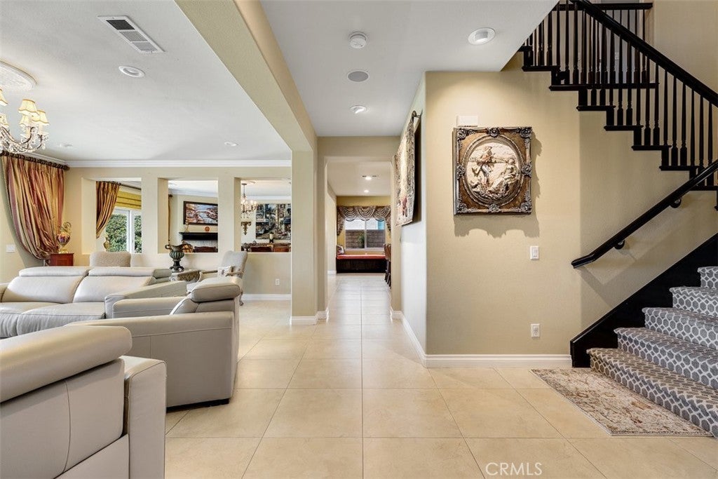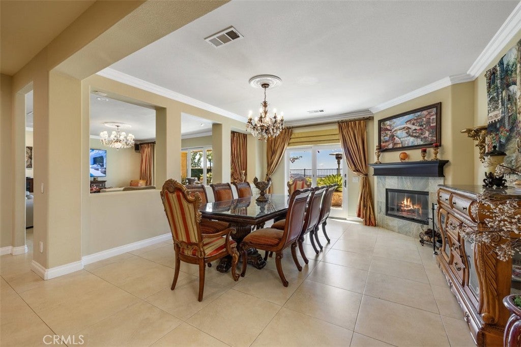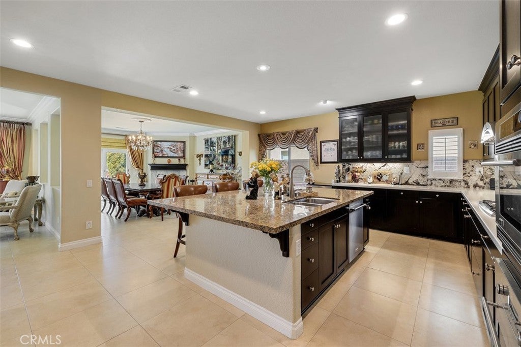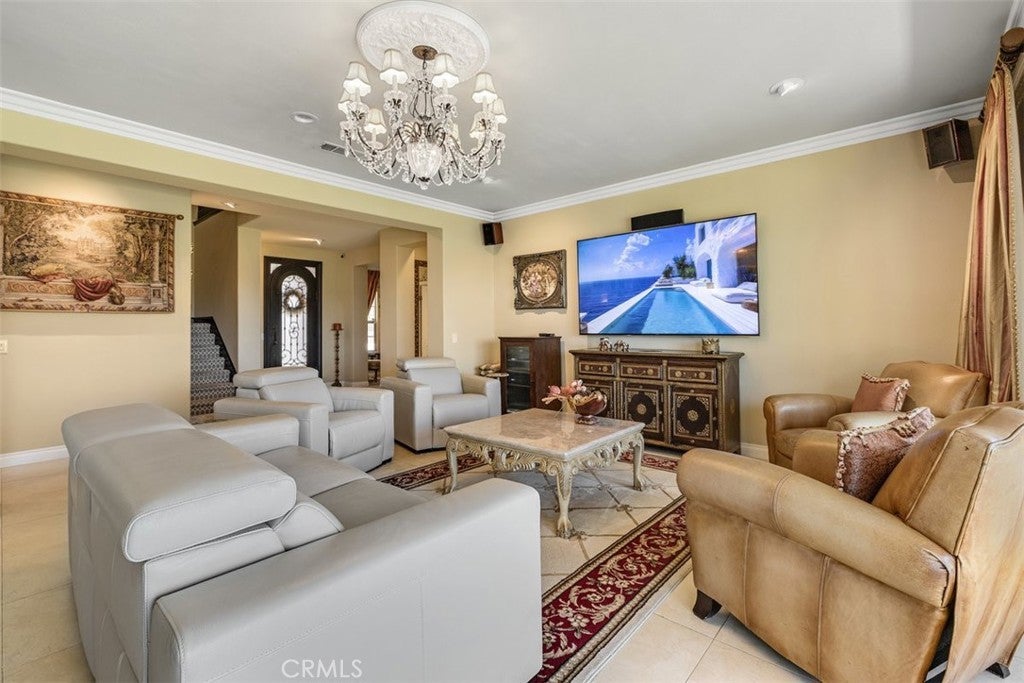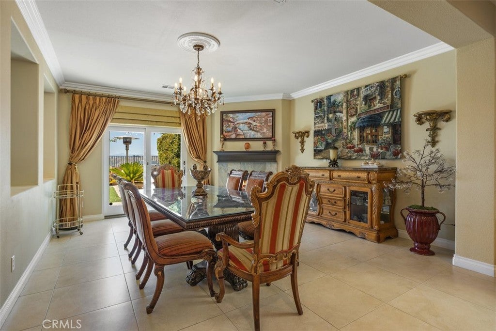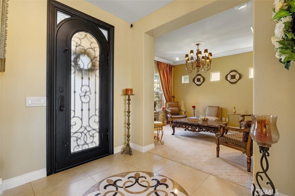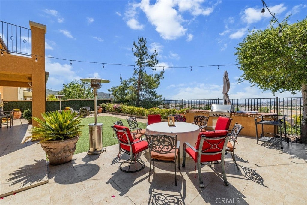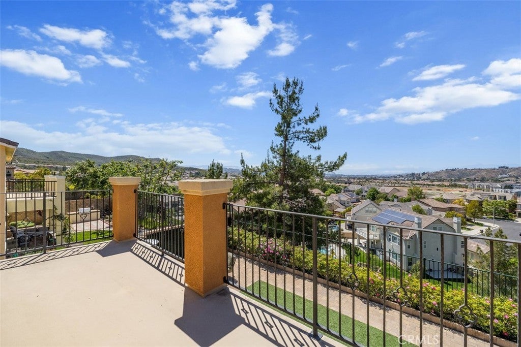 Once a Model, now a Supermodel. Luxury living is elevated in this stunning 5-bedroom, 4-bath home that has gone from model home to absolute supermodel status. Carefully curated for those who crave the perfect blend of function and opulence, every inch of this residence is designed to impress. Step inside through a custom wrought iron front door and be greeted by imported Spanish tile inlay floors and a luminous Schonbek crystal chandelier. The open-concept layout flows into a designer kitchen featuring a dramatic black Galaxy granite backsplash, oversized island, walk-in pantry, and built-in wine fridge—perfect for both daily living and entertaining in style. Serve up gourmet meals in the formal dining room complete with a cozy fireplace. Downstairs offers a private bedroom and full bath, ideal for guests or multi-generational living. Let the outdoors in when you open up 4-panel Fleetwood type glass doors that lead to a raised tile patio and a professionally landscaped low maintenance backyard. Entertain with a custom BBQ and an electric patio sunscreen—all while enjoying panoramic city views. Upstairs, find a spacious in-law suite with a mini kitchenette, a large loft for flexible living, and a laundry room for added convenience. The expansive primary suite includes its own balcony, spa like bath with separate tub and shower, dual vanities and walk in closet. It's your own private retreat above it all. Other premium features include, elegant chandeliers in both the living and dining rooms LED accent lighting for art throughout the downstairs, a 3-car garage and newer custom landscaping. This home isn’t just beautiful—it’s built to impress. From its showstopping finishes to its thoughtful floorplan, it truly is a supermodel in the world of luxury homes.