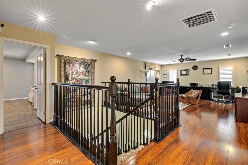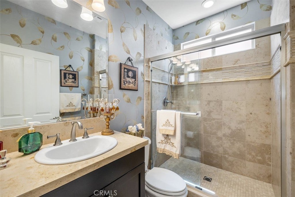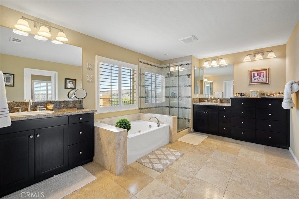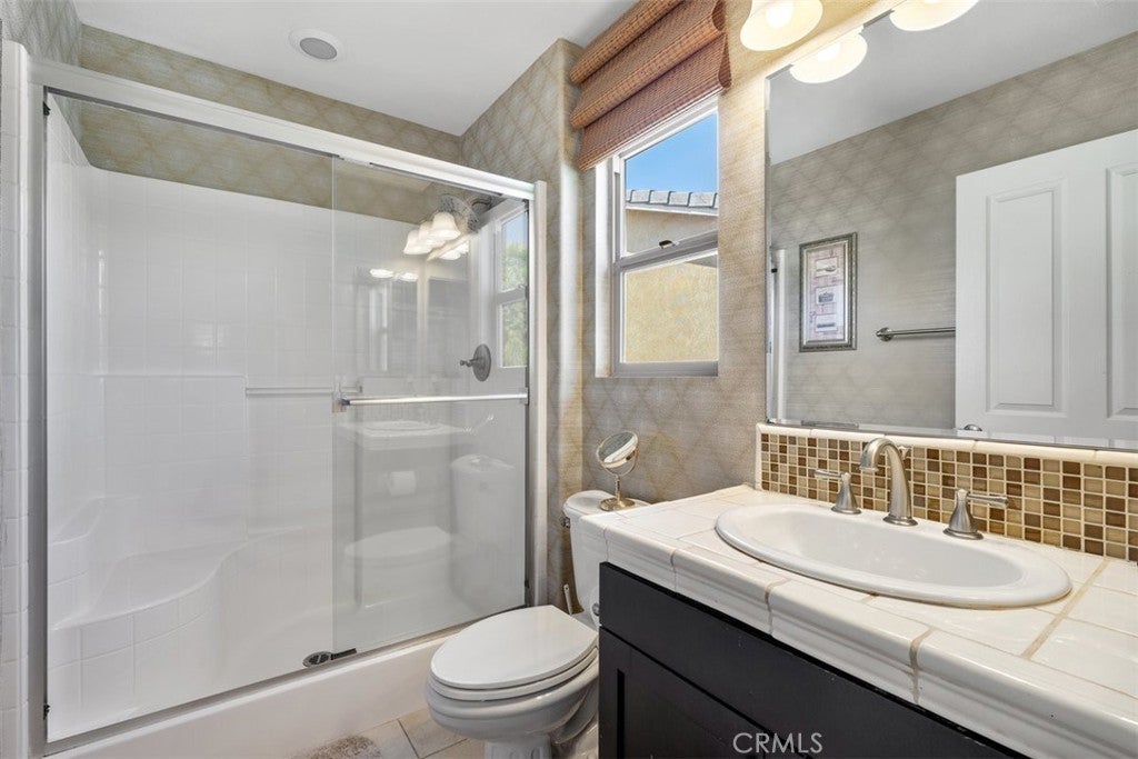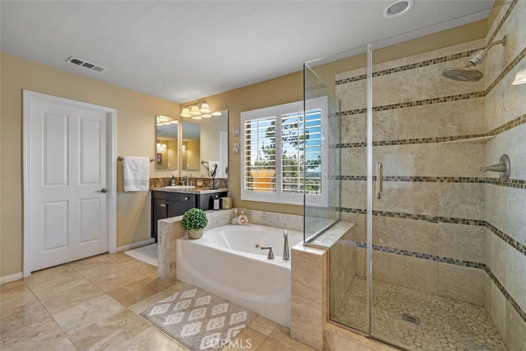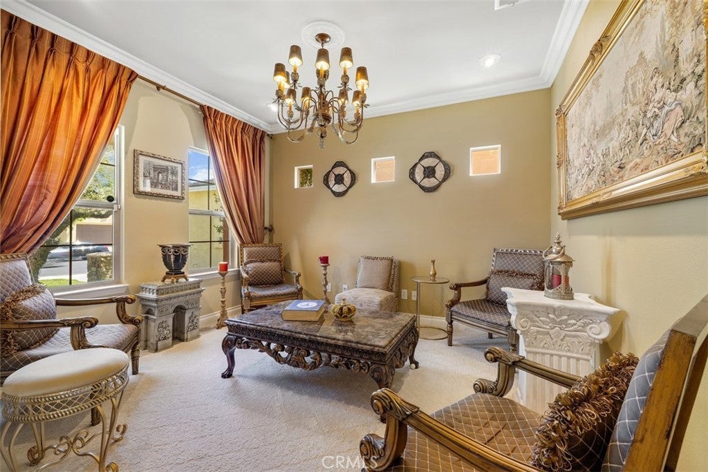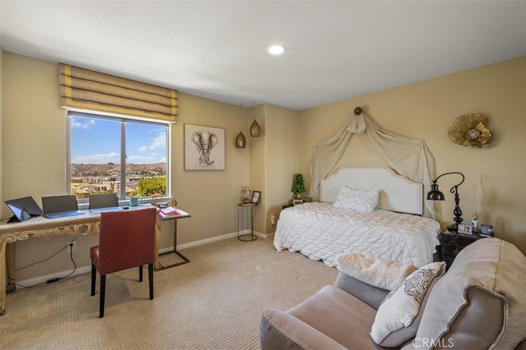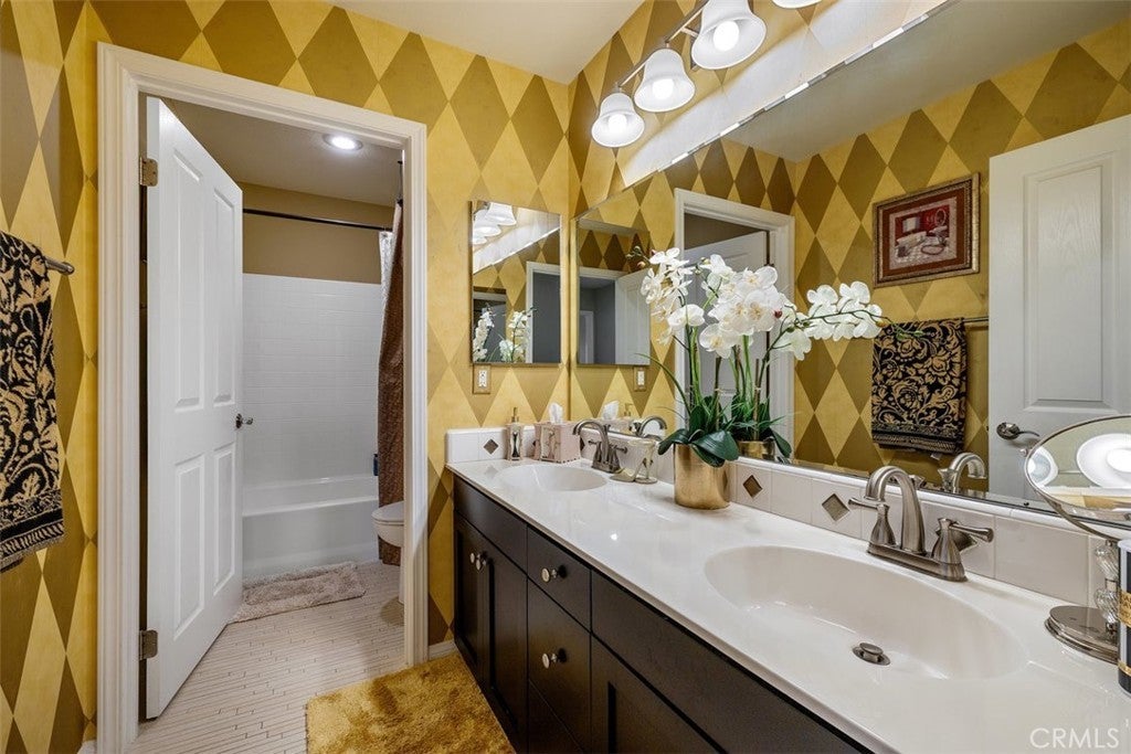 Once a Model, now a Supermodel. Luxury living is elevated in this stunning 5-bedroom, 4-bath home that has gone from model home to absolute supermodel status. Carefully curated for those who crave the perfect blend of function and opulence, every inch of this residence is designed to impress. Step inside through a custom wrought iron front door and be greeted by imported Spanish tile inlay floors and a luminous Schonbek crystal chandelier. The open-concept layout flows into a designer kitchen featuring a dramatic black Galaxy granite backsplash, oversized island, walk-in pantry, and built-in wine fridge—perfect for both daily living and entertaining in style. Serve up gourmet meals in the formal dining room complete with a cozy fireplace. Downstairs offers a private bedroom and full bath, ideal for guests or multi-generational living. Let the outdoors in when you open up 4-panel Fleetwood type glass doors that lead to a raised tile patio and a professionally landscaped low maintenance backyard. Entertain with a custom BBQ and an electric patio sunscreen—all while enjoying panoramic city views. Upstairs, find a spacious in-law suite with a mini kitchenette, a large loft for flexible living, and a laundry room for added convenience. The expansive primary suite includes its own balcony, spa like bath with separate tub and shower, dual vanities and walk in closet. It's your own private retreat above it all. Other premium features include, elegant chandeliers in both the living and dining rooms LED accent lighting for art throughout the downstairs, a 3-car garage and newer custom landscaping. This home isn’t just beautiful—it’s built to impress. From its showstopping finishes to its thoughtful floorplan, it truly is a supermodel in the world of luxury homes.