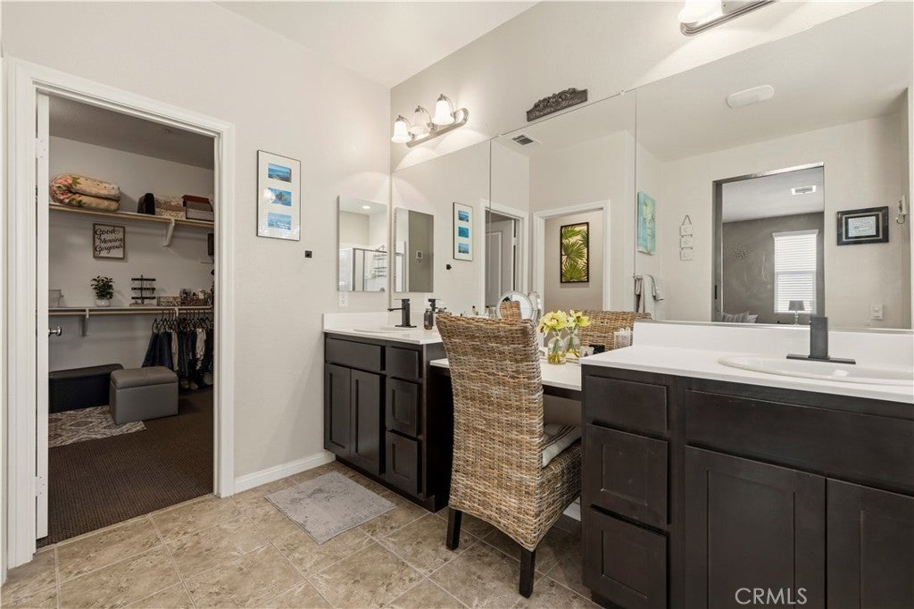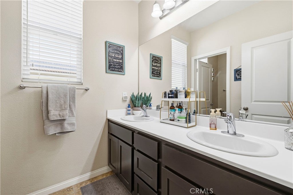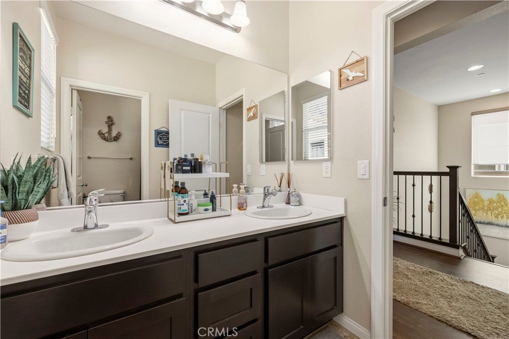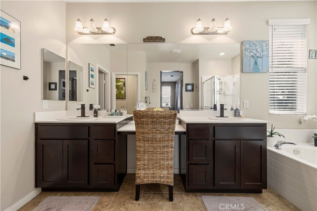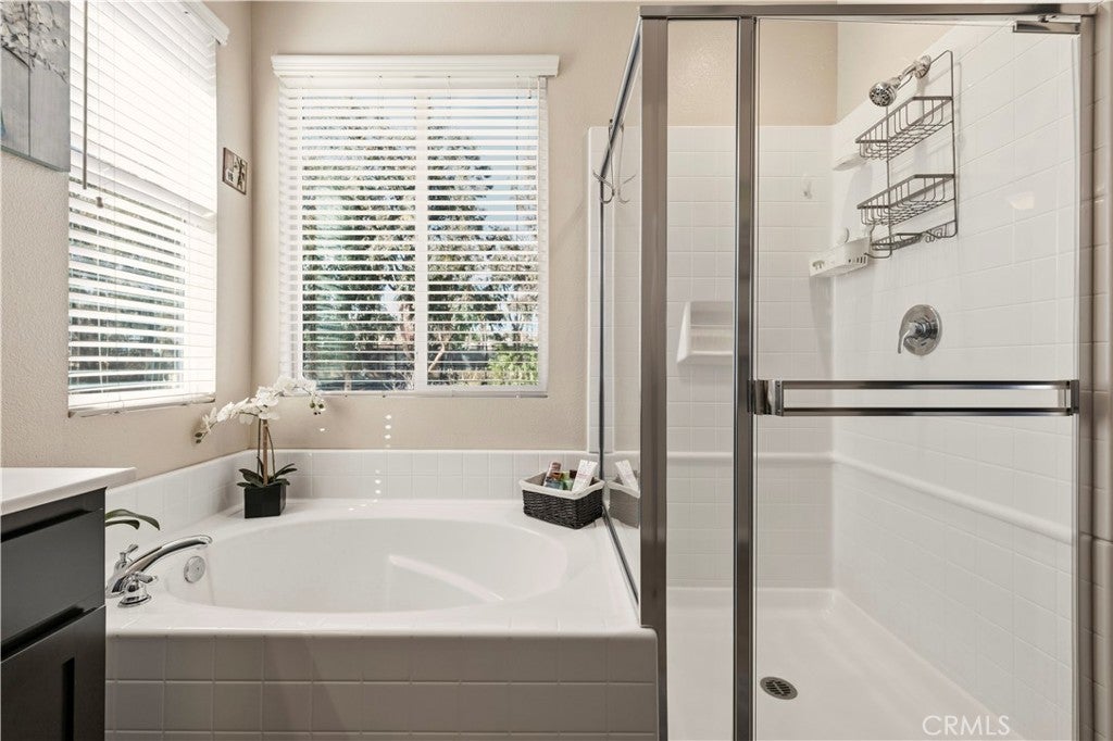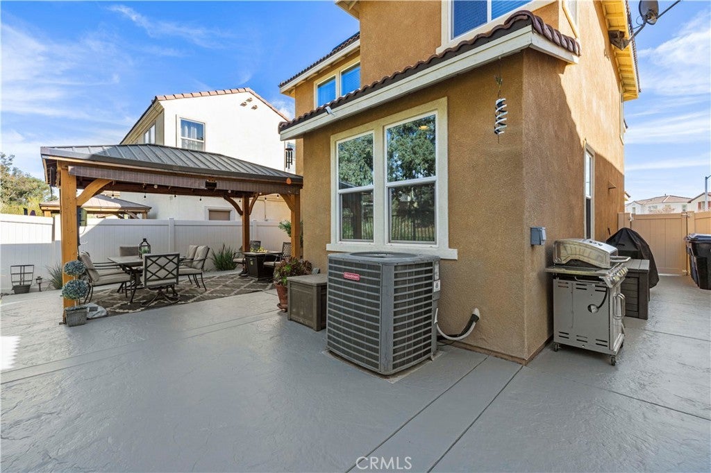 Welcome to 26935 Trestles Drive in the heart of Santa Clarita, located inside a desirable gated community and offering one of the rare full driveways in the neighborhood — allowing for valuable additional parking space. This beautiful 4-bedroom, 3-bathroom home features a highly functional floor plan with a full bedroom and full bathroom downstairs — ideal for guests, extended family, or a private home office. Upon entry, you’re greeted by rich wood flooring that flows seamlessly through the entryway, kitchen, family room, and dining area, creating a warm and inviting atmosphere. The downstairs bedroom features durable vinyl flooring for easy maintenance. The spacious kitchen is the heart of the home, offering granite countertops, an oversized center island perfect for entertaining, a full utility sink, and stainless steel appliances — blending style and functionality for everyday living. Upstairs, vinyl wood-like flooring extends through the hallway leading to all bedrooms. The bedrooms feature upgraded carpet in pristine condition, providing comfort and a true move-in ready feel. The convenient upstairs laundry room offers abundant storage space. The hall bathroom includes a dual-sink vanity and a shower/tub combination. All bedrooms — including the primary suite — are equipped with ceiling fans for added comfort. The primary suite is a true retreat, featuring warm, calming tones that invite relaxation. A custom-built barn door separates the bedroom from the en-suite bath, adding both charm and privacy — perfect for the early riser and the late sleeper. The primary bathroom offers dual sinks, a separate soaking tub, and a walk-in shower. Step outside to a private, low-maintenance backyard with no rear neighbors — offering added privacy and peaceful views. The gazebo will remain, creating the perfect outdoor space for relaxing or entertaining. Additional highlights include solar panels that will be paid off in full at closing, providing energy efficiency and long-term savings. This home truly checks all the boxes — gated community, rare driveway, privacy, solar, and a thoughtful floor plan. Don’t wait — this is the perfect opportunity for your next buyer to call home.