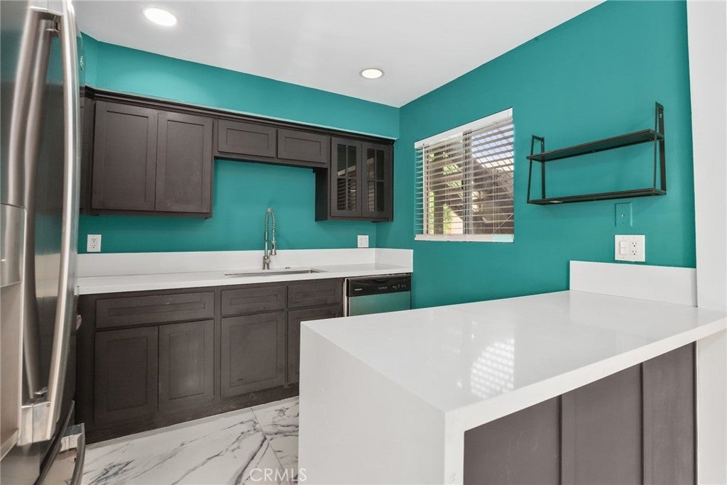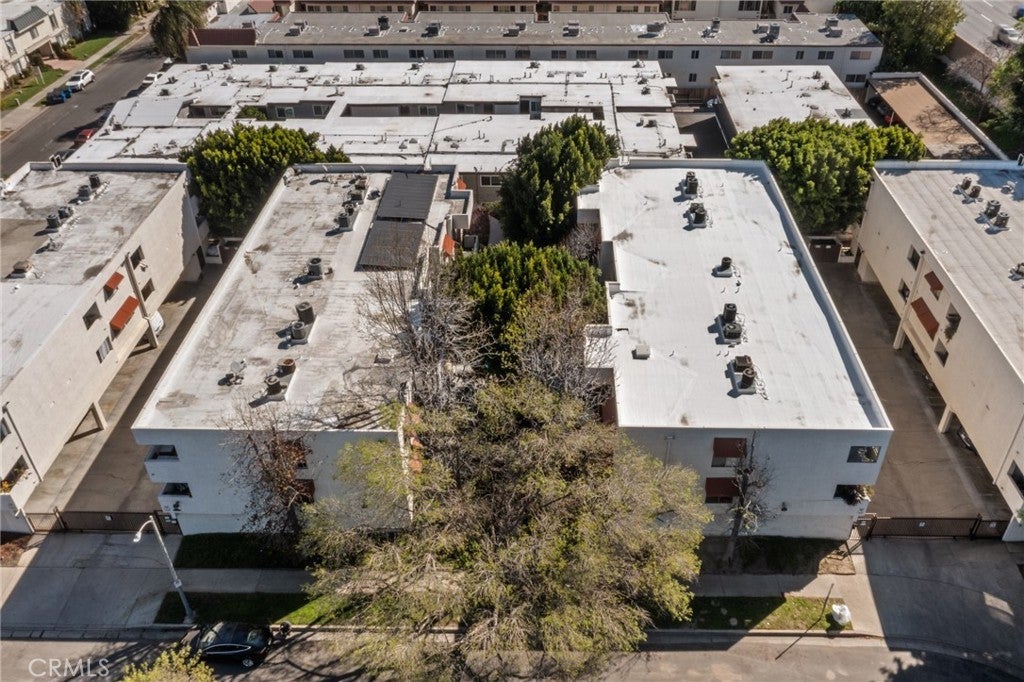 Welcome to The Rose Bud, a charming 36-unit complex with lush landscaping, a gated entry, and a sparkling swimming pool! This 2 BR/1 BA condo has been remodeled to a chic, modern aesthetic with Brazilian porcelain tile flooring throughout and an open-concept living, dining, and kitchen. The kitchen has elegant dark cabinetry; stainless steel appliances, an appealing "waterfall-style" white stone breakfast bar; and stone countertops. Each well-sized bedroom has direct access to the private, covered balcony. The impressive bathroom has a large step-in, tile, and glass shower. This end unit has only one adjoining wall, central AC and heating, and a tandem, 2-car parking space. The HOA includes access to the pool and BBQ area, nearby community laundry, water/sewer/trash, common area maintenance, controlled access entry with video surveillance, gated parking, and exterior insurance. This unit is mere steps from the pool, community laundry, and parking!) Walkable to Ventura Blvd, Nordstrom Rack and Trader Joes.