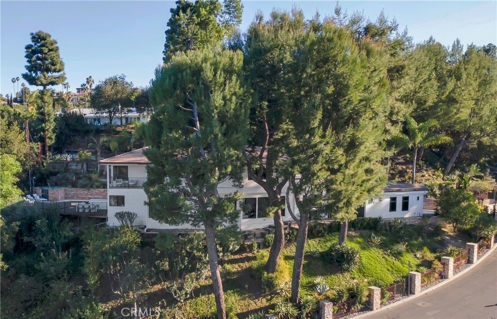 Located on a quiet cul-de-sac in the Encino Hills within the highly sought-after Lanai Road Elementary School district, this beautifully redone gated two-story contemporary residence offers extreme privacy and stunning views from every room. Enter through a security gate to a courtyard with lush greenery and fountains. The first level features a step-down living room and a spacious family room with fireplace and bar, along with a formal dining room enhanced by built-in buffets. The designer kitchen and bathrooms showcase Porcelanosa and Ann Sacks tile, Robern cabinets and backlit mirrors. The kitchen is appointed with bookmatched maple veneer lower cabinetry, white gloss upper cabinets with under-cabinet and floor lighting, quartz countertops with a waterfall edge, and glass-tiled groutless backsplash. A full suite of Miele appliances includes a refrigerator/freezer, convection oven, 5-burner range, hood, and warming drawer, along with a hot and filtered water dispenser and Rohl faucet. A breakfast nook with a built-in table and bench seating provides an inviting dining space. Hardwood and tile floors run throughout. A downstairs bedroom with a ¾ bath completes the main level. Upstairs are three bedrooms, including the luxurious primary suite featuring a fireplace, balcony, and an expansive walk-in closet with island. The spa-inspired primary bath offers an oversized shower with multiple shower heads and bench seating, plus a chromatherapy soaking tub. An upstairs laundry room adds convenience. The lushly landscaped grounds include stacked stone accents, colorful succulents, a lap pool and spa with Pebble Tec plaster, a dramatic five-level waterfall, a large Trex deck, and a barbecue area—perfect for entertaining. Additional highlights include custom lighting throughout, Fleetwood windows and doors, new glass garage doors, a newer roof, and an enclosed coyote-safe area for pets.