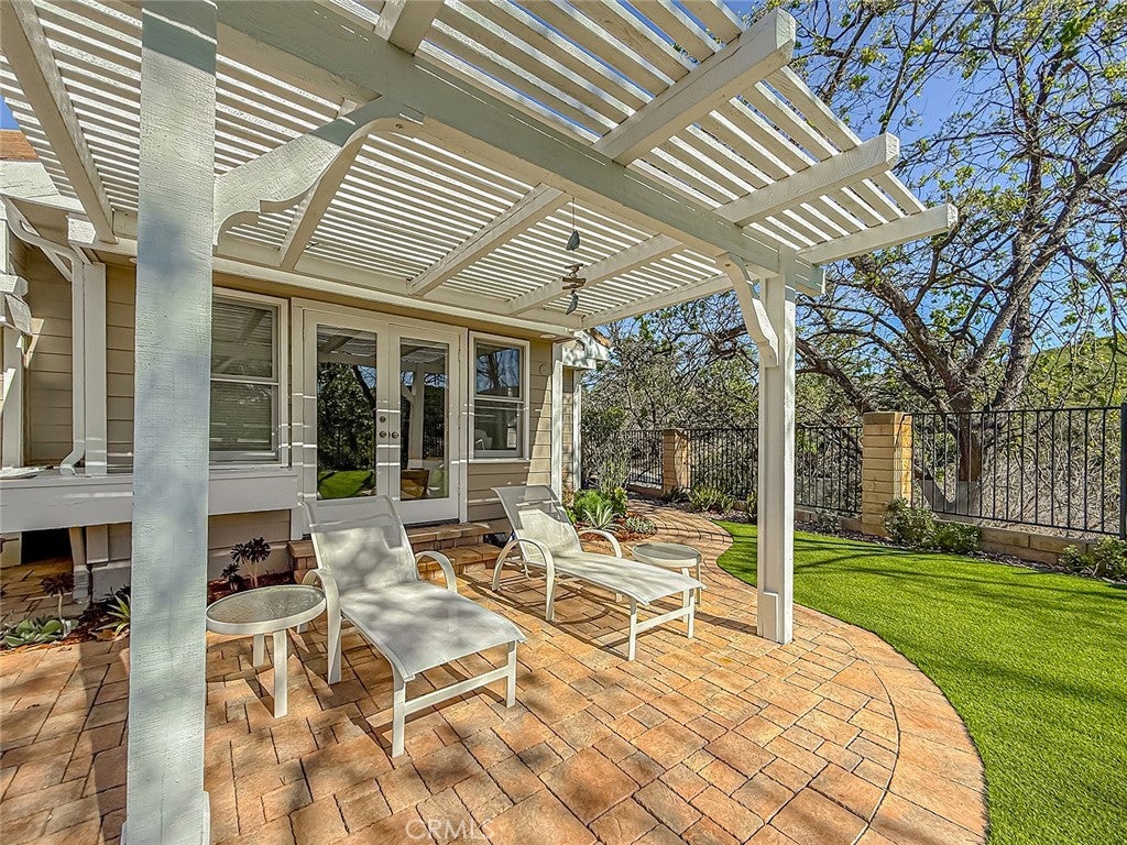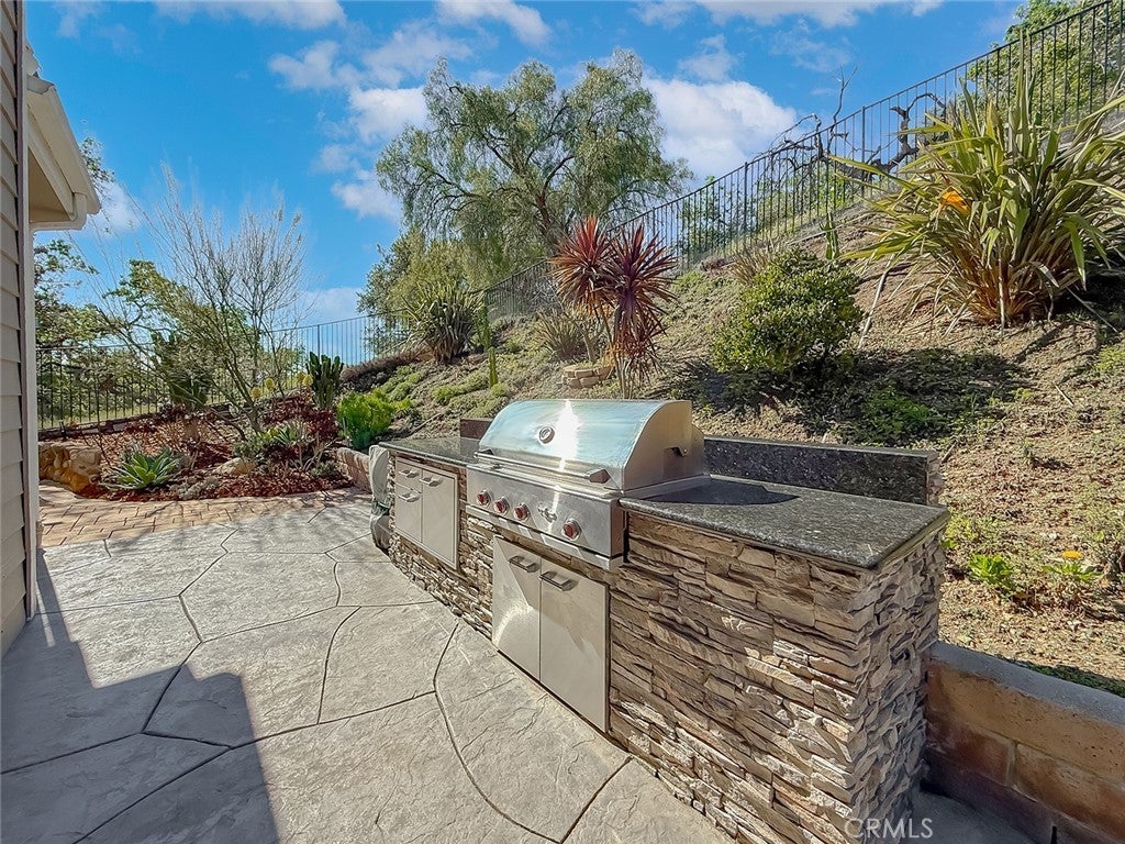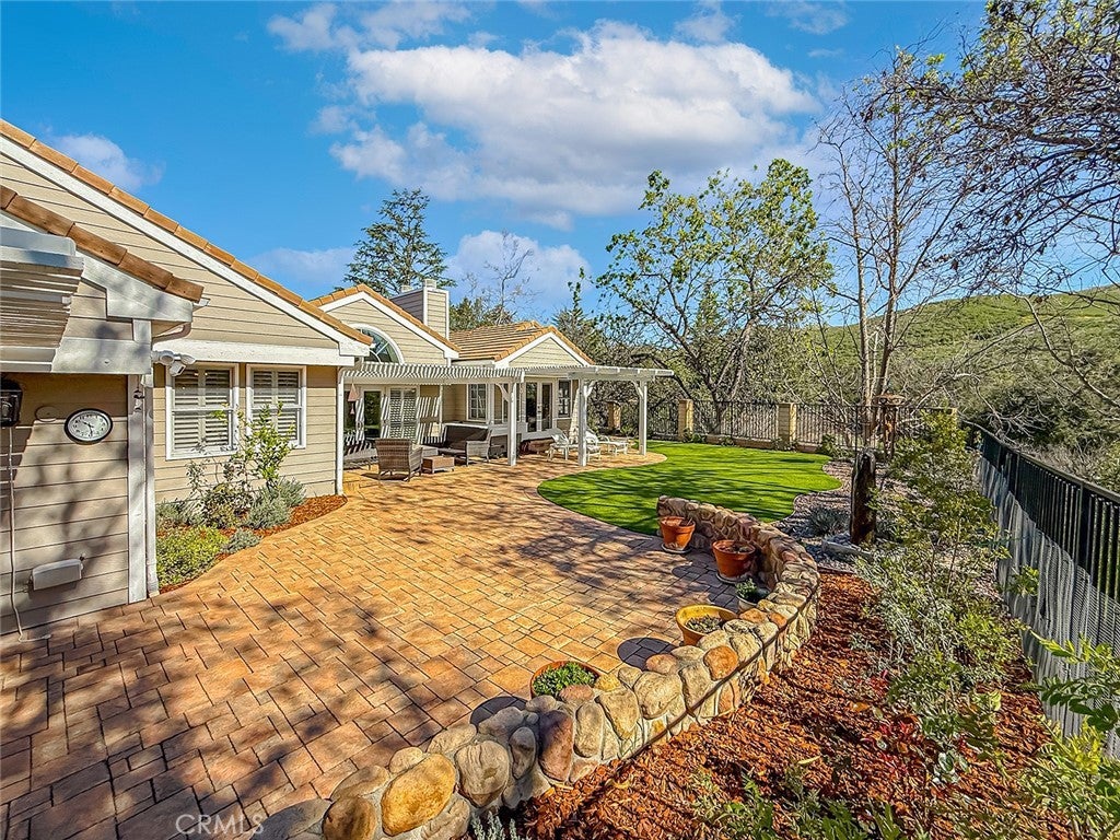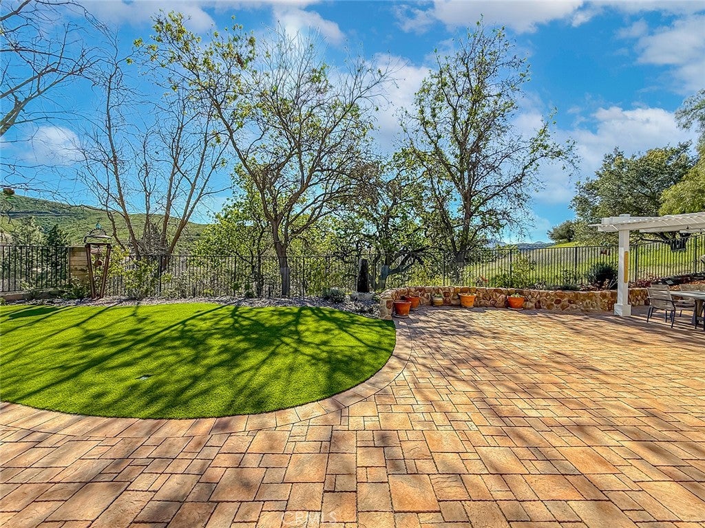 This gorgeous, highly sought after, ranch home embodies what Thousand Oaks living is all about. Upon entering, the peaceful backdrop of tree lined rolling hills greets you immediately. There is no escaping the beauty of nature from any room in this home. The many updated windows in every living area provide endless views of mature trees and greenery. The high ceilings allow for tons of natural light and add to the feeling of being transported into the countryside. With over 3200 sq ft, this single-story home offers four bedrooms and 4 bathrooms. The layout is ideal with the primary located on one side of the home and the other three rooms on the other. One bedroom is currently being used as an office with solid built-in desks providing functionality. Designed with a seamless flow for daily living, the floorplan offers a renovated kitchen with an eating area that opens to the family room and directly to the outdoor area which is professionally landscaped and equipped with tasteful pavers, a built-in BBQ, and covered patios. There is also a formal dining room, living room, and bar area, which all overlook the outdoor scenery and lend the home to effortless entertaining. The primary bedroom is a true escape designed with detail in mind. The large room has a picture window view of the backyard, the closet has been enlarged and custom fitted for optimal storage and function, and the jetted tub and double sink with a vanity built in offer spa-like luxury. The large laundry room leads to the 3-car garage. One bay has been remodeled with added storage and a large tool bench. On the other side of the home, you will find three other bedrooms. One of those secondary bedrooms has a large en-suite bath which could be a great option for guests, in-laws, or children. This home offers all renovated bathrooms, ample cabinets throughout the home, custom shutters, leased solar that keeps electrical bills very low, a security system in place, surround sound in the family room, wiring for an EV charger, and 3 Ring cameras. The real star of the show is the yard and the views from it. Perched on the hill, the view goes on for miles, nature is all around you, and you cannot miss the sheer calm that this home provides. The HOA includes a basketball/sport court, a tennis court and walking trails. You do not want to miss it!!