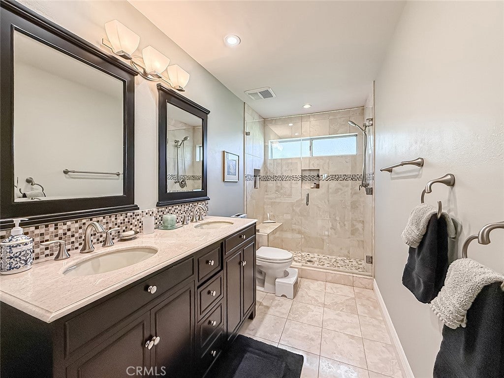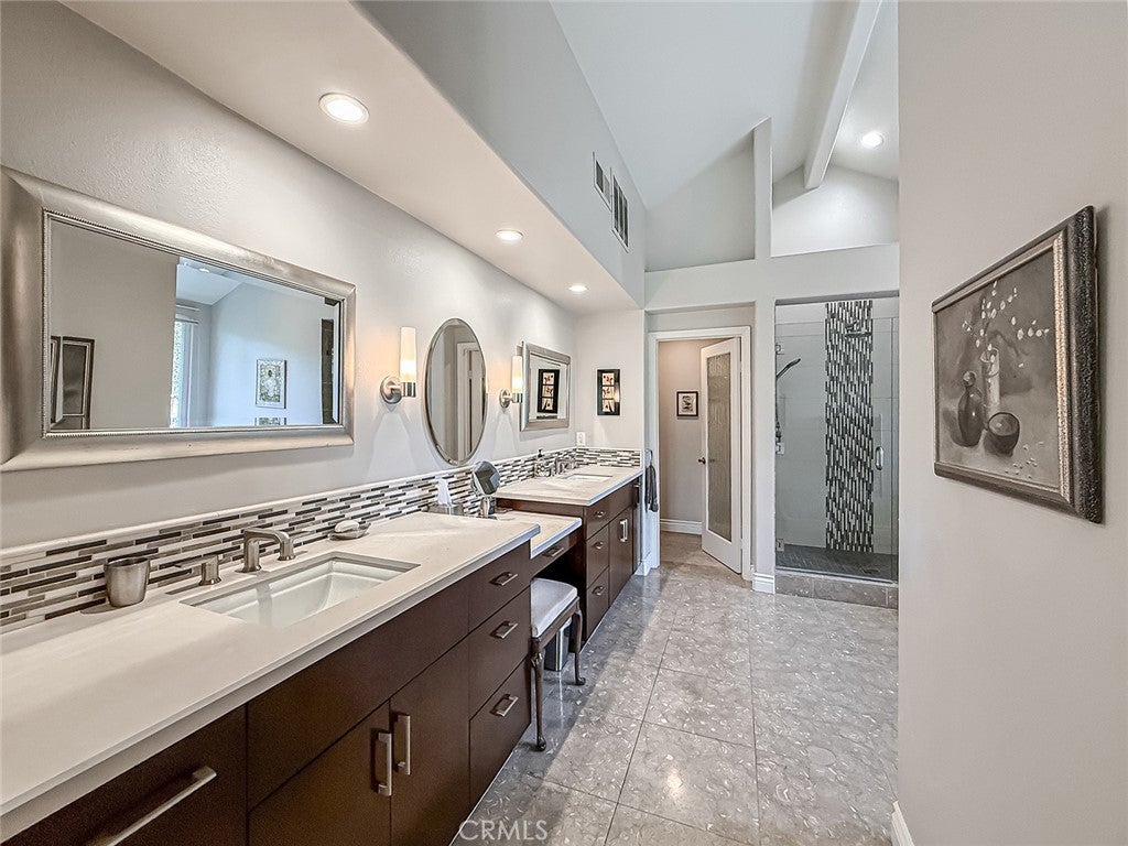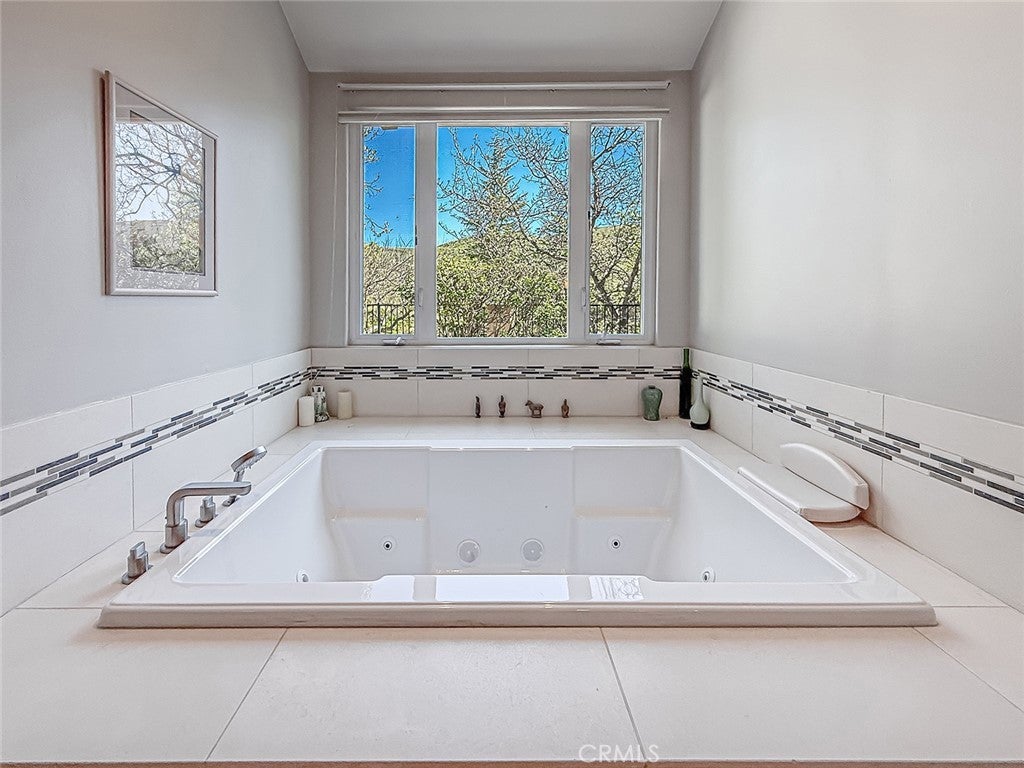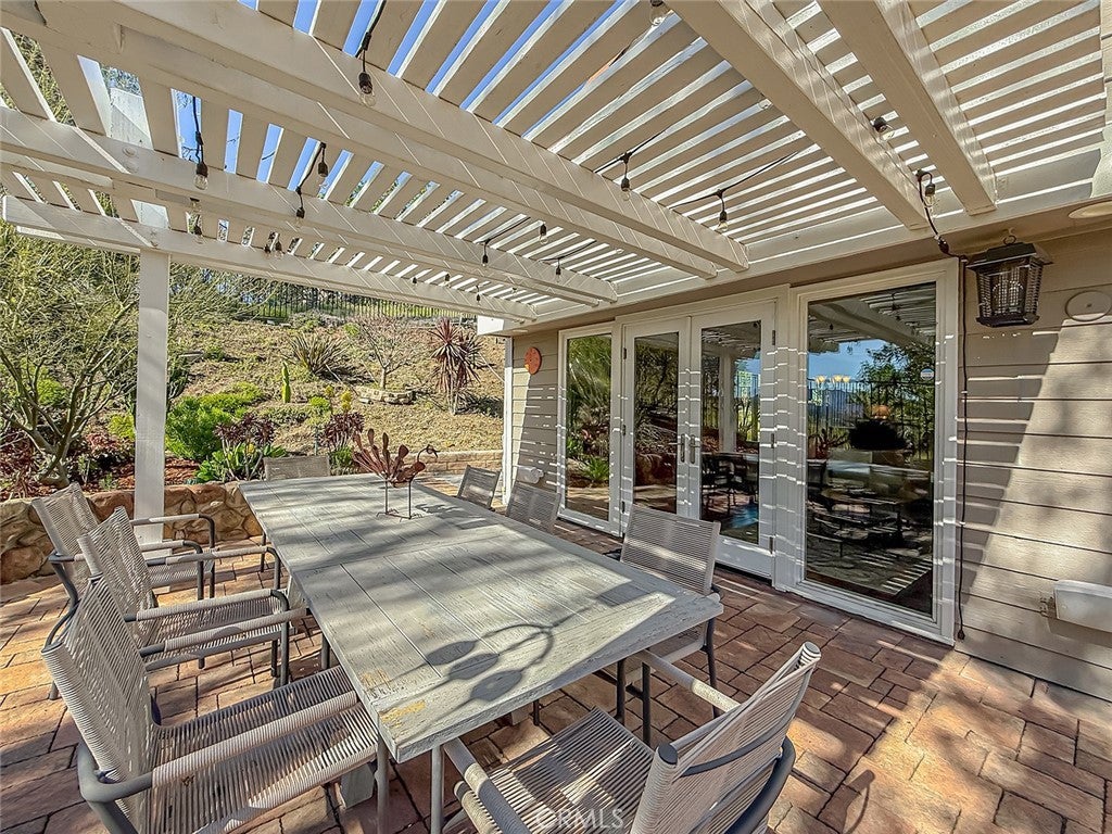 This gorgeous, highly sought after, ranch home embodies what Thousand Oaks living is all about. Upon entering, the peaceful backdrop of tree lined rolling hills greets you immediately. There is no escaping the beauty of nature from any room in this home. The many updated windows in every living area provide endless views of mature trees and greenery. The high ceilings allow for tons of natural light and add to the feeling of being transported into the countryside. With over 3200 sq ft, this single-story home offers four bedrooms and 4 bathrooms. The layout is ideal with the primary located on one side of the home and the other three rooms on the other. One bedroom is currently being used as an office with solid built-in desks providing functionality. Designed with a seamless flow for daily living, the floorplan offers a renovated kitchen with an eating area that opens to the family room and directly to the outdoor area which is professionally landscaped and equipped with tasteful pavers, a built-in BBQ, and covered patios. There is also a formal dining room, living room, and bar area, which all overlook the outdoor scenery and lend the home to effortless entertaining. The primary bedroom is a true escape designed with detail in mind. The large room has a picture window view of the backyard, the closet has been enlarged and custom fitted for optimal storage and function, and the jetted tub and double sink with a vanity built in offer spa-like luxury. The large laundry room leads to the 3-car garage. One bay has been remodeled with added storage and a large tool bench. On the other side of the home, you will find three other bedrooms. One of those secondary bedrooms has a large en-suite bath which could be a great option for guests, in-laws, or children. This home offers all renovated bathrooms, ample cabinets throughout the home, custom shutters, leased solar that keeps electrical bills very low, a security system in place, surround sound in the family room, wiring for an EV charger, and 3 Ring cameras. The real star of the show is the yard and the views from it. Perched on the hill, the view goes on for miles, nature is all around you, and you cannot miss the sheer calm that this home provides. The HOA includes a basketball/sport court, a tennis court and walking trails. You do not want to miss it!!