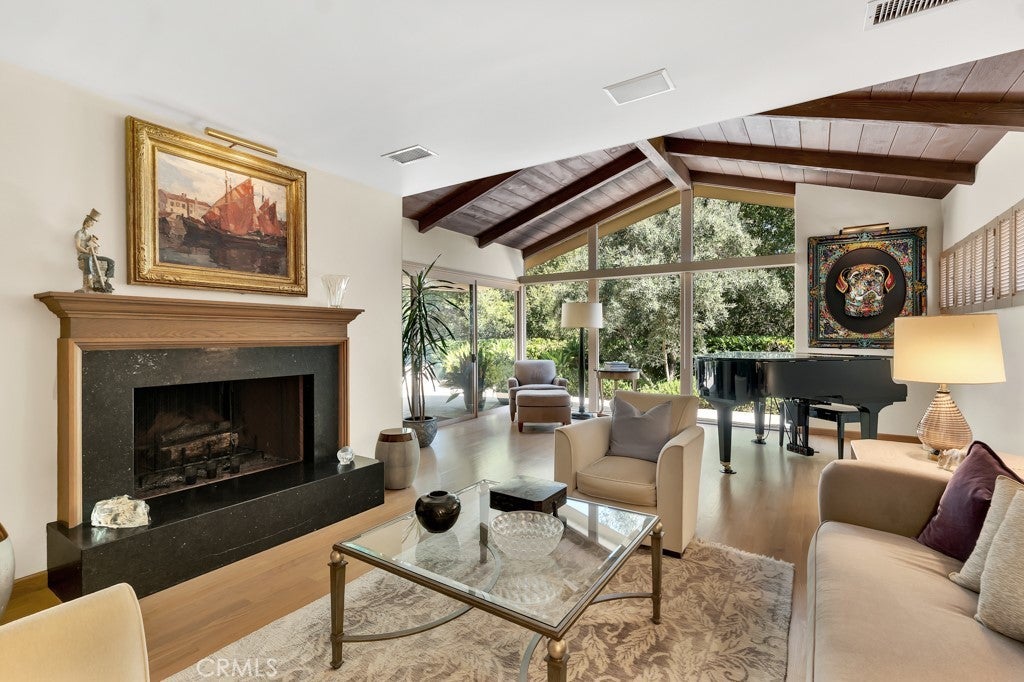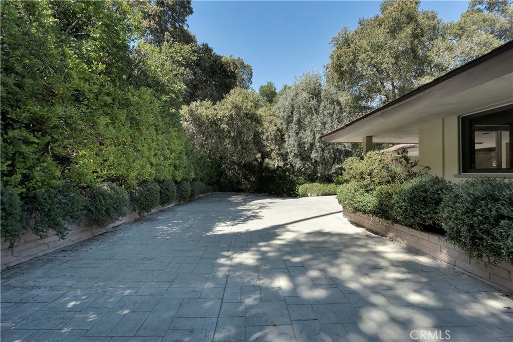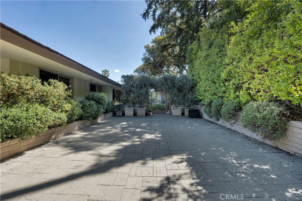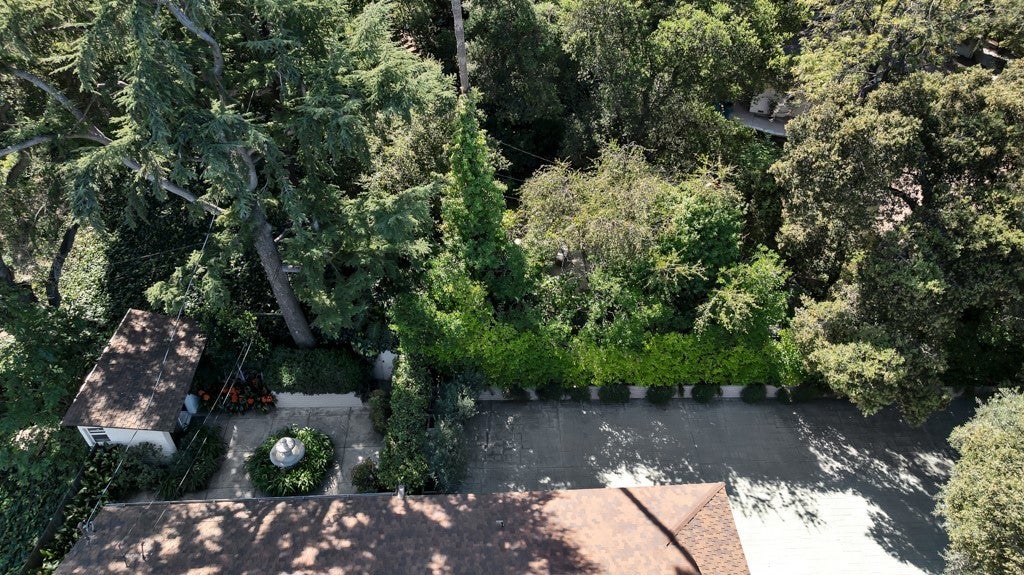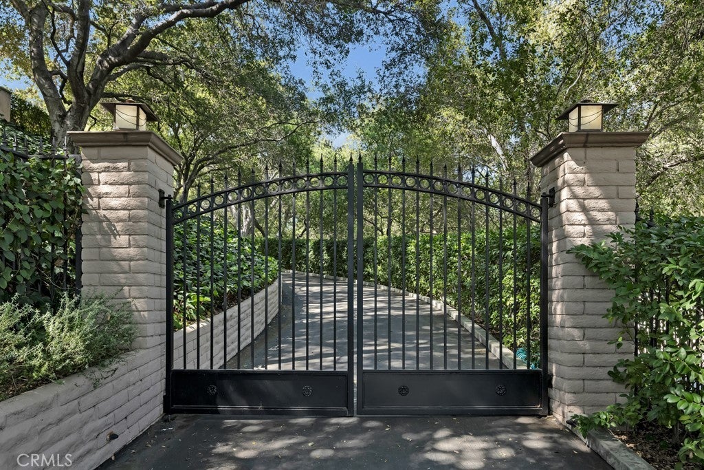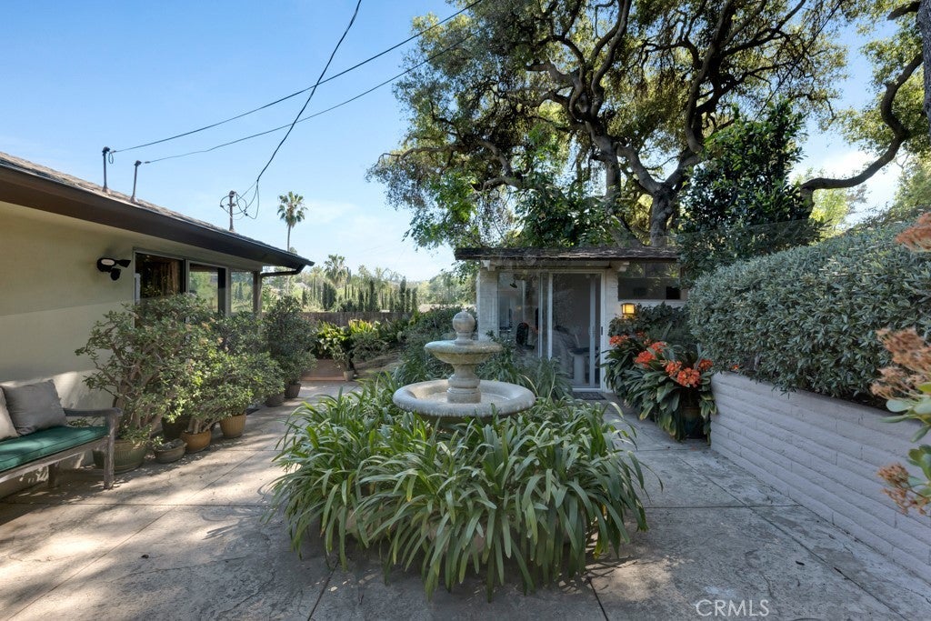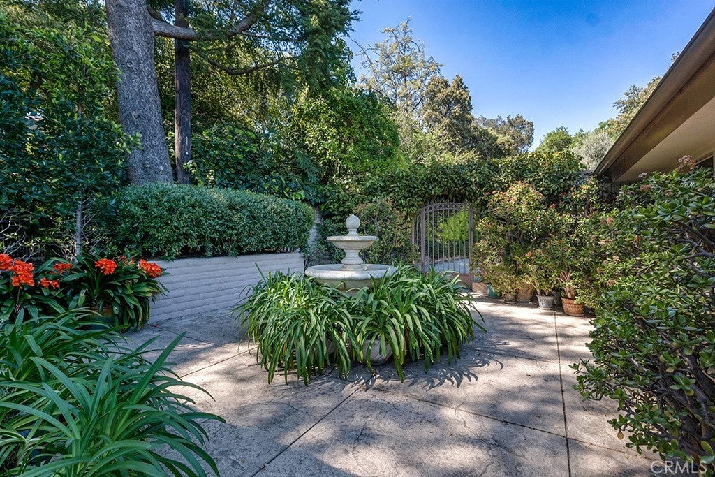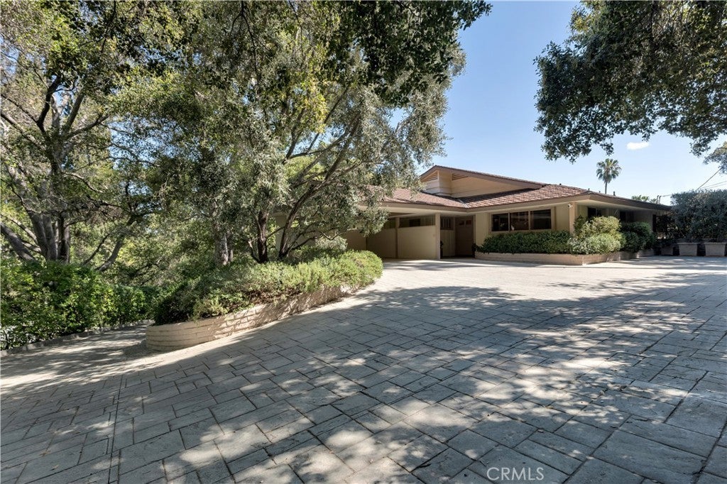 First time on the market in 50 years, this gated property offers the ultimate in privacy and is located in the highly desirable Lanai Road School District. The driveway winds through a forested lot of nearly 20,000 square feet, surrounded by graceful oak trees, olive trees, and other mature landscaping, and leads to a charming gated courtyard with a fountain. The single-story Mid-Century home features 3 bedrooms and 2.5 bathrooms. The living room showcases a French limestone fireplace, a wall of windows topped with clerestory windows, a beamed ceiling, and built-in bookcases, creating a bright and inviting space. The kitchen is appointed with granite counters and a Sub-Zero refrigerator/freezer. Hardwood floors run throughout most of the home, with carpeting in two bedrooms. The dining room features expansive wine-refrigerated closets and French doors that open to a covered patio with a spa/fountain finished in Pebble Tec plaster—perfect for indoor-outdoor entertaining. The primary suite offers an updated marble bathroom with dual vanities, a separate shower, and a soaking tub. A secondary bedroom is en suite with an updated three-quarter bathroom, while the third bedroom has been converted to an office with built-in desk and bookcases. Additional amenities include speakers throughout, a security system with cameras, a powder room off the foyer, and a laundry room with sink. A detached accessory room with speakers and air conditioning—currently used as a gym—adds flexible space to this special property.