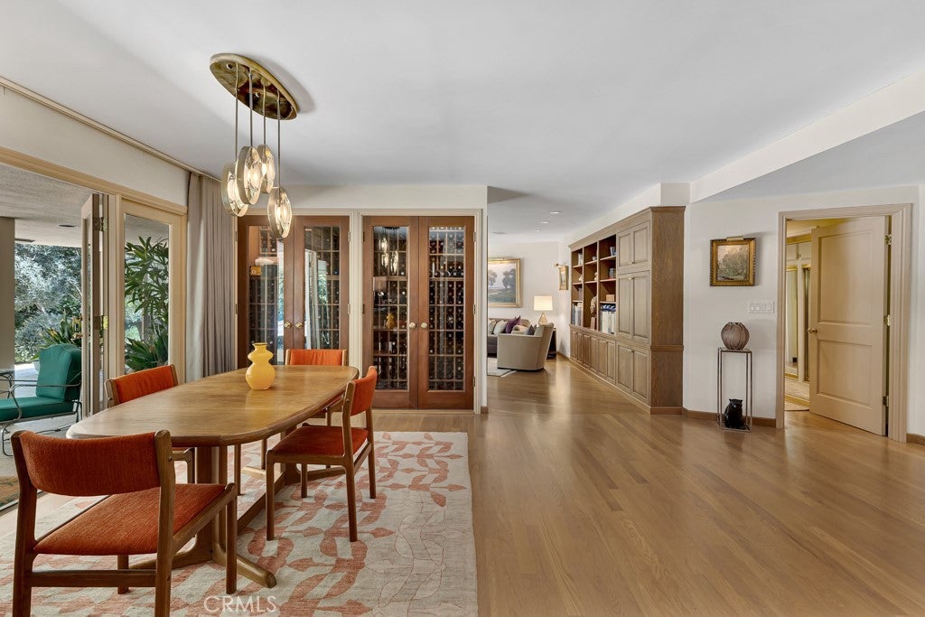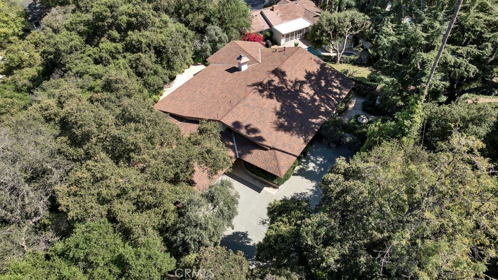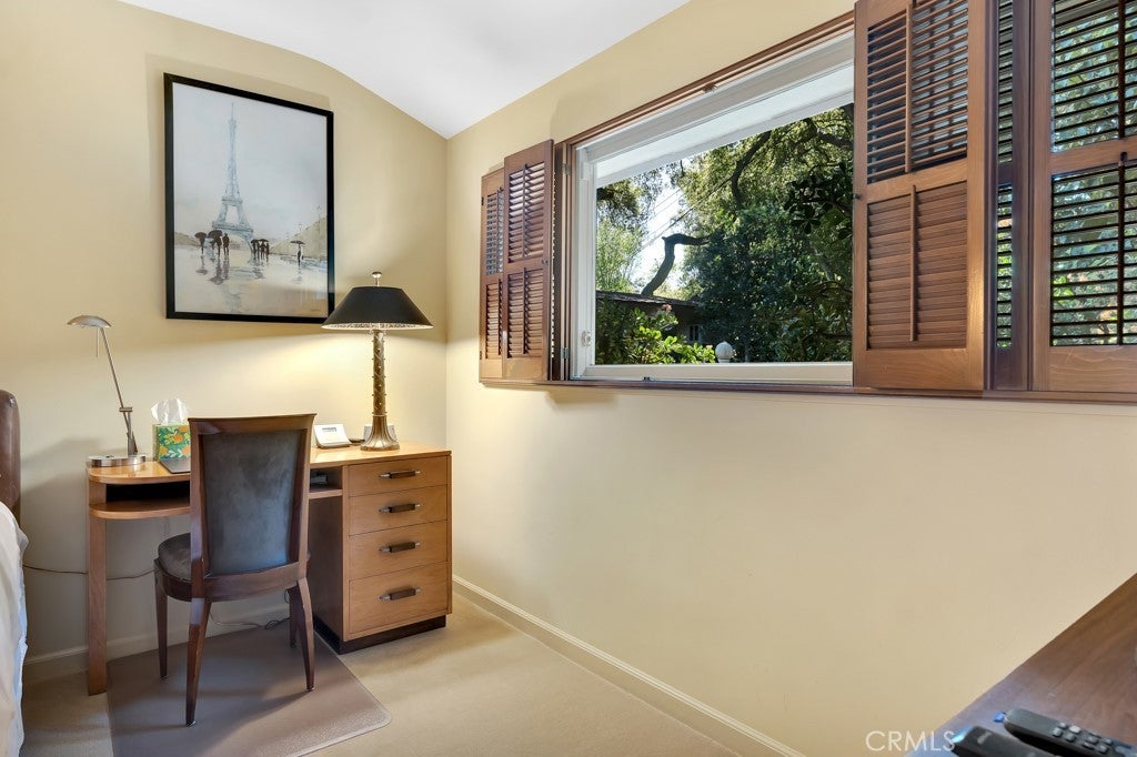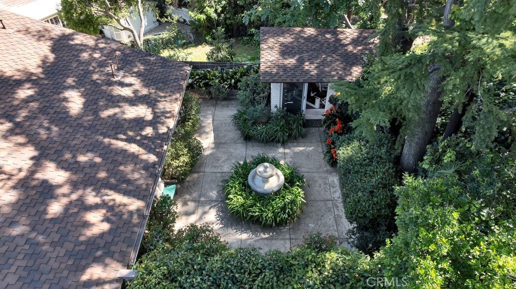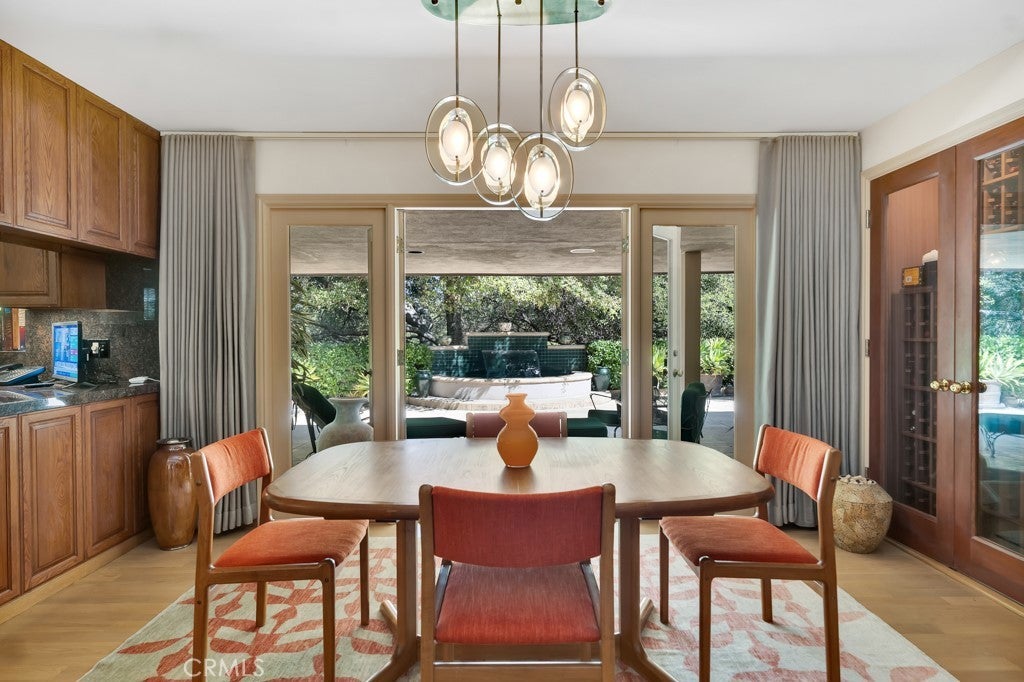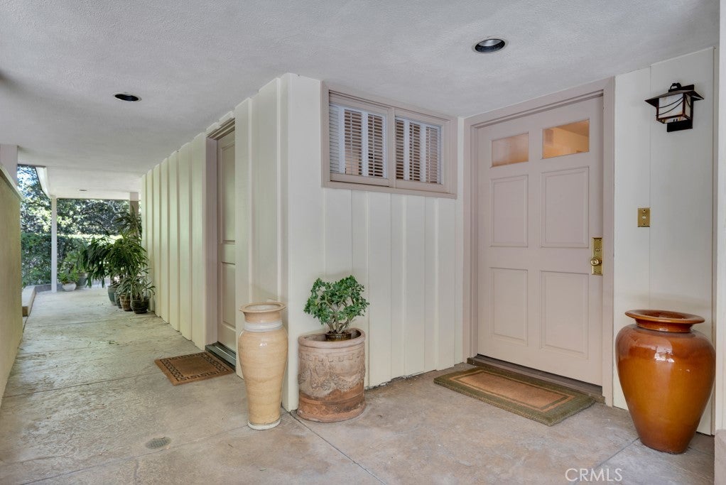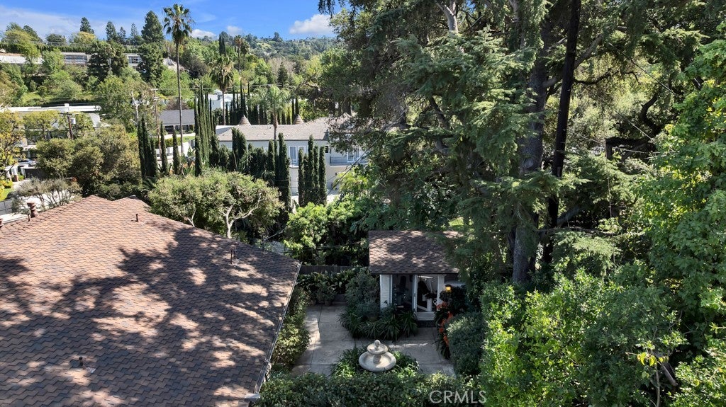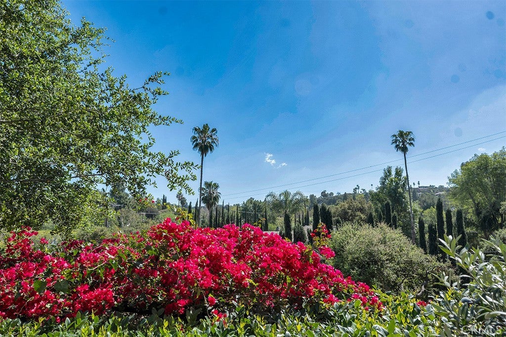 First time on the market in 50 years, this gated property offers the ultimate in privacy and is located in the highly desirable Lanai Road School District. The driveway winds through a forested lot of nearly 20,000 square feet, surrounded by graceful oak trees, olive trees, and other mature landscaping, and leads to a charming gated courtyard with a fountain. The single-story Mid-Century home features 3 bedrooms and 2.5 bathrooms. The living room showcases a French limestone fireplace, a wall of windows topped with clerestory windows, a beamed ceiling, and built-in bookcases, creating a bright and inviting space. The kitchen is appointed with granite counters and a Sub-Zero refrigerator/freezer. Hardwood floors run throughout most of the home, with carpeting in two bedrooms. The dining room features expansive wine-refrigerated closets and French doors that open to a covered patio with a spa/fountain finished in Pebble Tec plaster—perfect for indoor-outdoor entertaining. The primary suite offers an updated marble bathroom with dual vanities, a separate shower, and a soaking tub. A secondary bedroom is en suite with an updated three-quarter bathroom, while the third bedroom has been converted to an office with built-in desk and bookcases. Additional amenities include speakers throughout, a security system with cameras, a powder room off the foyer, and a laundry room with sink. A detached accessory room with speakers and air conditioning—currently used as a gym—adds flexible space to this special property.