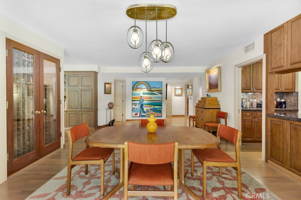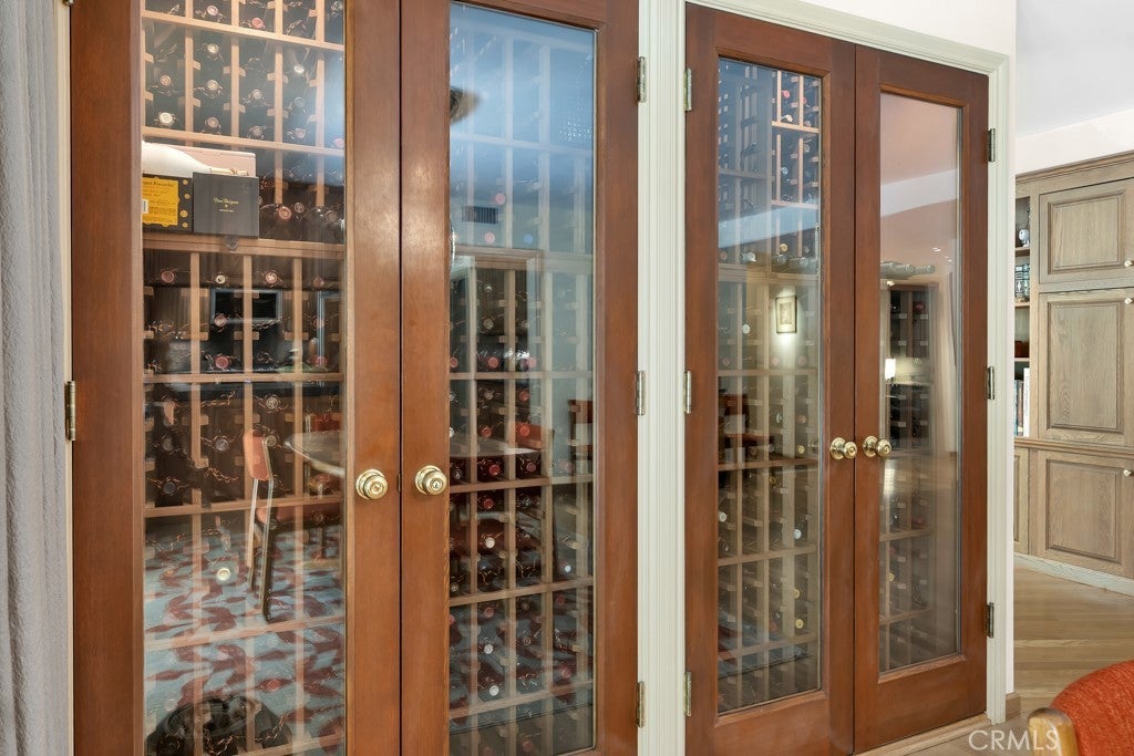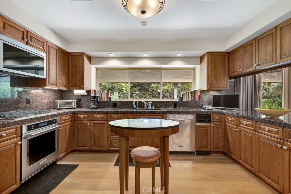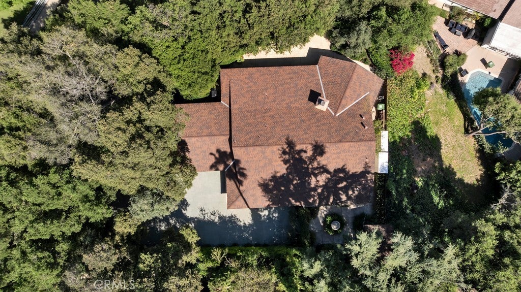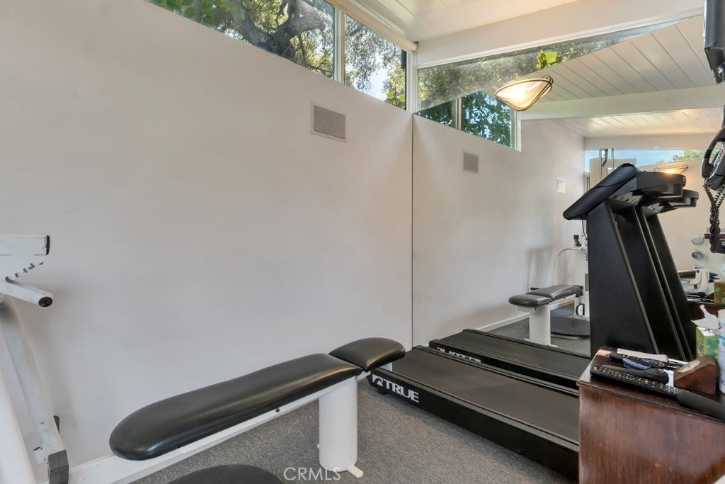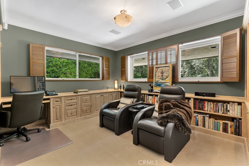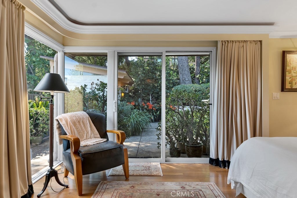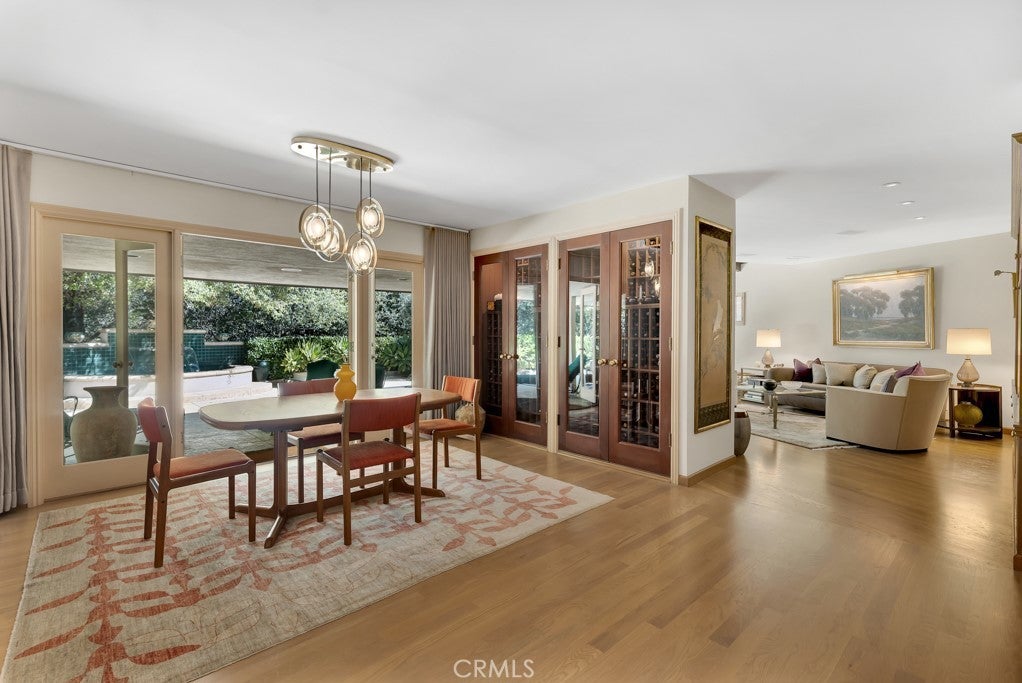 First time on the market in 50 years, this gated property offers the ultimate in privacy and is located in the highly desirable Lanai Road School District. The driveway winds through a forested lot of nearly 20,000 square feet, surrounded by graceful oak trees, olive trees, and other mature landscaping, and leads to a charming gated courtyard with a fountain. The single-story Mid-Century home features 3 bedrooms and 2.5 bathrooms. The living room showcases a French limestone fireplace, a wall of windows topped with clerestory windows, a beamed ceiling, and built-in bookcases, creating a bright and inviting space. The kitchen is appointed with granite counters and a Sub-Zero refrigerator/freezer. Hardwood floors run throughout most of the home, with carpeting in two bedrooms. The dining room features expansive wine-refrigerated closets and French doors that open to a covered patio with a spa/fountain finished in Pebble Tec plaster—perfect for indoor-outdoor entertaining. The primary suite offers an updated marble bathroom with dual vanities, a separate shower, and a soaking tub. A secondary bedroom is en suite with an updated three-quarter bathroom, while the third bedroom has been converted to an office with built-in desk and bookcases. Additional amenities include speakers throughout, a security system with cameras, a powder room off the foyer, and a laundry room with sink. A detached accessory room with speakers and air conditioning—currently used as a gym—adds flexible space to this special property.