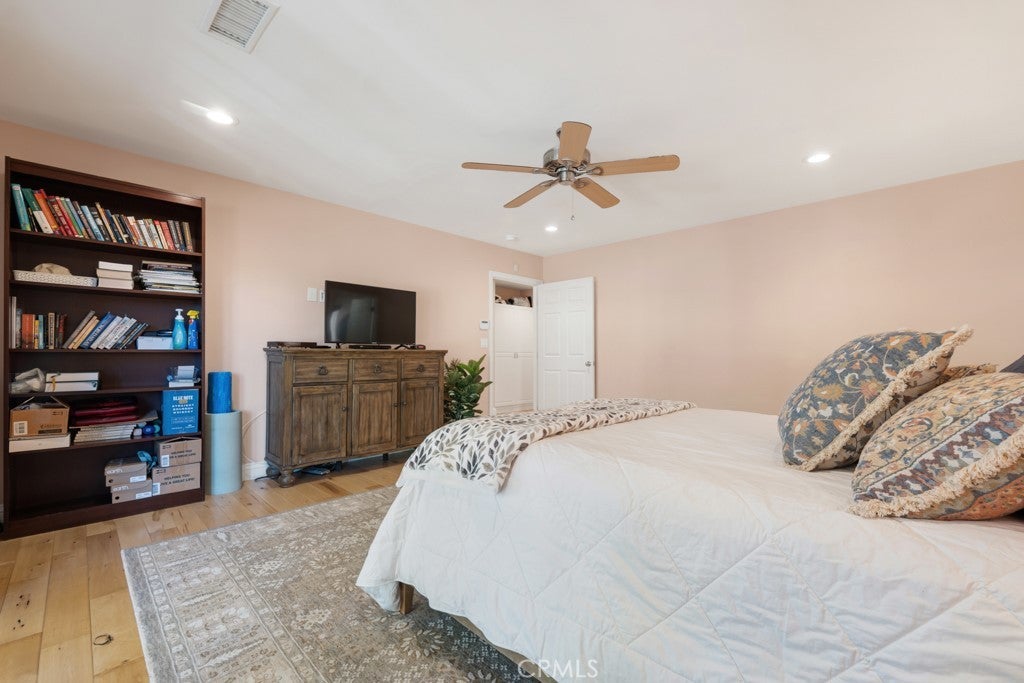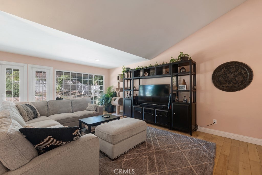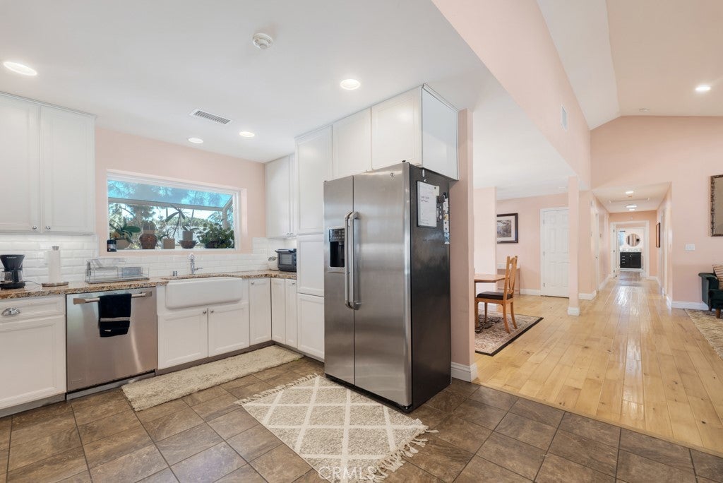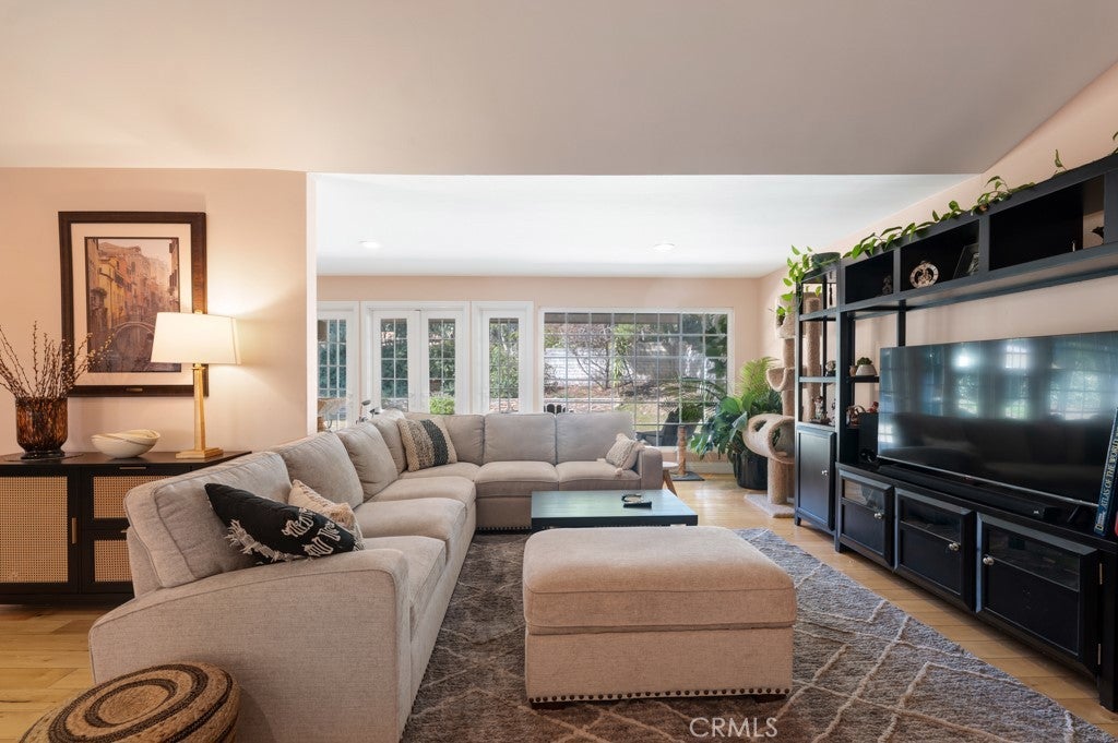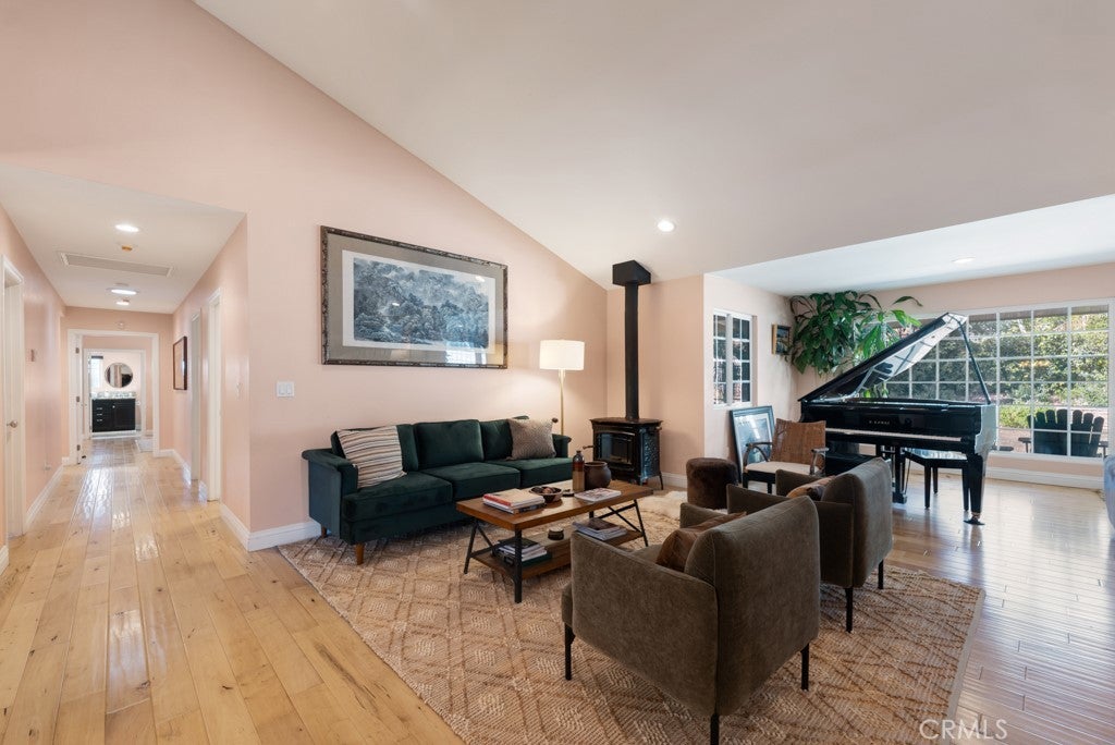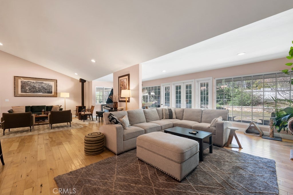 Nestled in the highly sought-after Knollwood Country Club Estates, this beautiful single-story estate offers 4 bedrooms, 3 bathrooms, 2,687 sq ft of living space, and sits on a rare 0.38-acre flat lot surrounded by tall, lush trees that create a private and tranquil setting, with a backyard ready for your vision. Stepping inside, the home is filled with abundant natural light and showcases recessed lighting and beautiful hardwood white oak flooring throughout. A welcoming foyer with a coat storage closet opens to a spacious open floor plan featuring vaulted ceilings and a wood-burning stove fireplace. The formal dining area showcases bay windows overlooking the front yard. The kitchen flows seamlessly into the living room and features large granite countertops, countertop seating, abundant cabinetry, a farmer’s sink, and essential appliances. The living room offers excellent natural light from large windows facing the backyard, with a subtle architectural divider creating a sense of separation and defined living spaces, along with multiple venting French doors that open to the backyard patio for effortless indoor-outdoor flow. The private bedroom wing includes a large primary suite with French doors to its own patio, an ensuite bathroom with dual vanity, soaking tub, walk-in shower, and an expansive custom walk-in closet featuring two separate rooms, skylights, and direct backyard access. Two guest bedrooms share a Jack-and-Jill bathroom, ideal for siblings or shared living, while the third bedroom across the hall is well-suited for an office or guest suite. The full hallway bathroom includes a walk-in shower, linen closet, and stackable washer and dryer space for added convenience. The front yard features drought-resistant landscaping with decorative rocks and pebbles, along with a walkway leading to a spacious side yard area positioned at the front side of the home, providing additional usable outdoor space. The backyard presents exceptional potential and serves as a blank canvas for the next owner, offering a large covered patio, side patio, access to the attached two-car garage, and an expansive flat yard ready for a buyer’s dream development. Ideally situated in Granada Hills, the property at 12349 Kenny Drive enjoys close proximity to Knollwood Country Club, nearby hiking trails, and Granada Hills Town Center & Village for convenient shopping and dining. Don’t miss this opportunity in one of the community’s most desirable neighborhoods.
