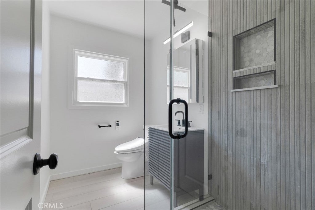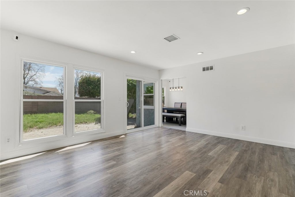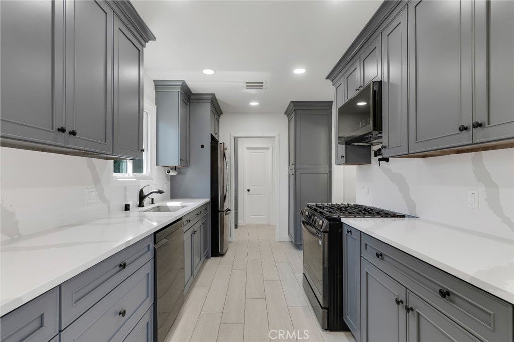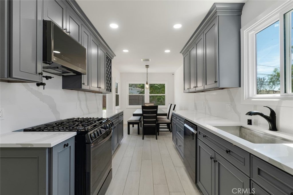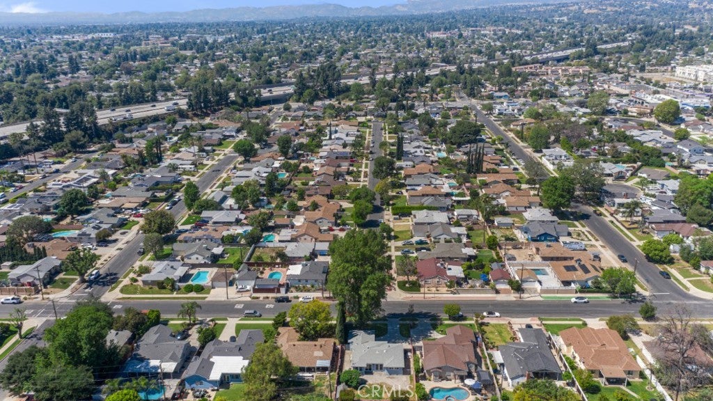 Set beneath a big shade tree on a curved drive in a desirable Granada Hills neighborhood, this recently refreshed 3-bedroom, 2-bath, 1,264 sq ft single-story home captures the easy appeal of a classic mid-century SoCal rambler while introducing a crisp, contemporary finish throughout. A half wall at the entry opens to a bright, inviting living room filled with natural light from large windows and a sleek glass slider that extends the living space to the backyard patio. A large archway connects to the informal dining area/sunny breakfast nook and adjacent updated galley kitchen, where shaker-style cabinetry, contemporary hardware, quartz counters, and a full quartz backsplash create a clean, current feel that still complements the home’s original character. Newer dual-pane windows and a tankless water heater add comfort and efficiency. Both bathrooms have been remodeled, including an updated 3/4 bath with a glass-enclosed shower and a full bath with a new vanity. The bedrooms are well-sized and functional, with mirrored closets, ceiling fans, and generous windows that keep the spaces light and airy. Outside, the backyard is designed for everyday enjoyment with a herringbone-pattern stamped concrete patio, lawn area, large storage shed, and a wide gated side yard that may accommodate additional parking. Located in one of Granada Hills’ established residential pockets known for its friendly neighborhood feel, highly rated schools, and convenient access to nearby shopping, dining, parks, and commuter routes, this is a move-in-ready home that balances updated style with enduring mid-century appeal. Don’t let this one pass you by!