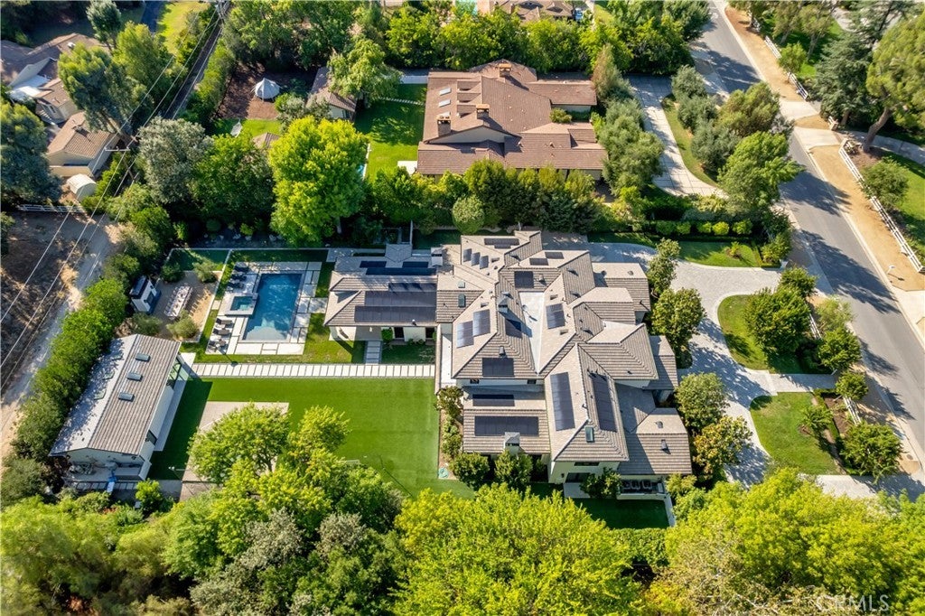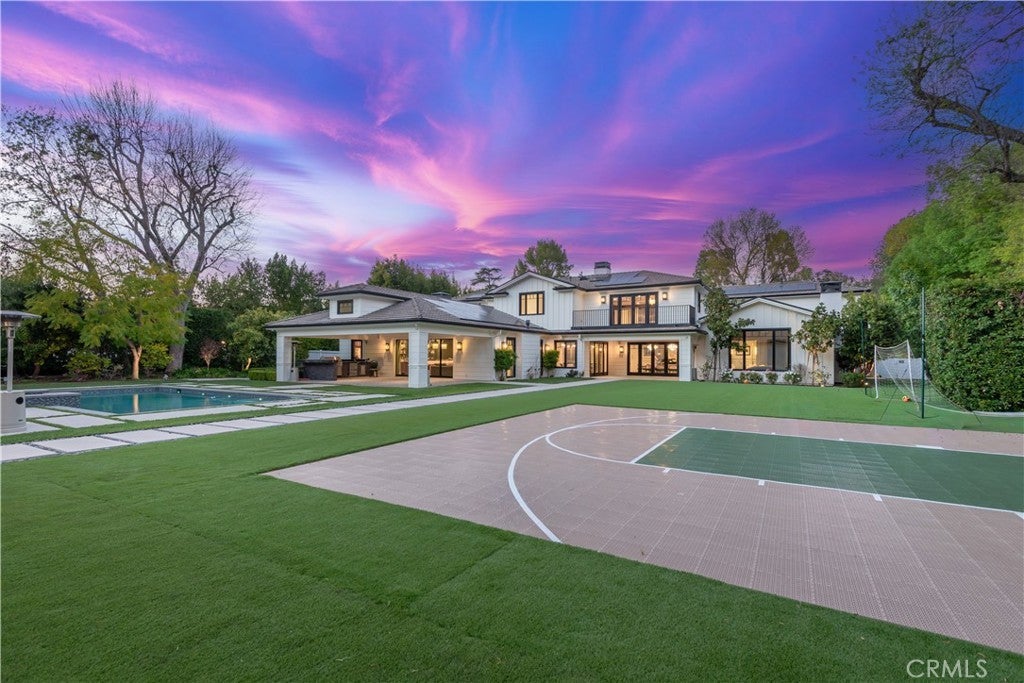 This model sharp and highly upgraded estate residence, complete with a new guest house, is sited on a superb 1.13 acre completely flat lot! Beautifully finished throughout, the home features a sunny open floor plan with a gorgeous, center island chef's kitchen, big adjoining breakfast room, all wide open to the great room & lounge with wet bar & temperature controlled wine room, plus a custom study, home theater, and a superb primary suite with an all stone bath, steam shower, enormous, room sized closets and adjoining glam room. The expansive family room has sliding walls of glass that open to the big backyard, highlighted by a large covered entertaining patio with full barbecue center, a sparkling pool & spa, sports court, big lawn with fireplace & outdoor dining area, and a guest house complete with steam & sauna, all nestled amongst mature trees. Additional amenities include heated floors in all upstairs bathrooms, a voice activated smart home system, a central vacuum system, owned solar power system, whole house 48 kilowatt generator, and a four-car garage, complete with custom cabinetry and 220 volt wiring for electric car chargers.