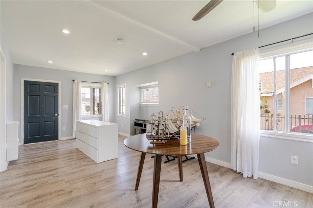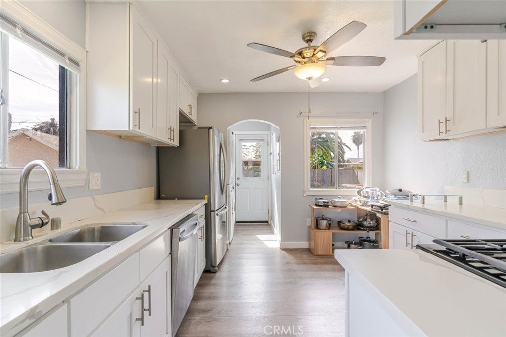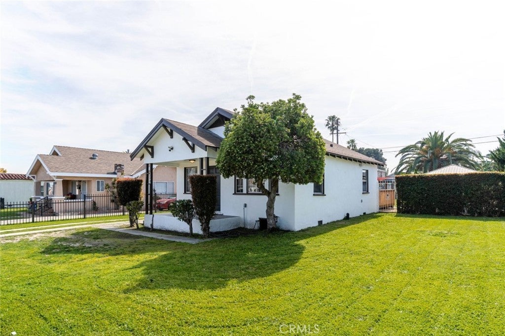 Charming 1920, 2-bed, 1-bath home in Los Angeles, Metropolitan Southwest! Behind an electric gate (controlled with an app), you are greeted with a large front lawn, long parking area, and cozy front patio. Enter the 907 sqft home into a bright and open living space showcasing new paint and flooring throughout, recessed lighting, ceiling fan/light fixture, and plenty of room for lounging, dining, and entertaining. Carry on into the recently remodeled kitchen equipped with beautiful countertops, great cabinet space, stainless-steel appliances, a double-basin sink, and hallway with stackable washer/dryer hookups and storage. Both bedrooms offer good-sized closets and ceiling fan/light fixtures, while the primary has direct access to the backyard deck. On a 8,969 sqft lot, the backyard is huge! Relax on the deck or patio, and enjoy the large lawn space. The 2-car detached garage offers additional storage space and as an attached pergola patio. Additional features include new plumbing in the entire house, and the whole house has been rewired. Located close to markets, parks, shopping, and freeway access.