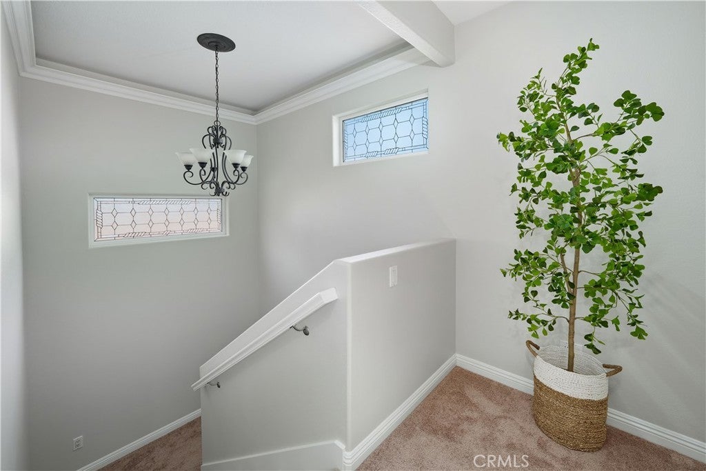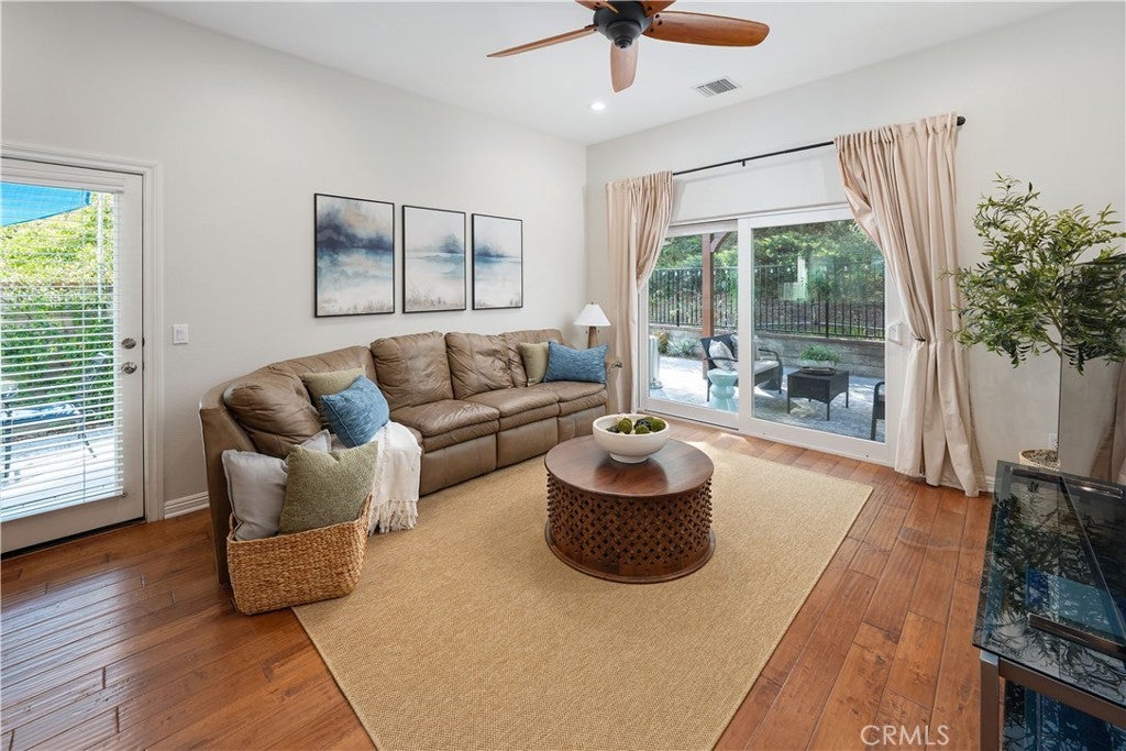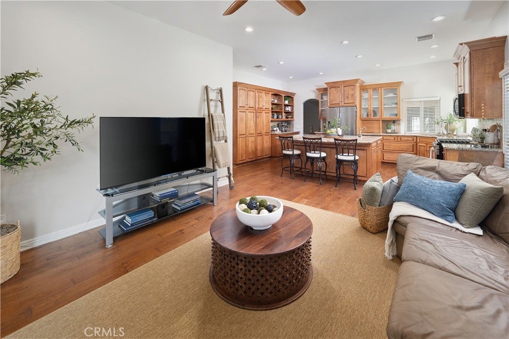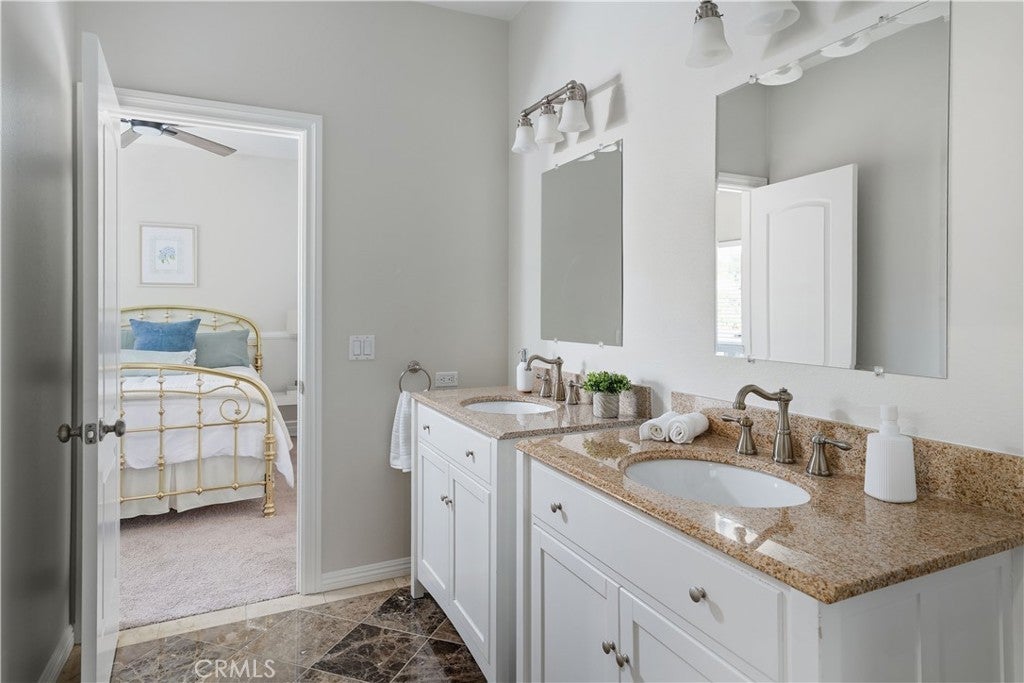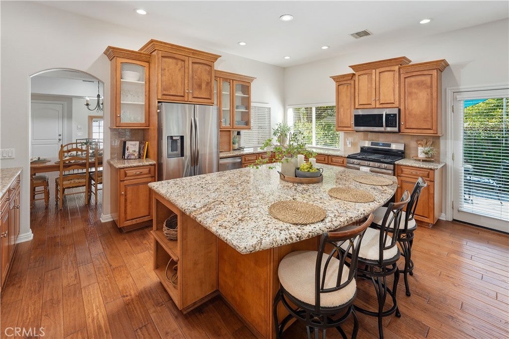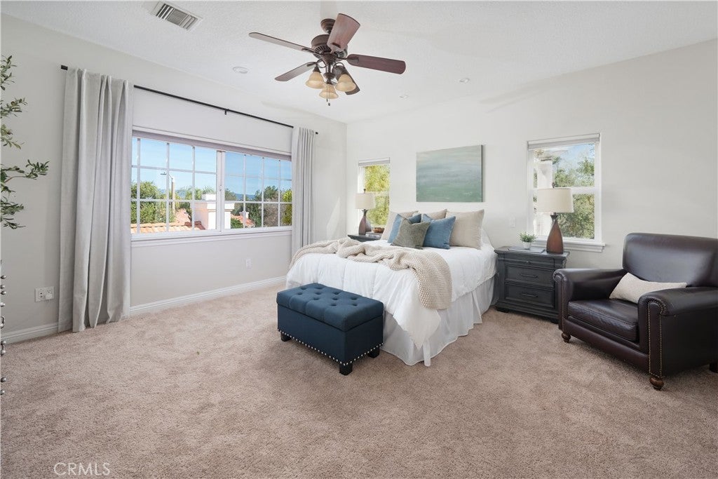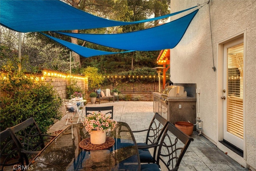 Extensively remodeled 5 bedroom 3 full bathroom Valencia Summit home with a stunning open kitchen and family room, full second story addition with primary suite, loft and two additional bedrooms, two solar systems, Milgard and Anderson windows and a Sunset Magazine worthy backyard with built in BBQ and covered patio. Downstairs offers 2 bedrooms and a full bathroom, plus an indoor laundry room with sink, storage and a laundry chute from upstairs. The remodeled kitchen features solid wood cabinetry, large center island with prep sink and storage, stainless steel appliances including newer stove and microwave, wine fridge, coffee bar, glass cabinet accents, appliance garage and updated backsplash. The family room offers 10 foot ceilings, surround sound and abundant natural light with a sliding glass door to the backyard. Upstairs includes a spacious primary suite with wired speakers, bedside lighting, ceiling fan and a remodeled bathroom with whirlpool tub and travertine walk in shower. Two additional bedrooms share a Jack and Jill bathroom with dual sinks and walk in shower. There is also a loft area perfect for homework, office or bonus space. Ceiling fans in all bedrooms and extra insulation between floors add comfort throughout. Additional features include brand new carpet, wood flooring, new interior paint, LED lighting, tankless water heater, huge storage under the stairs, 2 attic storages with lighting, and a solid wood front door with stained glass detail. There is even a dedicated podcast recording booth or dark room space in the laundry area. The backyard was recently enhanced with stamped concrete, DG landscaping, built in BBQ island with sink, covered patio with ceiling fan and lighting, electrical outlets and extensive permitted improvements. Energy efficiency includes two solar systems plus dual heating systems. Located in the Valencia Summit with low HOA dues featuring 4 pools and spas, tennis and pickleball courts, clubhouse, miles of paved and lit paseos, Summit Park, and convenient access to shops, dining and the freeway.