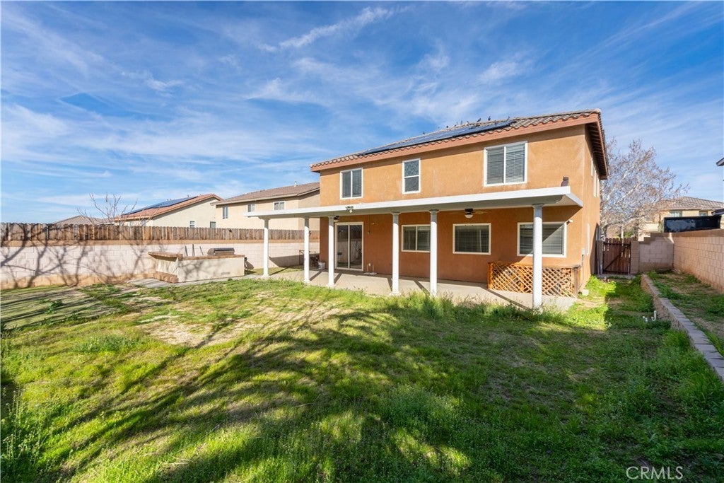 Welcome to this spacious West Lancaster home built in 2004, offering 4 bedrooms, 3 bathrooms, and 3,542 square feet of living space, ideally located on a quiet cul-de-sac and featuring a 6 KW solar system. The open-concept main level showcases elegant travertine tile flooring, formal living room, formal dining room, two separate living areas, powder room, and a laundry room. The expansive family room with fireplace and ceiling fan opens to a large eat-in kitchen designed for both everyday living and entertaining. The kitchen offers abundant cabinetry, granite countertops with matching backsplash, stainless steel appliances including cooktop, oven, microwave, dishwasher, recessed lighting, and a large center island with breakfast bar. Upstairs you will find all four bedrooms, a loft area, a full bathroom with double vanity, and an impressive 400-square-foot bonus room complete with a wet bar—perfect for entertaining, a game room, or home theater. The spacious primary suite features a large walk-in closet and bathroom with double vanity, jetted bathtub, and separate shower. Ceiling fans in all bedrooms provide added comfort. Step outside to a large backyard featuring a covered patio that runs the length of the home, complete with two ceiling fans, stamped concrete, and a built-in BBQ grill with bar area—perfect for hosting gatherings and backyard BBQs.