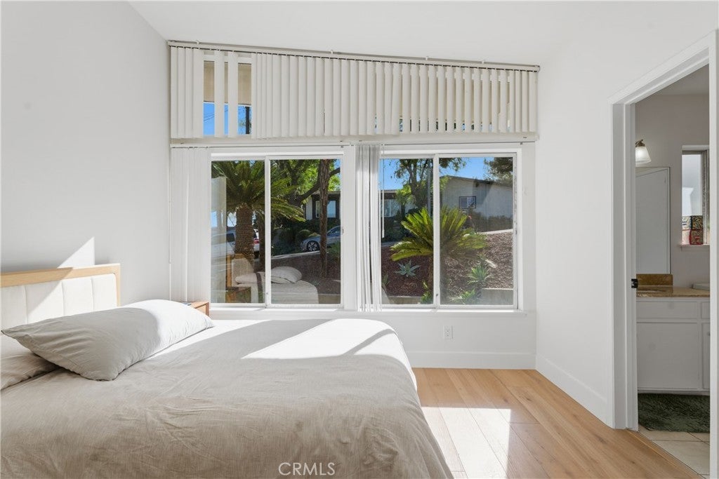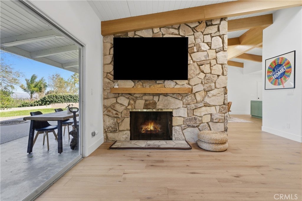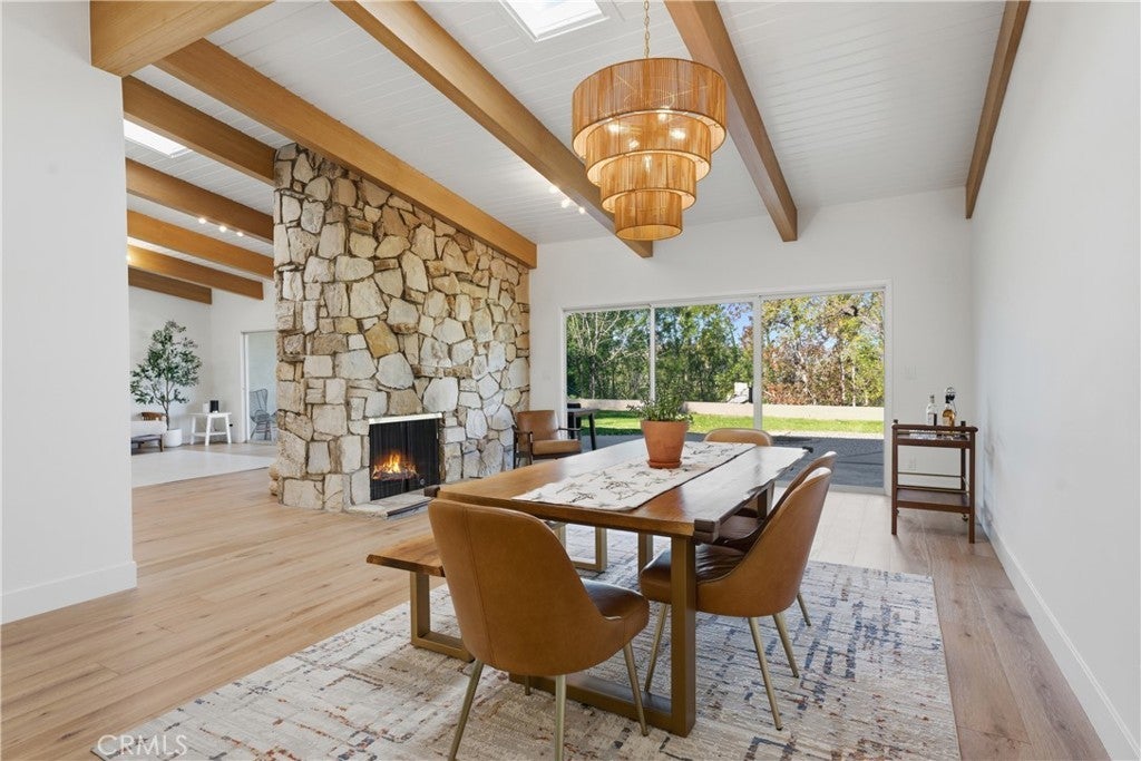 Remodeled mid-century modern Charles Du Bois single story VIEW home! Located West of Valley Circle on an approx. 12,000 SF rare expansive view lot that overlooks the Valley, mountains, and Warner Center! The single level property features wide frontage with mature palms and driveway that leads to a 2-car attached garage with direct access. Step inside to find a wide formal entry foyer with newly added guest powder bathroom and brand new wide plank oak wood floors found throughout. The entry opens to both the spacious living and dining rooms each featuring gorgeous wrapped wood beamed ceilings with skylights, double sided stone fireplaces, and large glass sliders that open to the backyard with dazzling mountain and city light views beyond, presenting the perfect backdrop for indoor/outdoor entertaining. The stunning completely remodeled open kitchen boasts large center island, soft close custom cabinetry with pantry space, gourmet Cafe appliances, wine fridge, and separate cozy breakfast nook with built-in bench seating with additional storage. The luxurious primary suite overlooks the Valley vistas and features high vaulted ceiling, wall-to-wall closet space, glass slider that opens to the yard, and private en-suite bathroom with dual sinks, walk-in shower, and separate bathtub. Two additional secondary bedrooms each have vaulted ceilings, large picture windows, good sized closets including a large walk-in, and share an en-suite bathroom with walk-in shower. The entertainer’s backyard features an expansive covered patio with fire pit, sprawling grass lawn, and Valley, mountain, and city light views with ample space for a pool if desired. Additional upgrades per seller: new roof (2023), new HVAC system (2024), upgraded electrical panel (2025), and new recessed lighting throughout. Adjacent to dining/shopping at the Westfield Mall/Village, The Calabasas Commons, Warner Center, & zoned for award-winning El Camino & Hale charter schools.