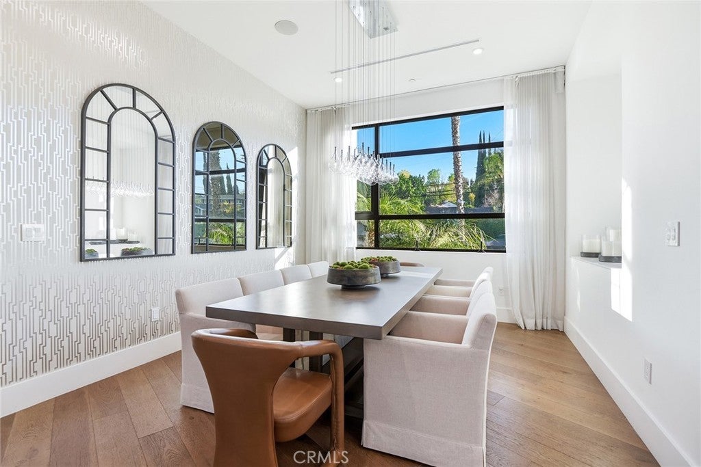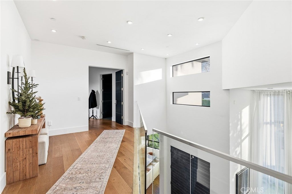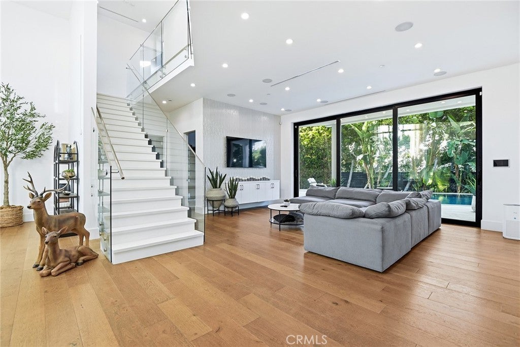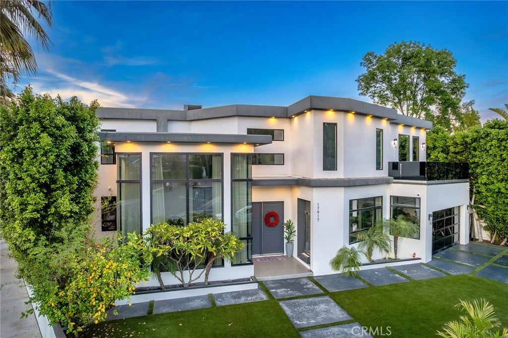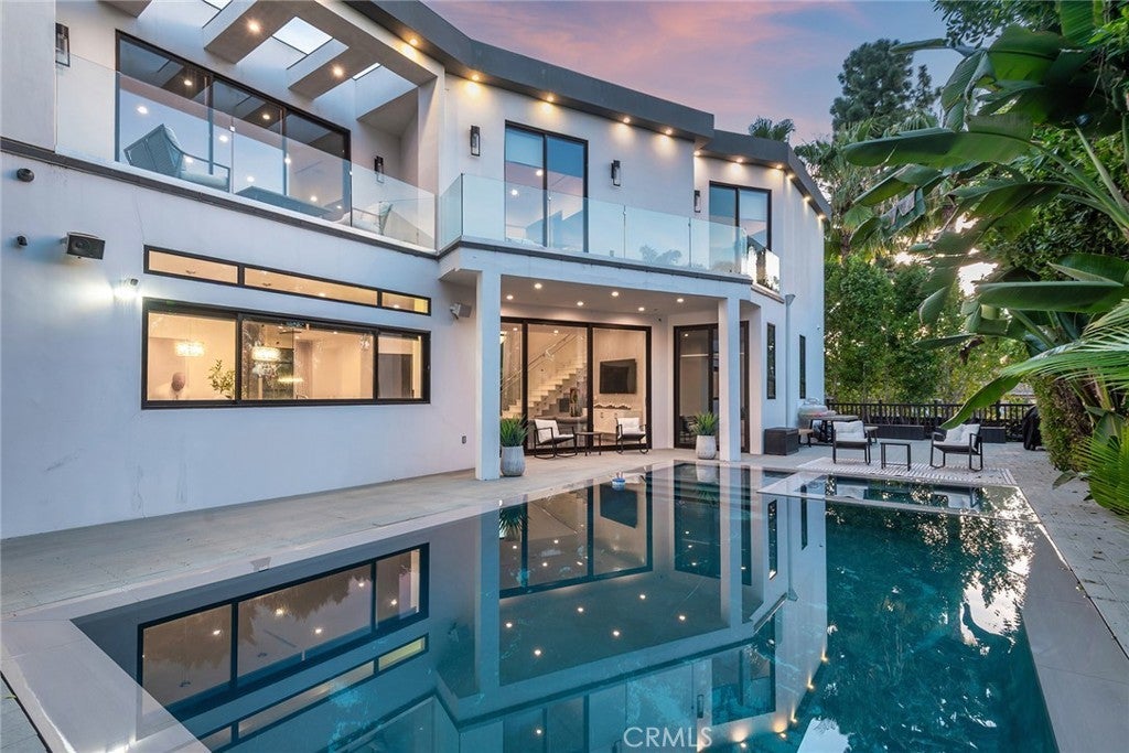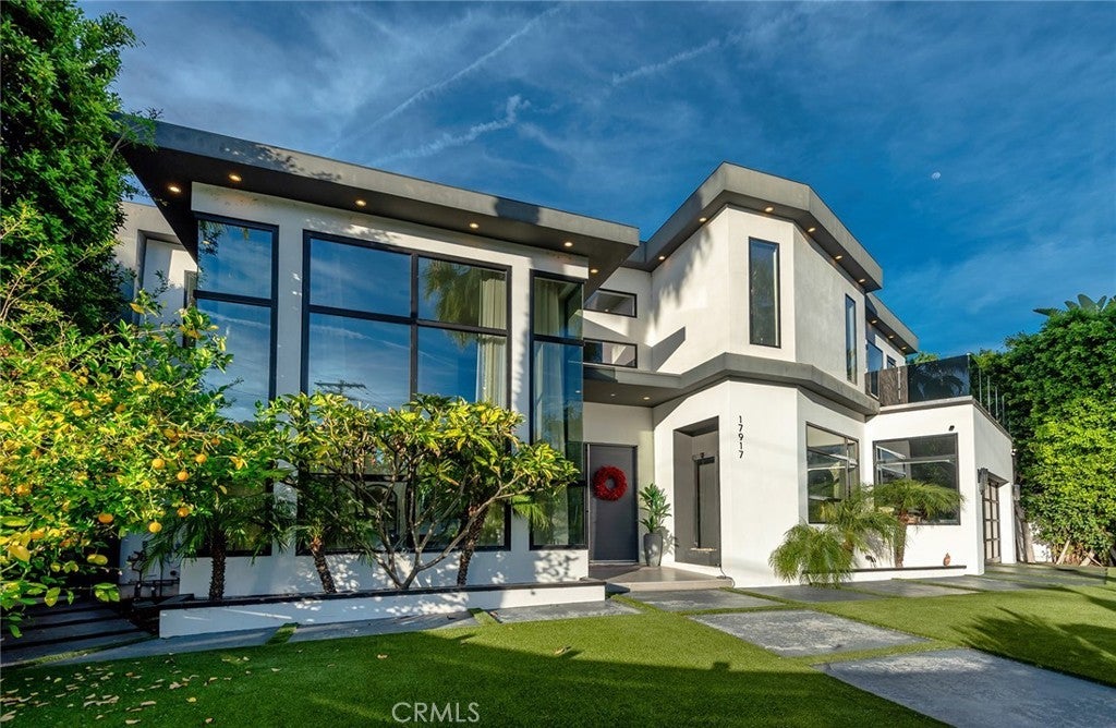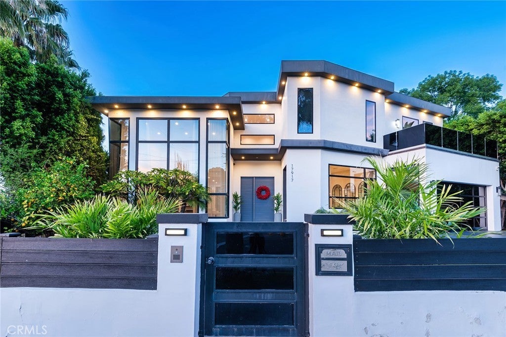 Extraordinary newer built contemporary with a prime South of the Blvd location in Encino! Ideally set on a corner lot with sensational privacy is this custom 4132 square foot beauty. The tremendous open concept floorplan boasts 20 foot ceilings with 4 bedrooms and 4.5 baths. The center island kitchen opens seamlessly to the great room which is graced with a full floor to ceiling wine cellar and sliders that open to the backyard. The primary is warmed by a fireplace, underscored with hardwood floors and provides a spa-like bathroom and private balcony with city light views! In addition to the primary, there are are two secondary en-suite bedrooms upstairs and one en-suite bedroom down. The backyard boasts a zero edge pool and spa and mature tropical landscape. Among the homes other attributes are a Control 4 Smart home system, small front exterior wall with pedestrian gate entrance and electric gated driveway leading to a beautifully designed 2 car garage. Winner!