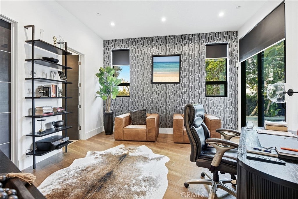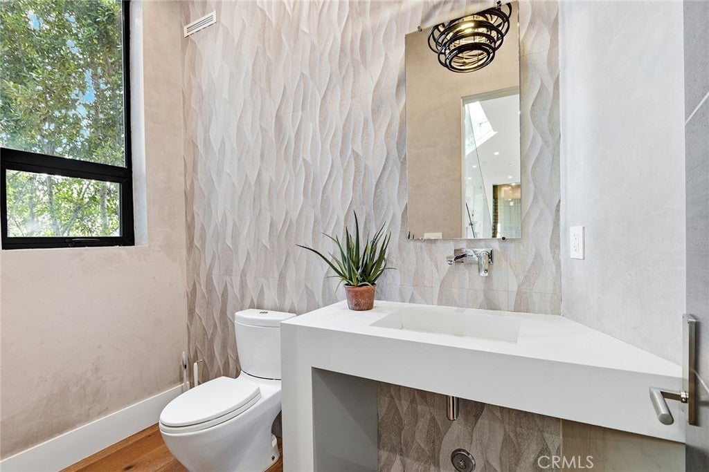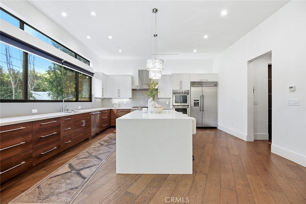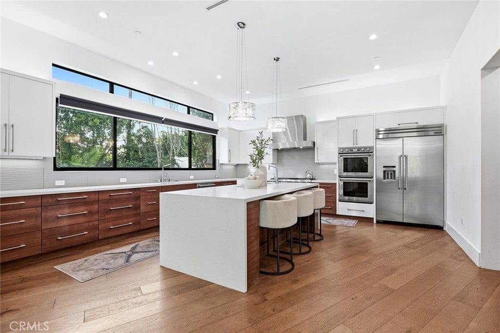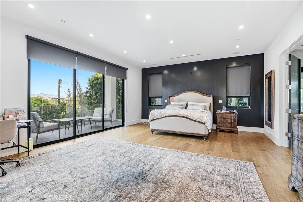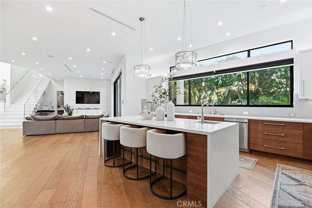Extraordinary newer built contemporary with a prime South of the Blvd location in Encino! Ideally set on a corner lot with sensational privacy is this custom 4132 square foot beauty. The tremendous open concept floorplan boasts 20 foot ceilings with 4 bedrooms and 4.5 baths. The center island kitchen opens seamlessly to the great room which is graced with a full floor to ceiling wine cellar and sliders that open to the backyard. The primary is warmed by a fireplace, underscored with hardwood floors and provides a spa-like bathroom and private balcony with city light views! In addition to the primary, there are are two secondary en-suite bedrooms upstairs and one en-suite bedroom down. The backyard boasts a zero edge pool and spa and mature tropical landscape. Among the homes other attributes are a Control 4 Smart home system, small front exterior wall with pedestrian gate entrance and electric gated driveway leading to a beautifully designed 2 car garage. Winner!