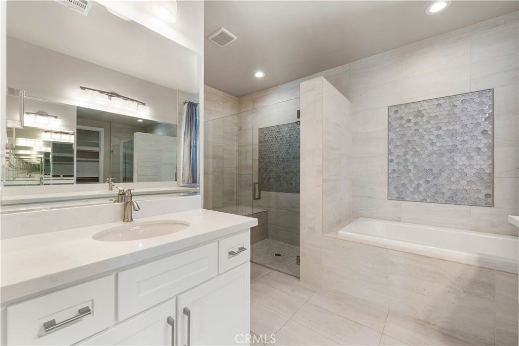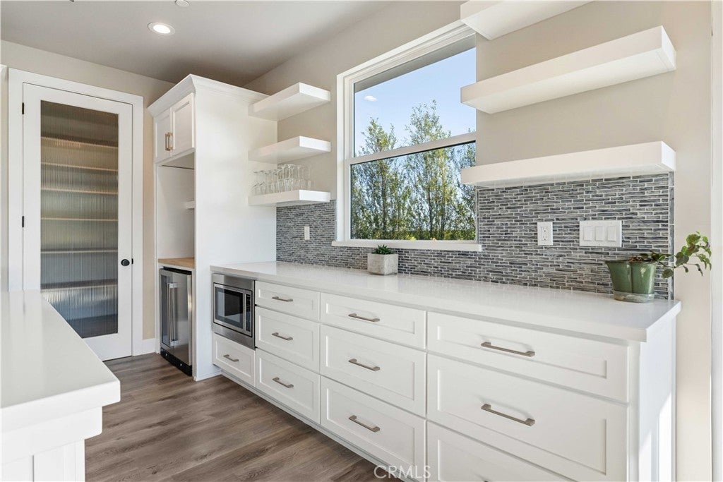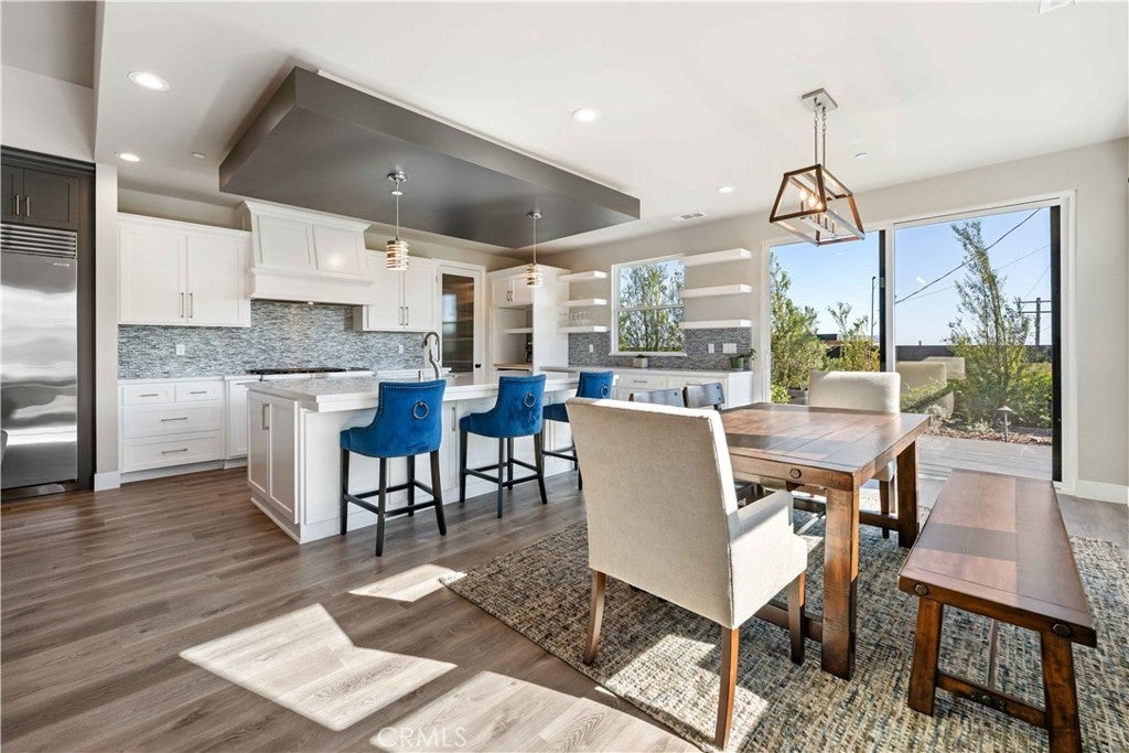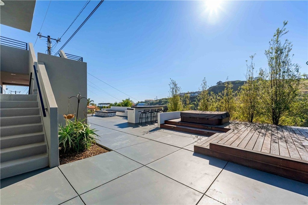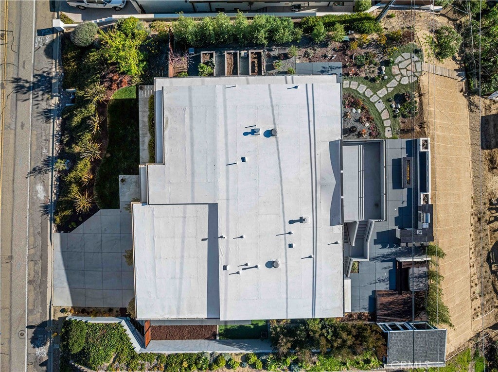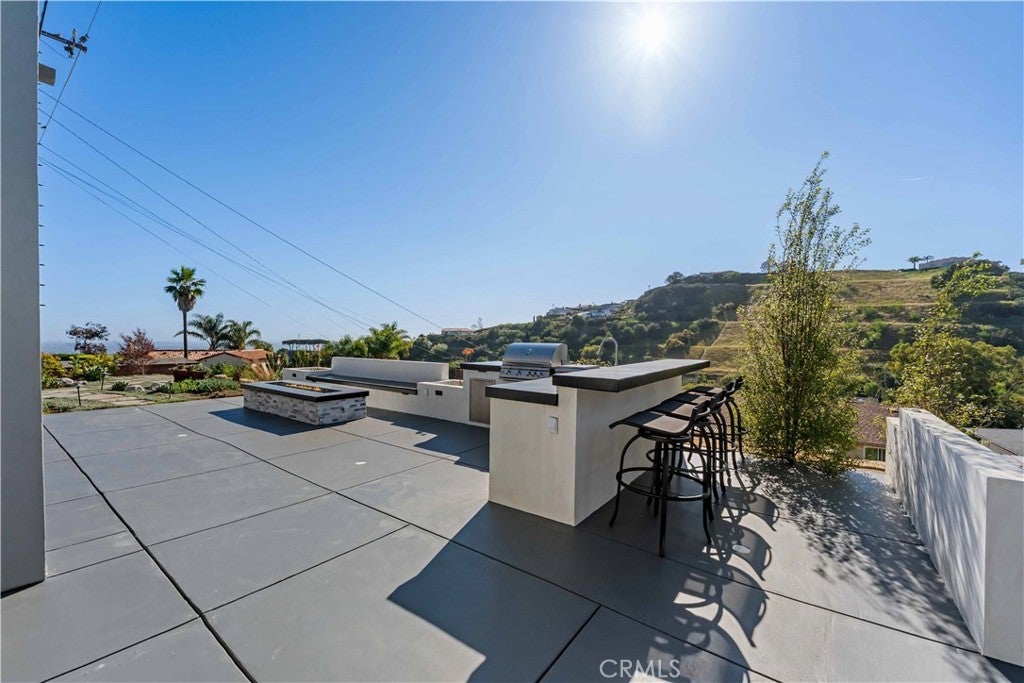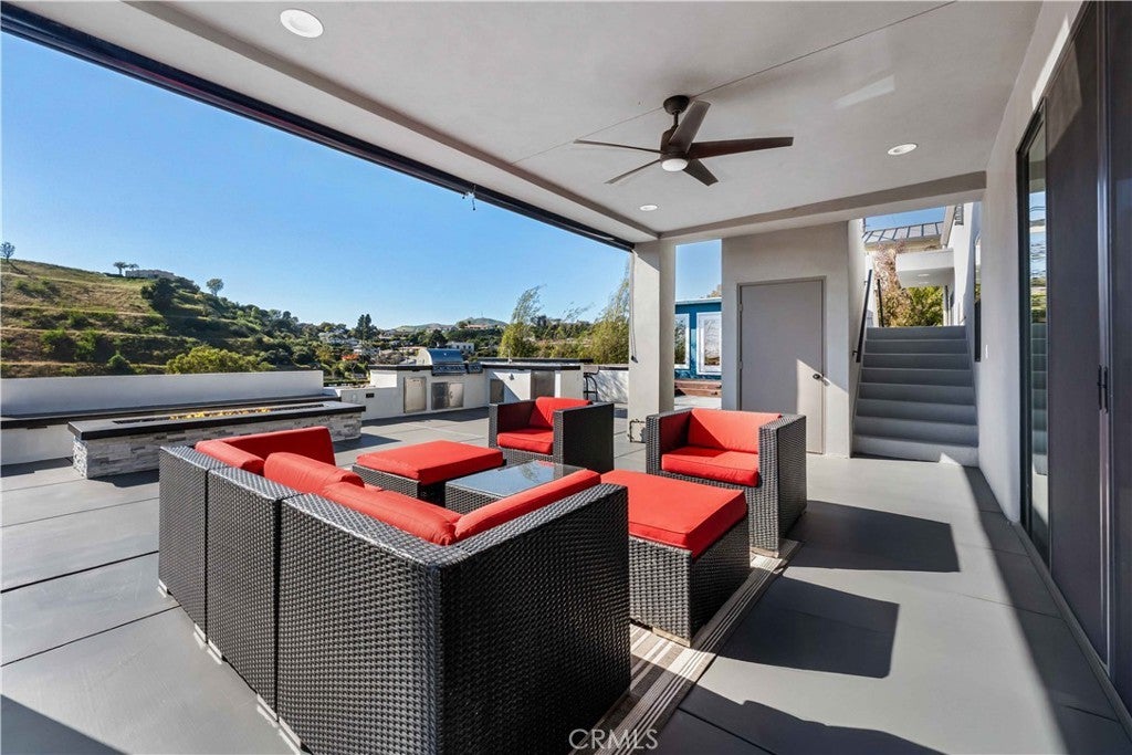 New build in 2021, this stunning modern single-story home offers hillside, mountain & ocean views with exceptional indoor-outdoor living. Designed with high ceilings, abundant natural light, and an open-concept layout, the home features a split floorplan with 4 bedrooms & 3 full baths—two bedrooms & 2 baths on one side & two bedrooms & 1 bath on the other for ideal privacy & flexibility. All bedrooms with ample storage closets. The gourmet kitchen is thoughtfully designed for both everyday living & effortless entertaining, offering abundant prep space & expansive quartz countertops accented by a stunning glass tile backsplash that adds depth & sophistication. Contemporary pendant lighting & sleek floating shelves enhance the kitchen’s modern aesthetic, creating an open & inviting atmosphere. Premium appliances include a built-in Sub-Zero refrigerator/freezer, a commercial-grade KitchenAid 6-burner range with double oven, grill, dishwasher & a built-in wine & beverage refrigerator. An expansive quartz island with a breakfast bar provides generous seating, along with ample storage. Completing the space is a large walk-in pantry featuring built-in drawers, pull-outs & shelving for exceptional organization & functionality. The spacious dining area, open to the kitchen, enjoys beautiful eye-catching views. The great room showcases a stacked stone fireplace, recessed lighting, ceiling fan & sliding doors to a covered patio for seamless indoor-outdoor living. Large windows capture backyard & view vistas from the great room, kitchen, dining area, and primary suite. The spacious primary suite includes patio access, hillside views, dual vanities, soaking tub, frameless glass walk-in shower w/tessellated tile & a large walk-in closet with built-ins. Resort-style backyard is an entertainer’s dream featuring a raised view deck with private spa, built-in fire pit w/seating, fully equipped outdoor kitchen (BBQ, burner, sink, refrigerator), bar seating for 4 & a covered patio w/ceiling fan & recessed lighting. Additional highlights include a private outdoor flex space (office/gym/studio), large rooftop deck, with panoramic views, raised garden beds, citrus trees, rain barrels, irrigation system, outdoor storage & exceptional entertaining spaces. Modern upgrades include: tankless water heater, HVAC, water softener, 3 Ring cameras, deluxe vinyl plank flooring, recessed lighting, spacious laundry room, & an oversized, deep 2-car garage with extensive storage.