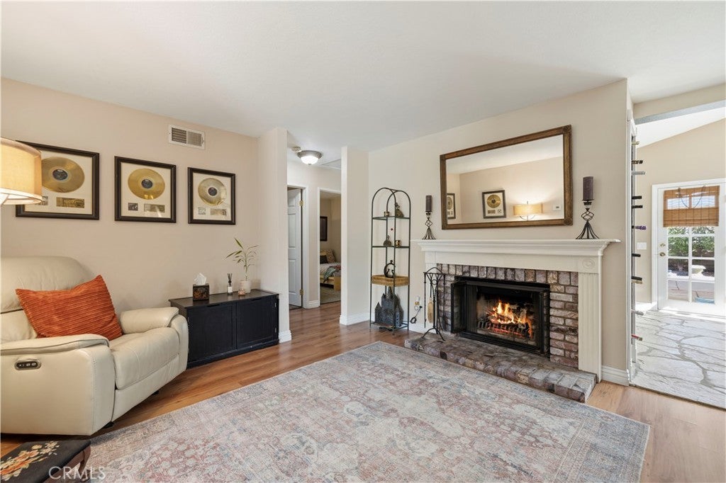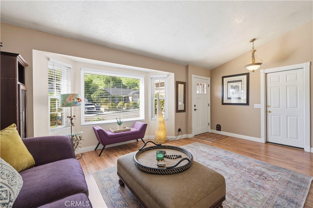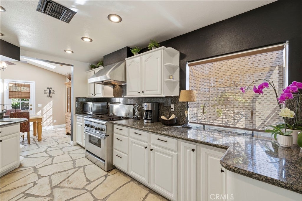 This charming single-story Hidden Lake beauty is TURN-KEY and has NO HOA OR MELLO-ROOS! The pride of ownership is evident and you're welcomed into your front living room featuring vaulted ceilings and bay windows. The floor plan flows seamlessly through the den that stays warm with a cozy brick fireplace adorned with a beautiful mantelpiece. Your remodeled kitchen is the showstopper featuring granite countertops and backsplash, a breakfast bar, white cabinetry with oil-rubbed bronze hardware, recessed lighting, stainless steel Thermador range and range hood, pantry, elegant black accents, and the most charming stone flooring that that flows into your adjacent dining room featuring a built-in wine rack wall and where natural light pours in through the two skylights in the vaulted ceiling above. A built-in office space completes your dining area where French doors provide access to your spacious, low maintenance backyard featuring a koi pond, large custom built storage shed, and citrus fruit trees including grapefruits, lemons, oranges, tangerines, and kumquats! You have 3 cozy bedrooms and a remodeled hallway bath with a jetted bathtub and skylight above. Your primary suite has vaulted ceilings, a walk-in closet, 3/4 bath, and its own slider for dedicated backyard access. Your 2 car garage has been converted to a spacious 4th bedroom with a closet, ventilation, drywall, carpet, and indoor laundry area. Your 40 year roof is only about 10 years old and water heater was just replaced in 2025! Located close to Castaic Lake and just a short drive away from multiple parks, strip malls, shopping, and dining, come make this charming beauty your own while you can!