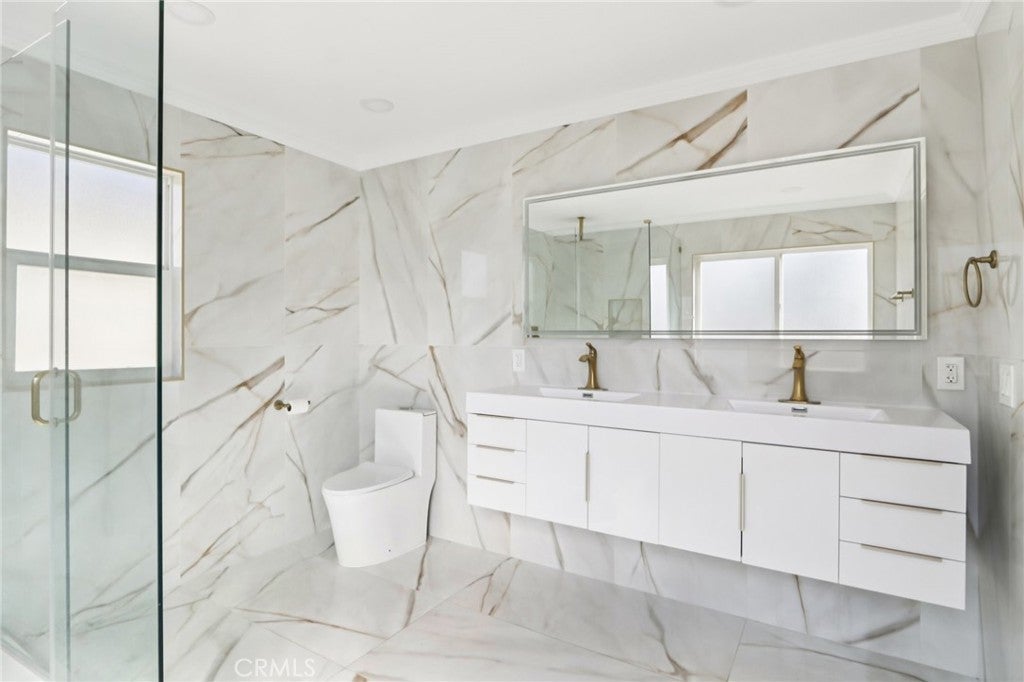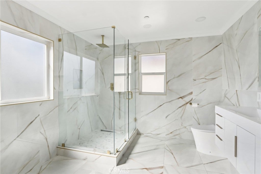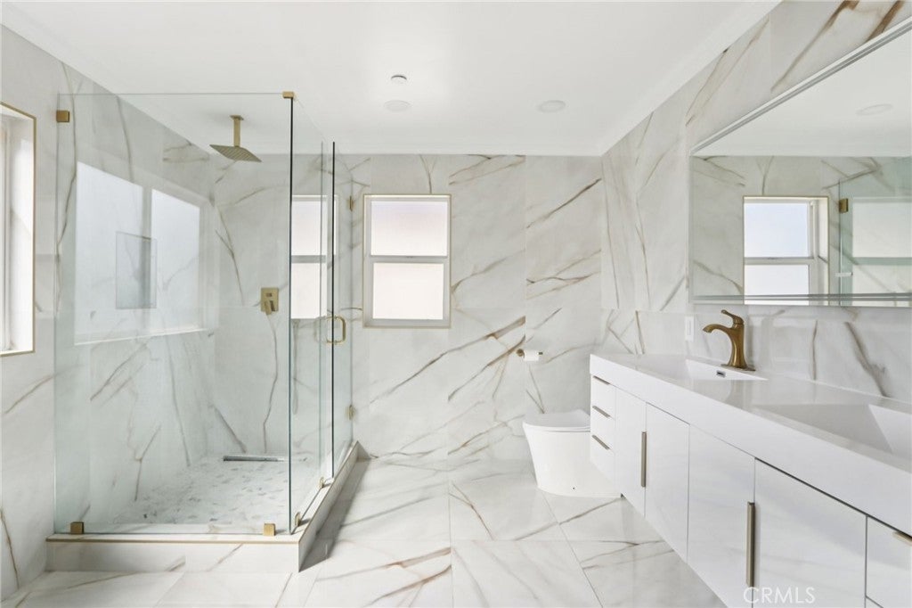 Welcome to this beautiful home nestled in a charming small gated community in North Hollywood. This stunning two-story residence features 4 spacious bedrooms and 5 bathrooms, offering comfort, style, and plenty of room to live and entertain. As you enter, you are greeted by a dramatic two-story living room with soaring ceilings and a cozy fireplace, creating a bright and inviting atmosphere. The updated kitchen is designed for both functionality and style, featuring sleek quartz countertops, stainless steel appliances, and ample cabinetry, along with a spacious dining area perfect for gatherings and everyday meals. The primary suite is generously sized and offers a private retreat with direct access to a beautifully updated en-suite bathroom featuring dual sinks, a large stand-up shower, and elegant tile extending throughout the walls. Each of the additional bedrooms is well-proportioned and comfortable, providing flexibility for family, guests, or a home office. The home also includes the convenience of an in-house washer and dryer. Step outside to enjoy a large private patio, ideal for relaxing, outdoor dining, or entertaining. Located in a desirable North Hollywood neighborhood, this home is close to shopping centers, dining, and everyday conveniences, while still offering the privacy and security of a gated community. This is a wonderful opportunity to enjoy space, style, and comfort in a prime location.