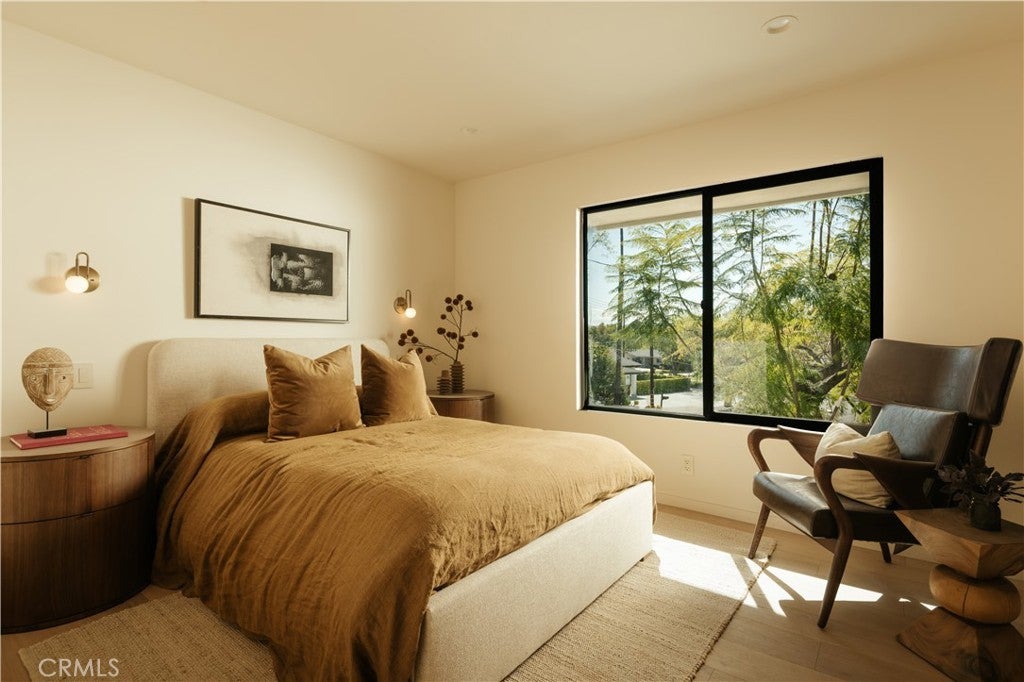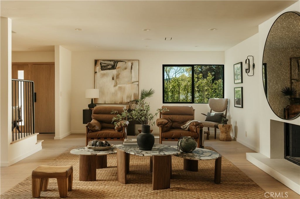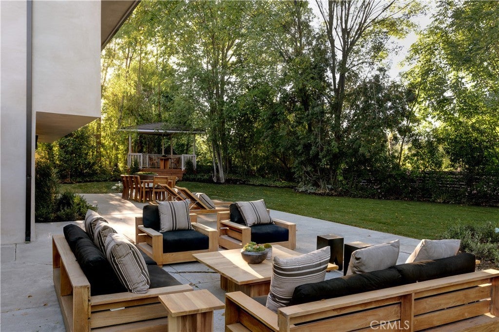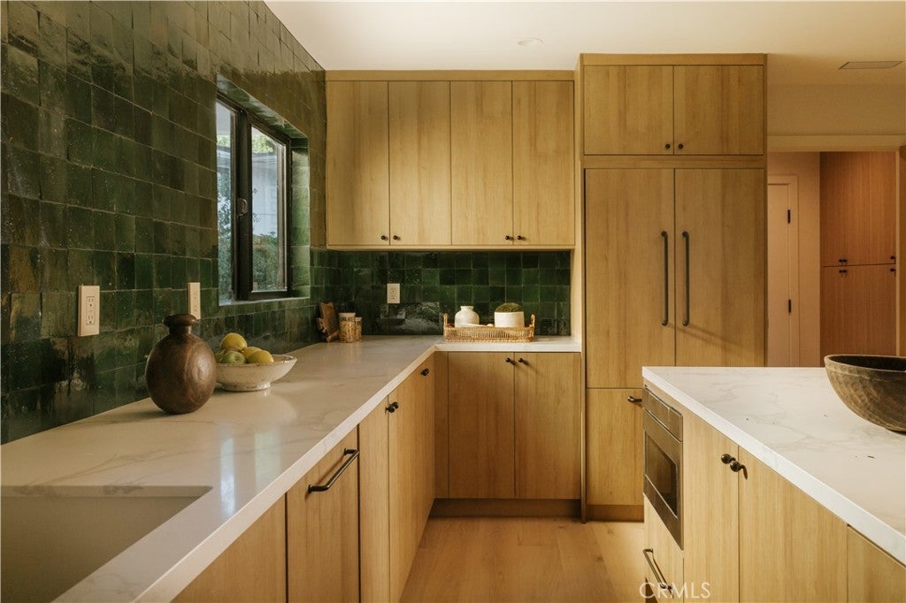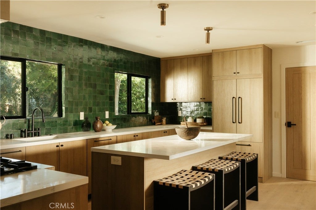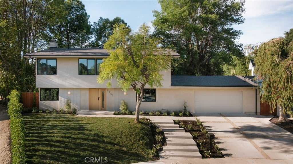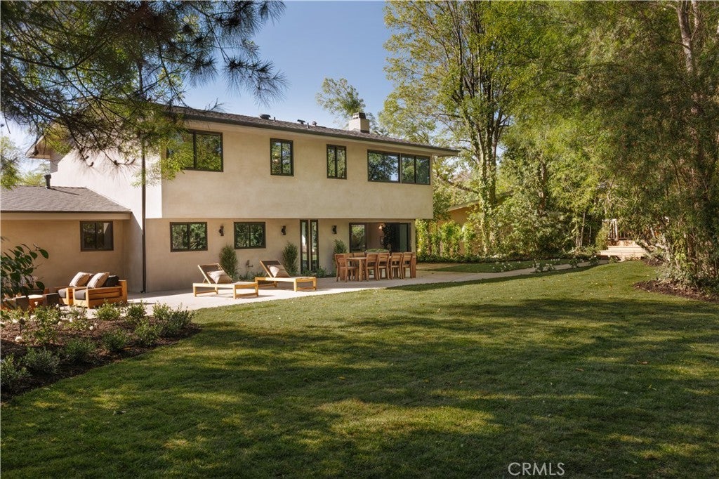 Situated on a quiet cul-de-sac in Woodland Hills, this beautifully redesigned residence blends modern sophistication with warm natural materials and thoughtful craftsmanship throughout. Redesigned by TheDesignLab.LA, the home offers a refined balance of contemporary design and comfortable living. The property delivers both elevated style and everyday functionality. The home’s clean architectural exterior and curated landscaping create a welcoming sense of arrival. Inside, the light-filled interior showcases wide-plank wood flooring, designer lighting, and expansive windows that frame views of surrounding greenery while filling the home with natural light. At the center of the home, the chef’s kitchen features custom white oak cabinetry, premium appliances including built-in Fisher & Paykel refrigerator, a large center island with seating, and a striking handcrafted green tile backsplash. Adjacent to the dining room, the space is both visually distinctive and highly functional. A sleek fireplace anchors the formal living room and flows seamlessly to the outdoor patio, creating an ideal setting for both relaxed living and entertaining. Upstairs, the spacious primary suite serves as a private retreat with a spa-inspired bathroom featuring a soaking tub, oversized shower, dual vanity, and a custom walk-in closet. Designed for true Southern California living, the backyard offers an expansive lawn surrounded by mature trees and lush landscaping, along with a large patio featuring multiple lounge and dining areas perfect for entertaining, outdoor dining, or relaxing in a peaceful garden-like setting. Additional highlights include skylights, custom millwork, Lutron-controlled lighting, integrated speakers, and a security camera system, completing this thoughtfully upgraded residence. Ideally located just minutes from The Village at Westfield Topanga, Westfield Topanga Mall, Calabasas Commons, Warner Center, and Ventura Boulevard’s renowned dining and shopping, the home offers convenient access to some of the area’s best lifestyle amenities while maintaining a quiet neighborhood setting.