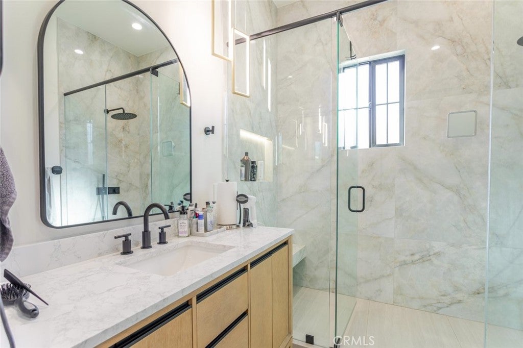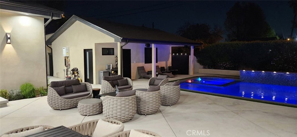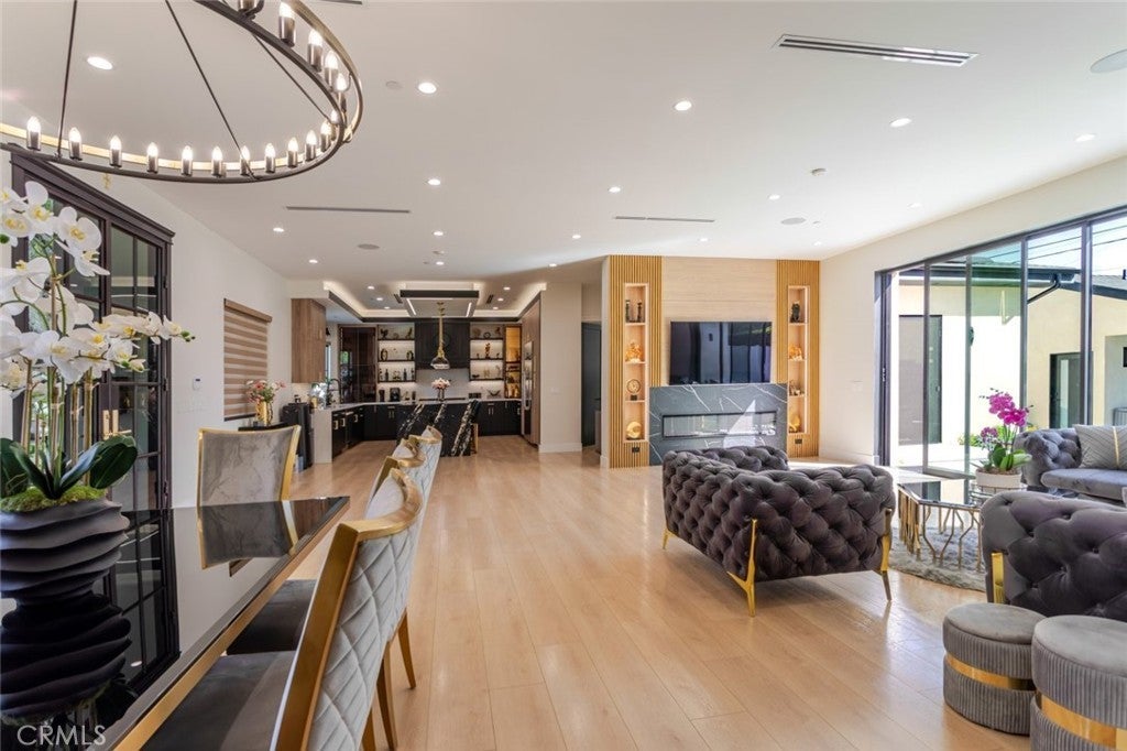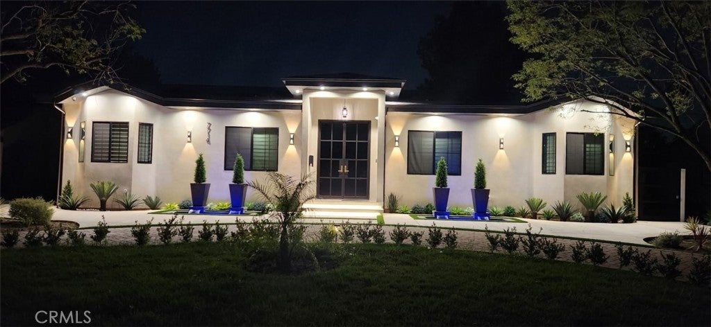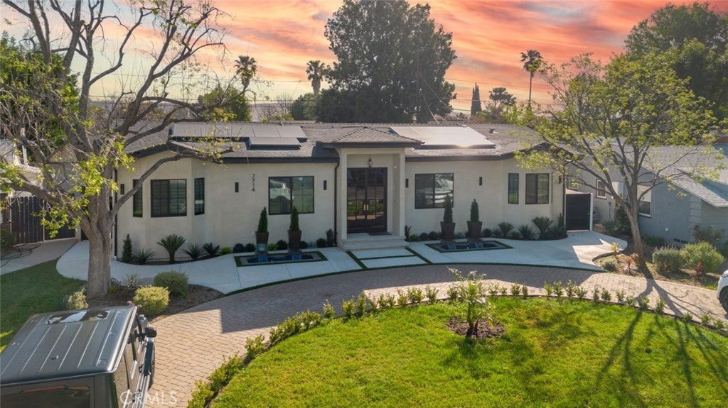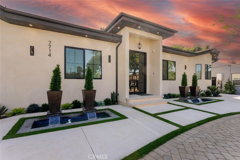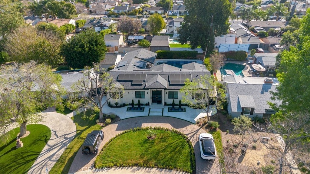 Discover refined luxury living in this newly rebuilt home located in Northridge. Thoughtfully designed with modern elegance, this stunning residence offers 3 bedrooms, 4 bathrooms, and approximately 2,267 sq ft of beautifully crafted living space. The interior showcases soaring high ceilings, recessed lighting, and a stylish fireplace that creates a warm yet sophisticated atmosphere. The brand-new gourmet kitchen is designed for both everyday living and entertaining, featuring top-of-the-line appliances, sleek quartz countertops, and contemporary finishes. The outdoor space is a true private oasis, complete with a sparkling pool and spa, ideal for relaxing or hosting gatherings. Lush surroundings and a serene setting create a resort-style experience right at home. Additional highlights include a detached two-car garage, energy-efficient solar panels, and an elegant circular driveway providing convenient drive-in and drive-out access while enhancing the home's impressive curb appeal.