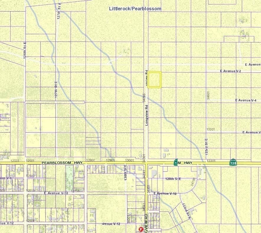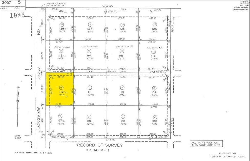 2.12 acre residential corner lot at the southeast corner of Longview Rd and Ave V2. The plat map shows a record of survey. APN 3037-005-017. The lot has 330 feet of frontage on Longview Rd on the west border. Zoned LCRA7500 for mixed uses