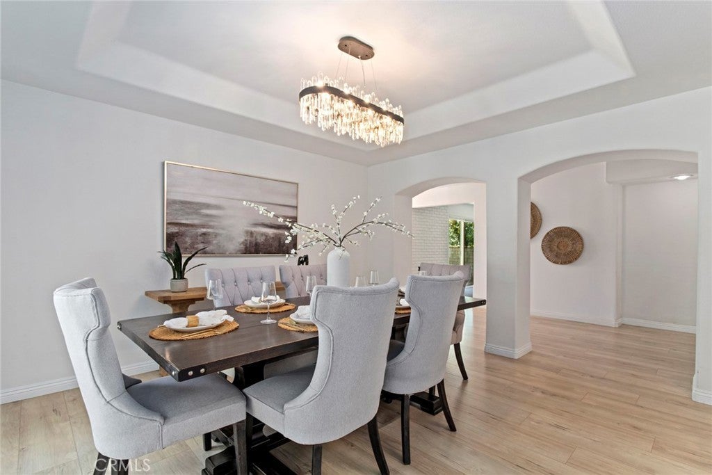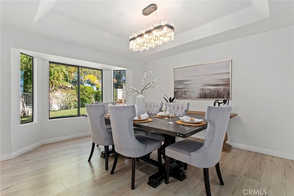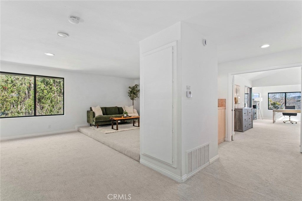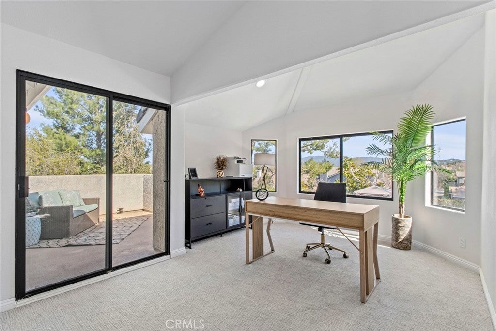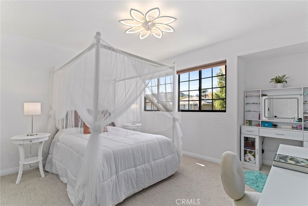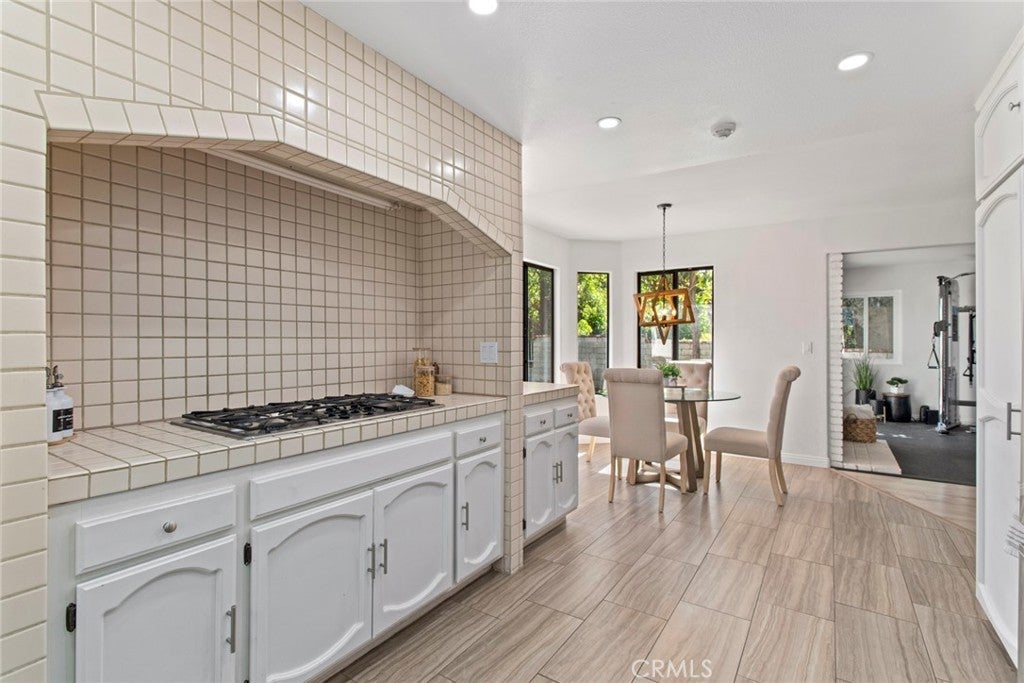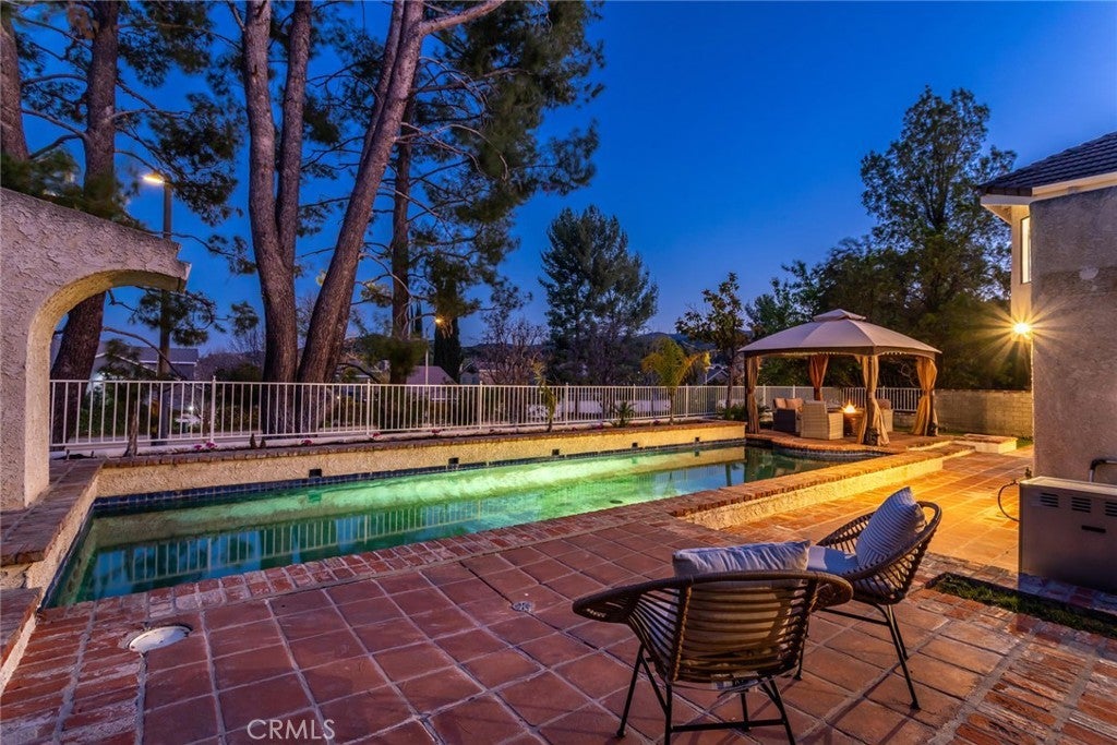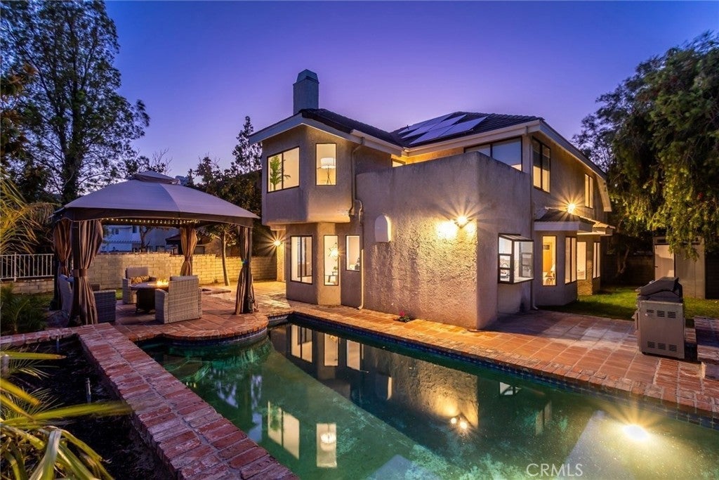Welcome to this stunning Executive Pool Home in the highly desirable Summerset tract of Stevenson Ranch. Situated at the end of a cul-de-sac on a corner lot, this beautifully maintained home offers four bedrooms, three bathrooms, and over 3,300 square feet of thoughtfully designed living space. From the moment you arrive, the exceptional curb appeal of the home sets the tone. Step inside and discover ceilings accented by exposed beams, wood-like flooring, designer light fixtures, inviting paint selections, and tons of windows filing the space with natural light. The formal living and dining spaces are generous in size and highlighted by an elegant modern chandelier. The kitchen offers an abundance of cabinetry, tile countertops, coordinating appliances, and views of the backyard. The kitchen opens seamlessly to a bonus room, currently utilized as a gym, featuring a cozy brick fireplace and direct access to the backyard, making it an ideal space for entertaining. The main level also features a convenient bedroom and bath, perfect for guests. Upstairs, the primary suite with panoramic views create a romantic retreat. This space includes a private balcony, an oversized walk-in closet and dressing area with custom organizers. The spacious ensuite bath is complete with a soaking tub, walk-in shower, dual vanity with tiled countertops, and a dedicated makeup station. Additional bedrooms are generously sized and offer ample closet space along with neighborhood views. The hall bath features a coordinating vanity and a shower-tub combo. A large loft with a wet bar provides flexible space ideal for a library, home office, or media room, while an additional loft area is currently being used as a fifth bedroom and could easily function as a game room or workspace. Additional upgrades include OWNED SOLAR, indoor laundry, an oversized driveway, and a three-car garage featuring epoxy flooring and a newer modern garage door. Step outside to your private backyard featuring a sparkling pool and spa, expansive grassy play area, and multiple seating and relaxation spaces create the perfect setting for outdoor living. The backyard enjoys both privacy and beautiful views of the surrounding neighborhood. Ideally located just minutes from award-winning schools, shopping, parks, and convenient access to the 5 freeway. HOA amenities include sport courts, parks, security patrol, common ground maintenance and walking paths.