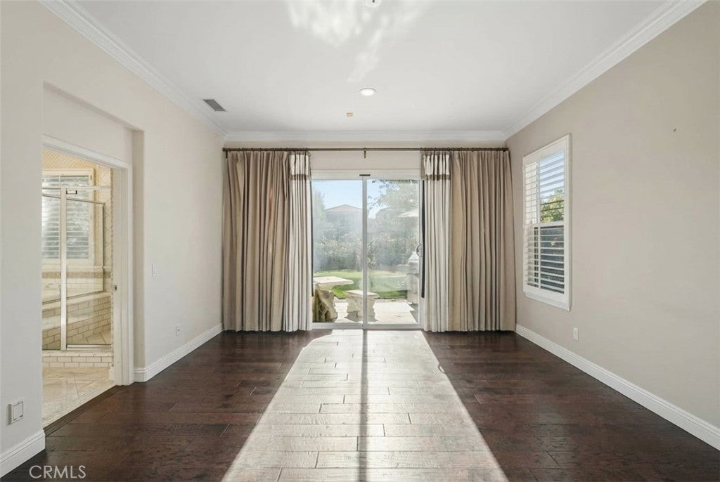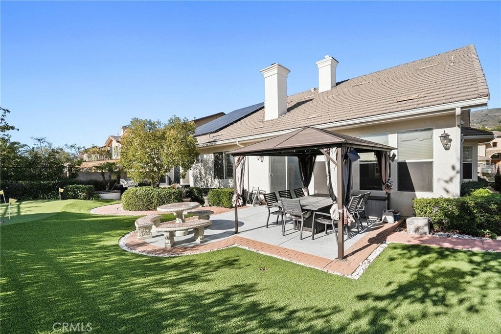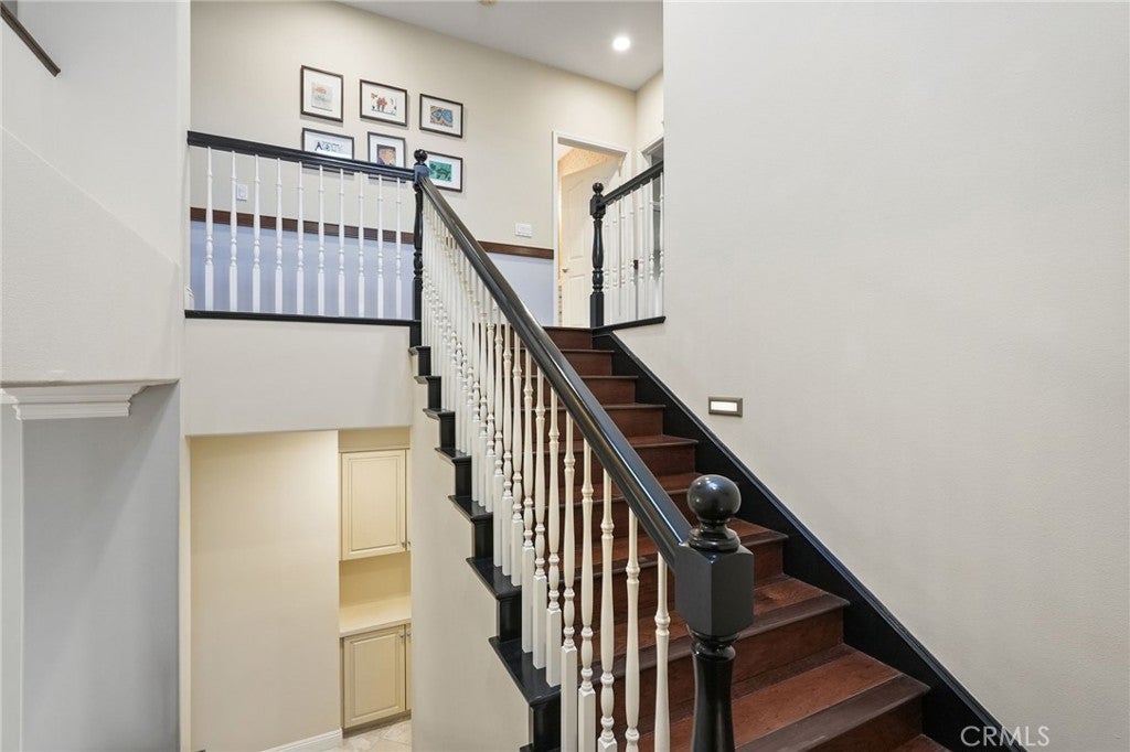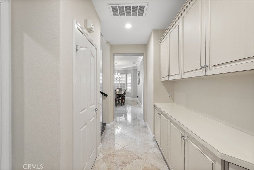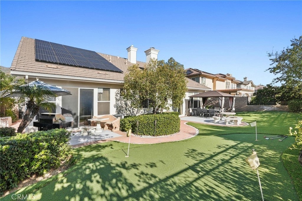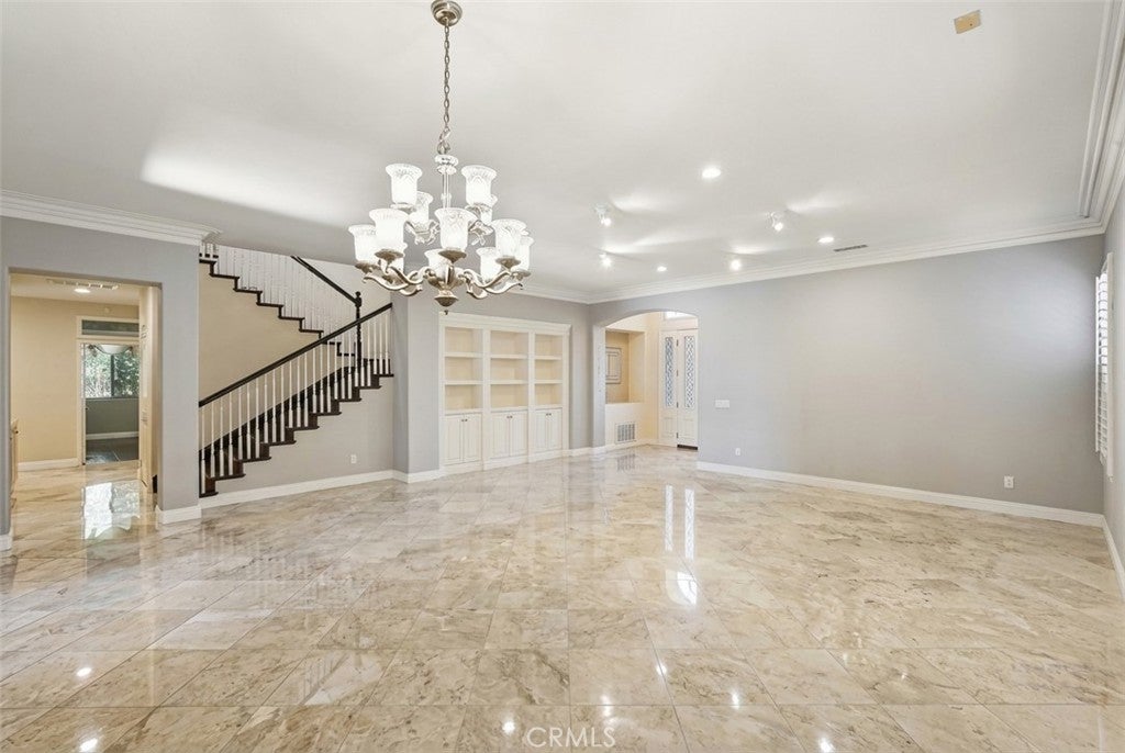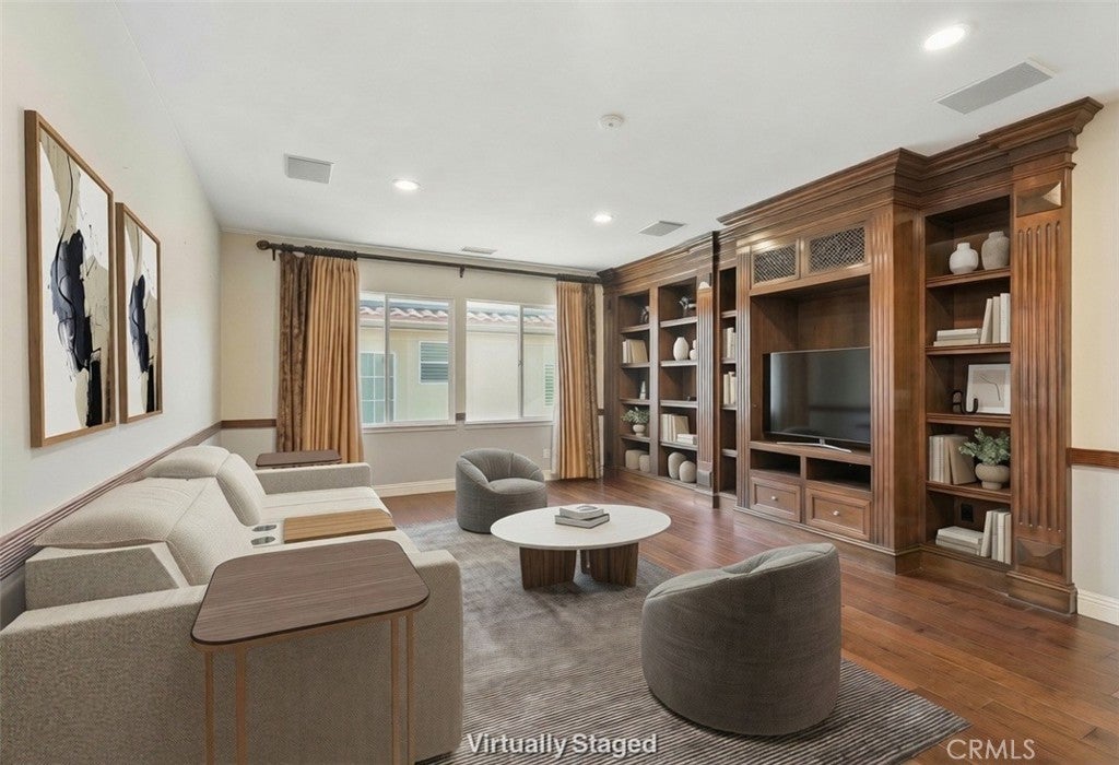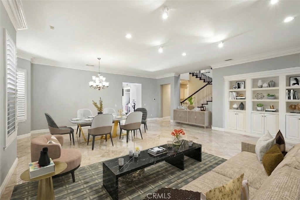Welcome to this Renaissance Estate located in a highly sought-after guard-gated community. Originally built as a former model home, this residence showcases refined upgrades and one of the neighborhood’s most desirable and limited floor plans, only a handful were ever built. Offering the versatility of a two-story layout with the rare convenience of a primary suite on the main level, the home lives comfortably as either a single-story or a spacious two-story retreat. Step through elegant glass entry doors into a light-filled open floor plan featuring gleaming marble floors, crown molding and soaring ceilings. Just off the entry, a versatile bedroom with custom built-ins, wainscoting and wood flooring makes an ideal home office or guest suite, complemented by an adjacent guest bath with a custom-tiled walk-in shower. The bright and inviting chef’s kitchen features modern cabinetry, upgraded quartz countertops, stainless steel appliances and additional storage within the breakfast nook. Open to the family room, the space is enhanced by custom built-ins, a beautifully detailed fireplace mantel and sliding doors that frame peaceful backyard views. Privately situated, the spacious main-level primary suite is filled with natural light and offers direct backyard access through sliding doors. The spa-inspired ensuite includes a soaking tub, oversized separate shower, dual vanities and a generous walk-in closet. A third downstairs bedroom with its own private bathroom and separate vanity area provides comfortable accommodations for guests or multigenerational living. Upstairs, a flexible bonus room with a cozy fireplace and custom built-ins offers endless possibilities as a secondary living space, office or gym. An additional oversized bedroom with ample closet space and a full bathroom featuring designer wallpaper and a tub/shower combination completes the upper level. The private backyard oasis is thoughtfully landscaped for both relaxation and entertaining, featuring multiple seating areas, the tranquil sound of water, a putting green and mature greenery. Additional highlights include a laundry room with a sink, three-car garage, artificial turf in both the front and rear yards for minimal water usage, and paid-off solar. Residents of this prestigious community enjoy excellent schools, nearby parks, convenient freeway access and are just minutes from The Vineyards, which offers popular shopping, movie theater and dining destinations.
