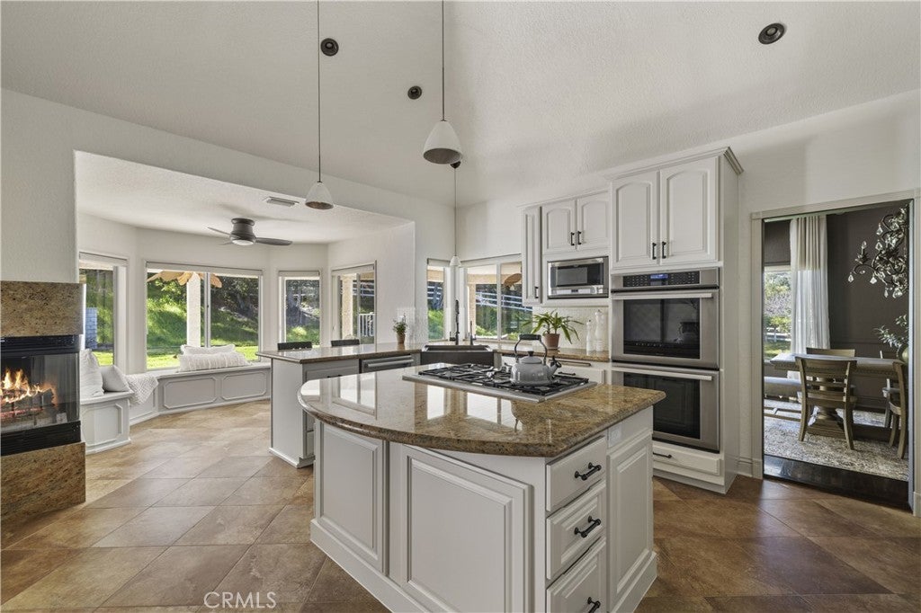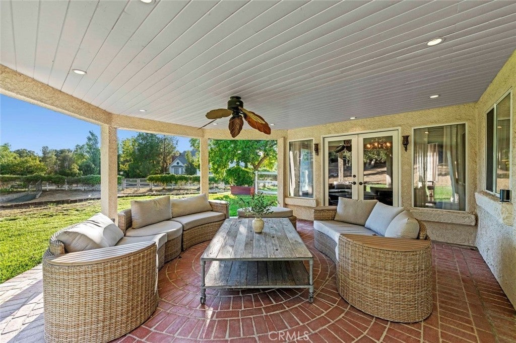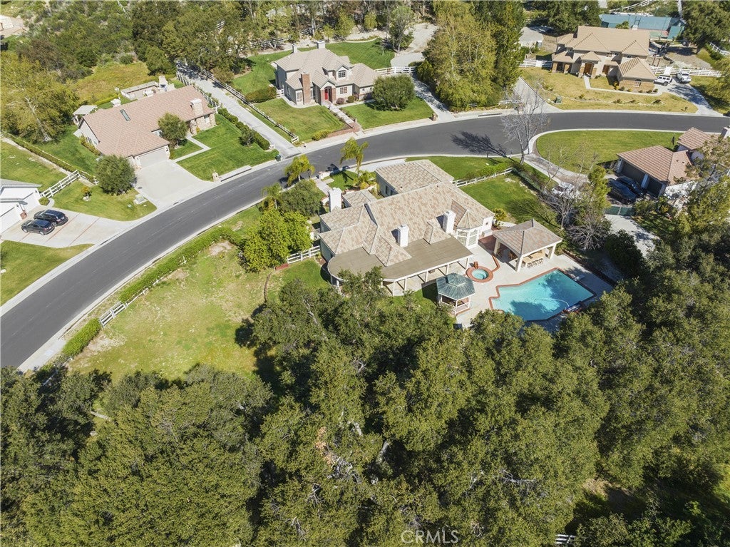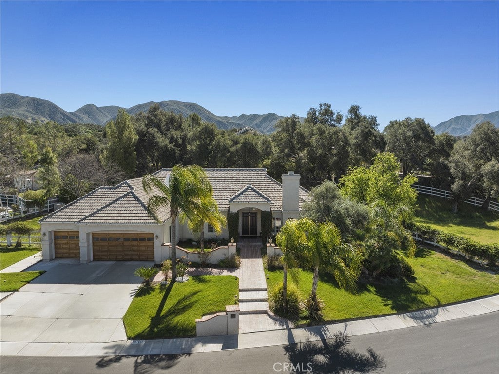 Welcome to one of the most desirable streets in all of Sand Canyon, located on a flat cul de sac within the sought after Crystal Springs Ranch community. Set on nearly one acre, this single story estate offers approximately 2,900 square feet with four bedrooms including a den that can easily function as a fourth bedroom, three full bathrooms, and a layout designed for both everyday living and entertaining. The home is filled with natural light and features high ceilings, wood floors, French doors, and three fireplaces that create a warm and inviting atmosphere. The refreshed kitchen serves as the heart of the home and has been thoughtfully arranged to create a spacious eat in gathering area, featuring stainless steel appliances, double ovens, granite countertops, a large center island with bar seating, a hammered copper farmhouse sink, bronze fixtures, and a charming breakfast nook with custom built in seating. The built in banquet seating includes hidden storage beneath the seats, adding both character and functionality. At the front of the home, the main living room offers an inviting space for relaxing or entertaining. Between two secondary bedrooms is a versatile flex space ideal for a study, work area, or lounge, with those bedrooms sharing a Jack and Jill bathroom, while the current den can easily function as a fourth bedroom and connects to a full bathroom, providing flexibility for guests, a home office, or multi generational living. The primary suite offers a retreat like setting with a door to the backyard and a spa inspired bathroom featuring custom cabinetry, elegant vanities, glass block details, a handcrafted hammered copper soaking tub, and a hidden walk in closet. The backyard creates a private entertainer’s setting with a sparkling pool and spa, full outdoor kitchen with built in barbecue and sink, permanent gazebo, and a large wraparound covered patio with ceiling fans that stretches nearly the length of the home, surrounded by mature oak trees and natural surroundings. Additional features include a three car garage, indoor laundry room, and space for potential RV parking. Crystal Springs Ranch offers a peaceful setting with a low HOA of approximately $150 per year and no Mello Roos while still being just minutes from shopping, dining, and freeway access in Santa Clarita.